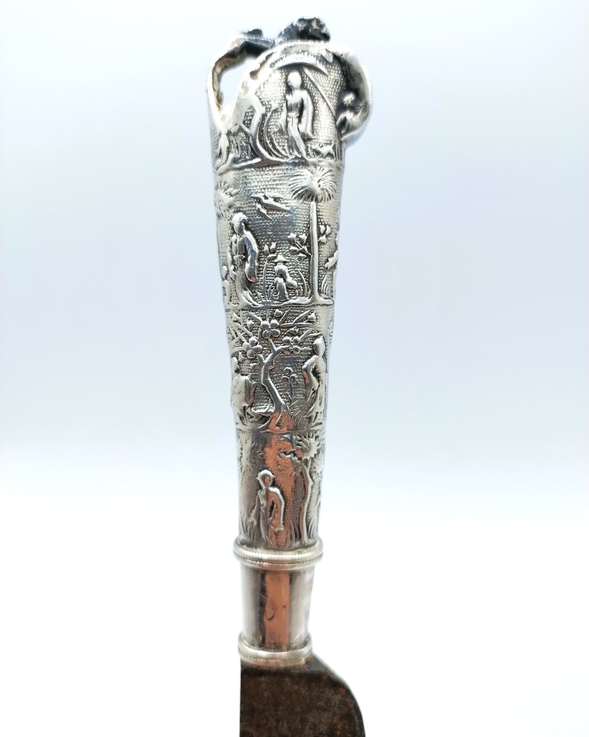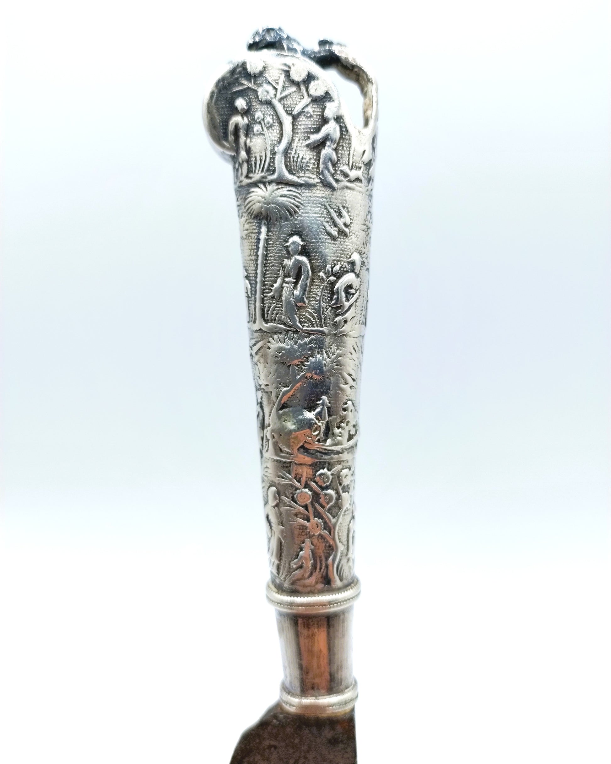 18e Eeuws zilveren mesheft met stalen lemmet. Gekroond met een hondje als teken van trouw.