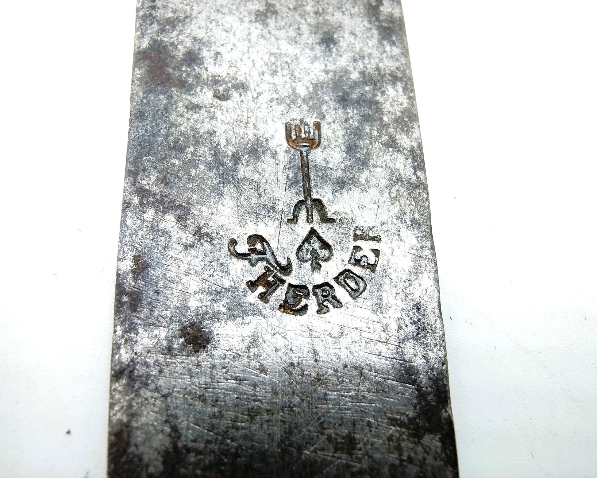 Het stalen lemmet is origineel en behoort bij het mesheft. Deze is gekeurd met F. Herder.