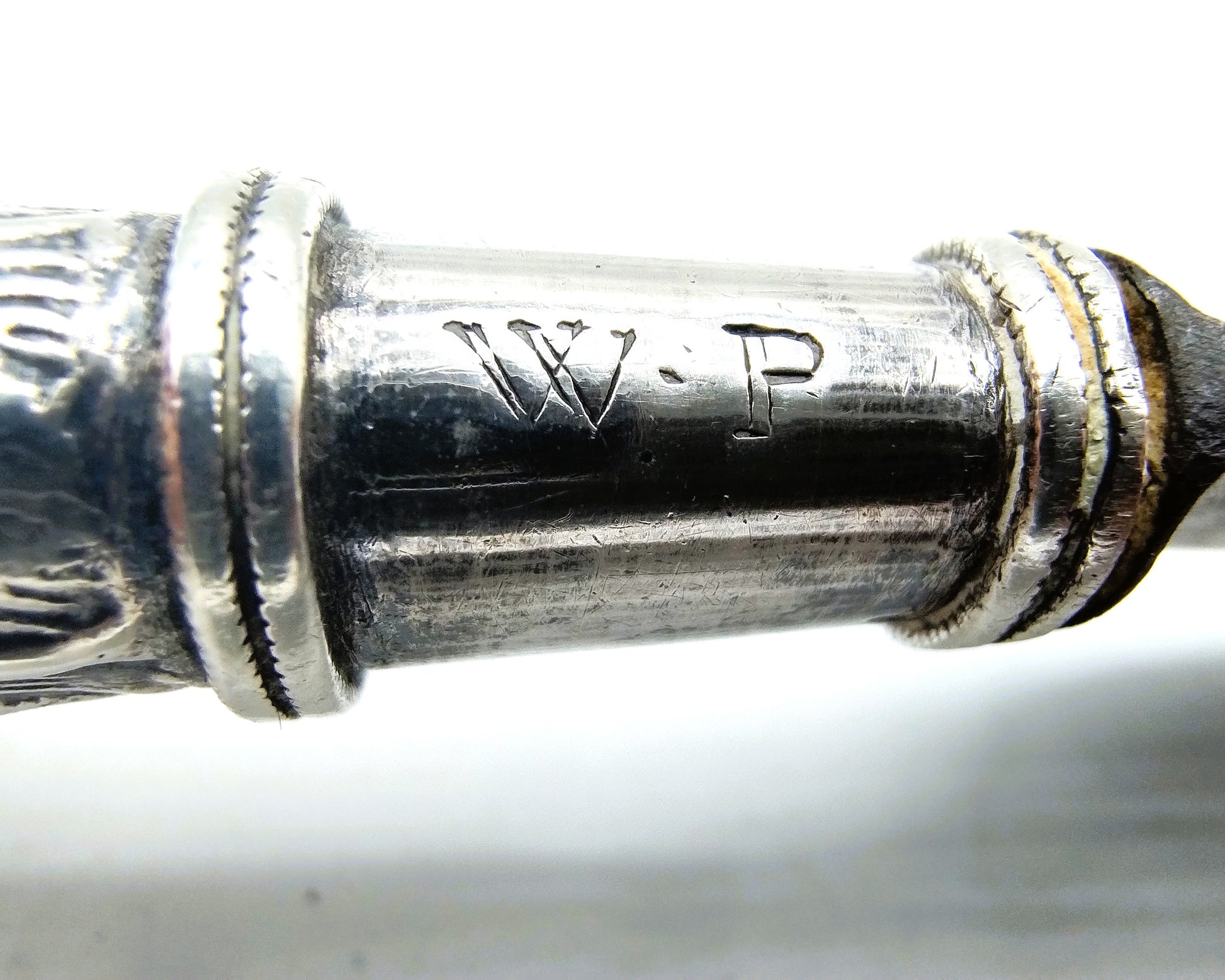 Het mesheft is gekeurd met een sleets geworden meesterkeur. Het mesheft heeft als inscriptie de initialen WP.
