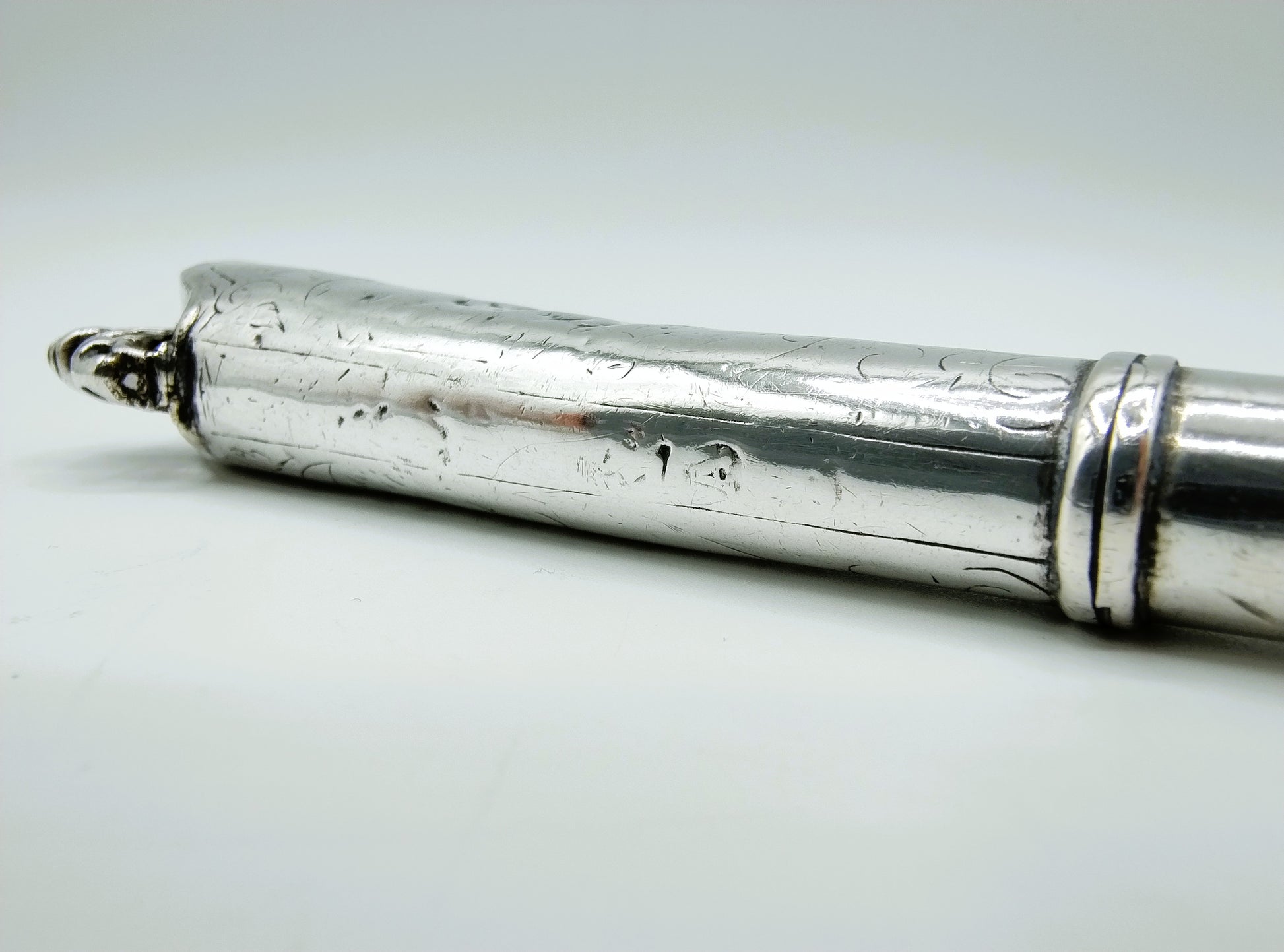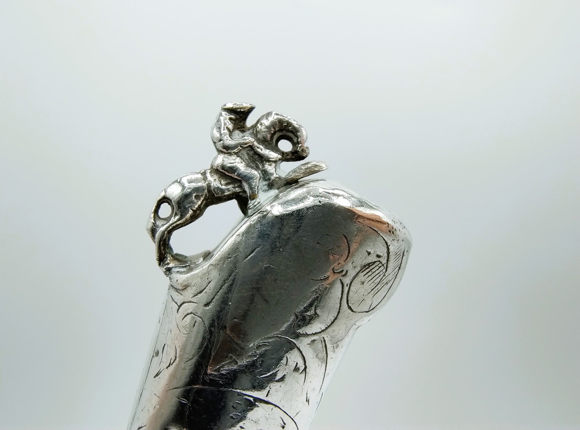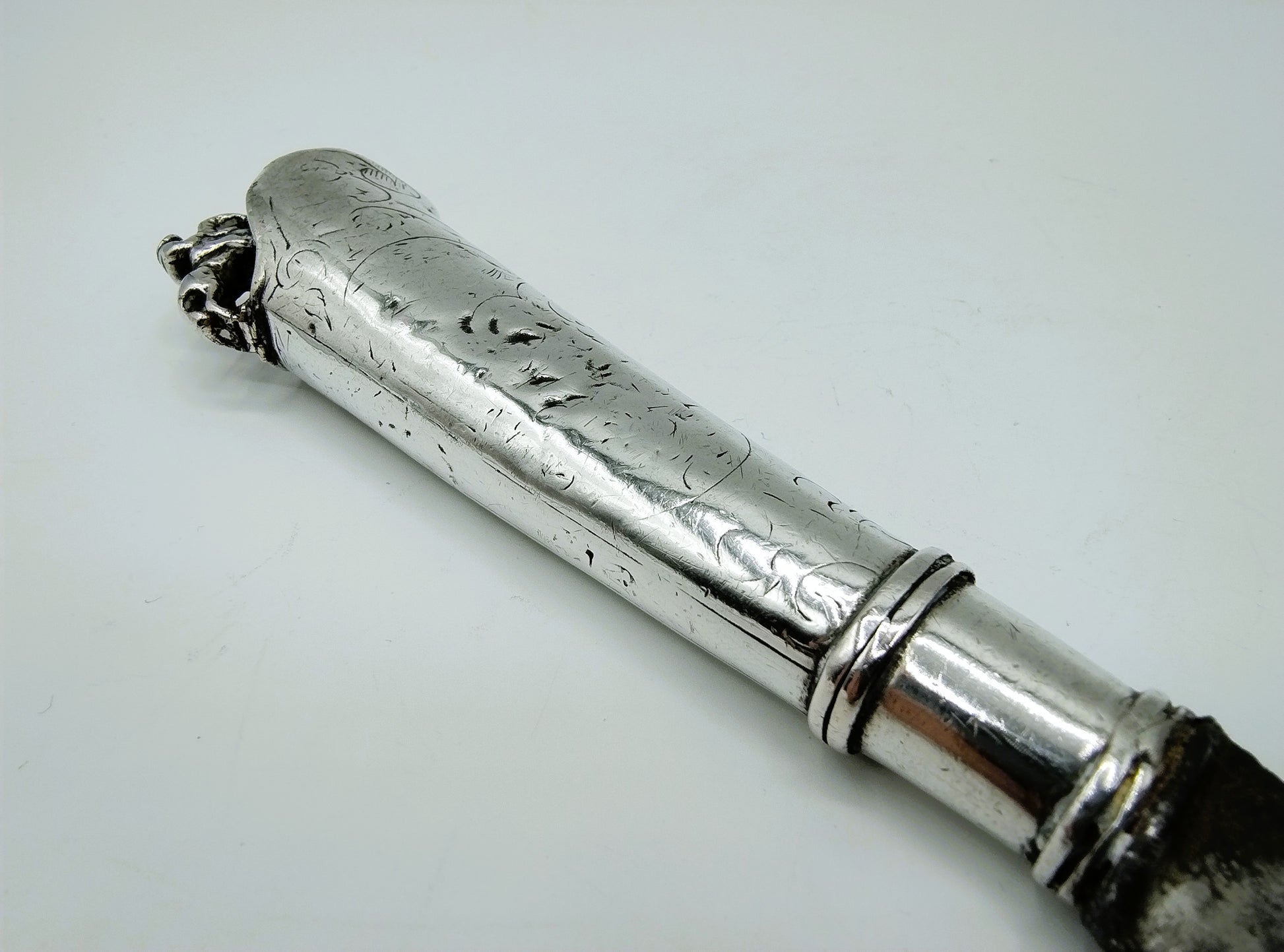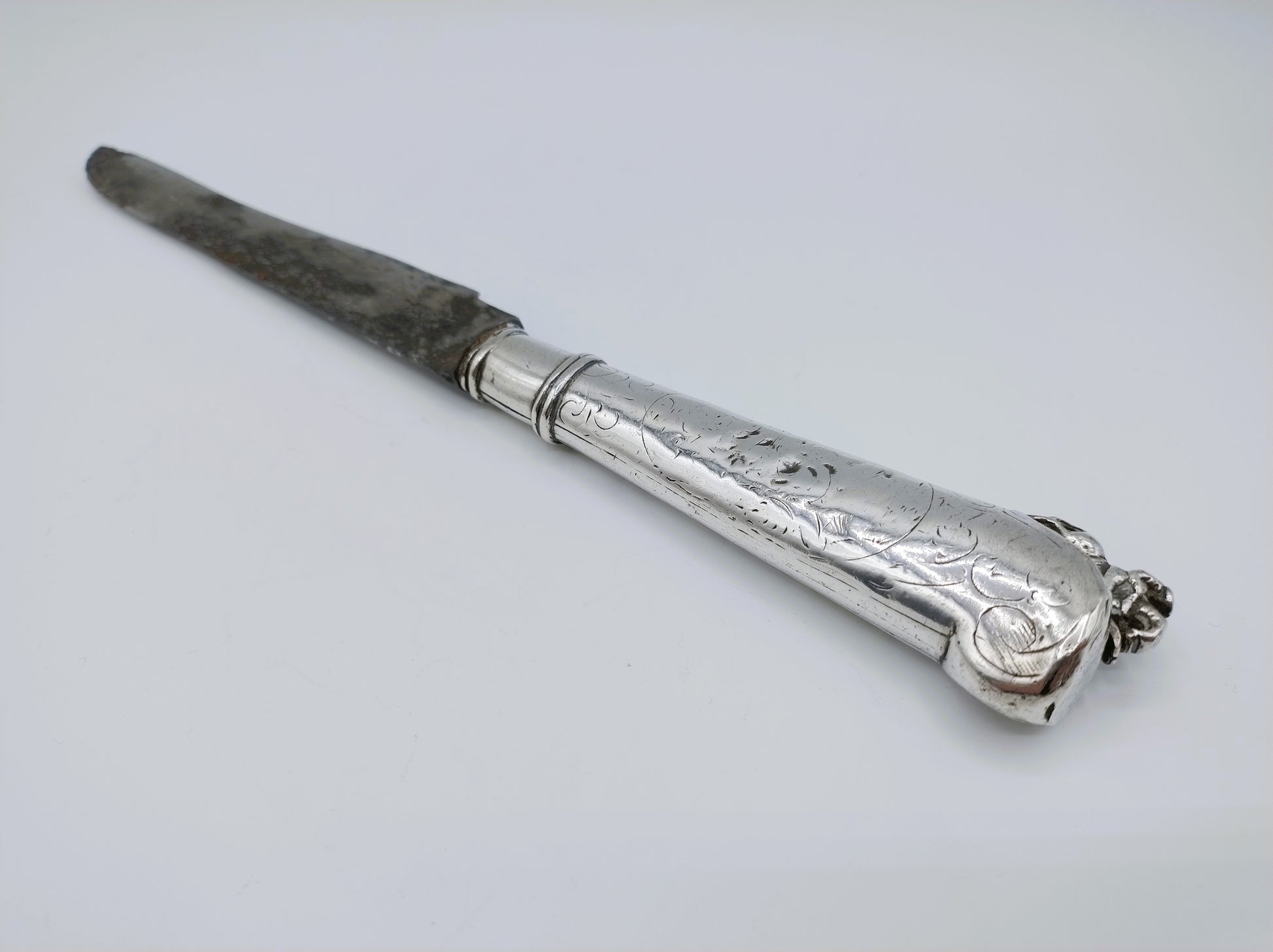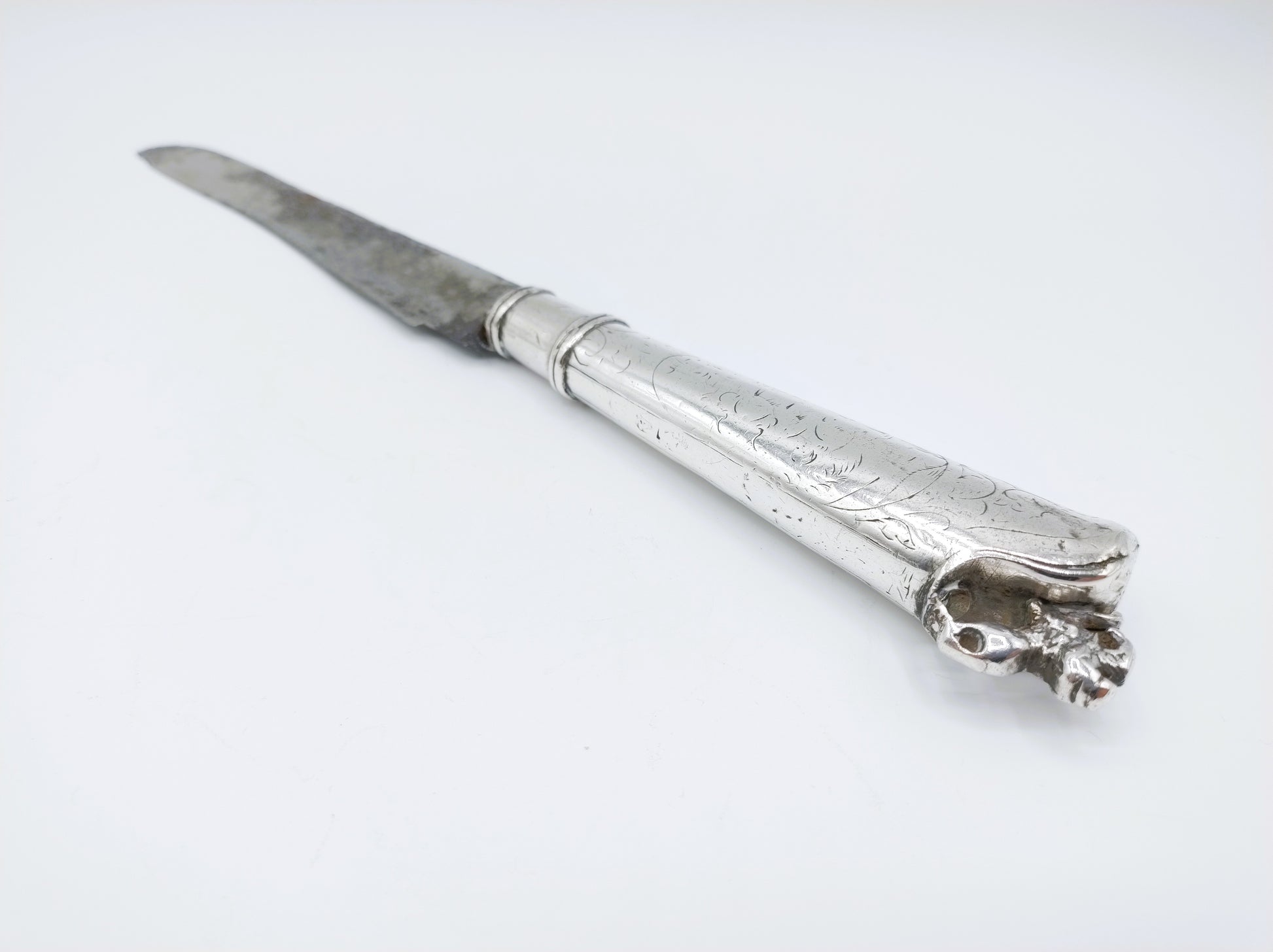 18e Eeuws zilveren mesheft met stalen lemmet. Gekroond met een ruiter te paard.