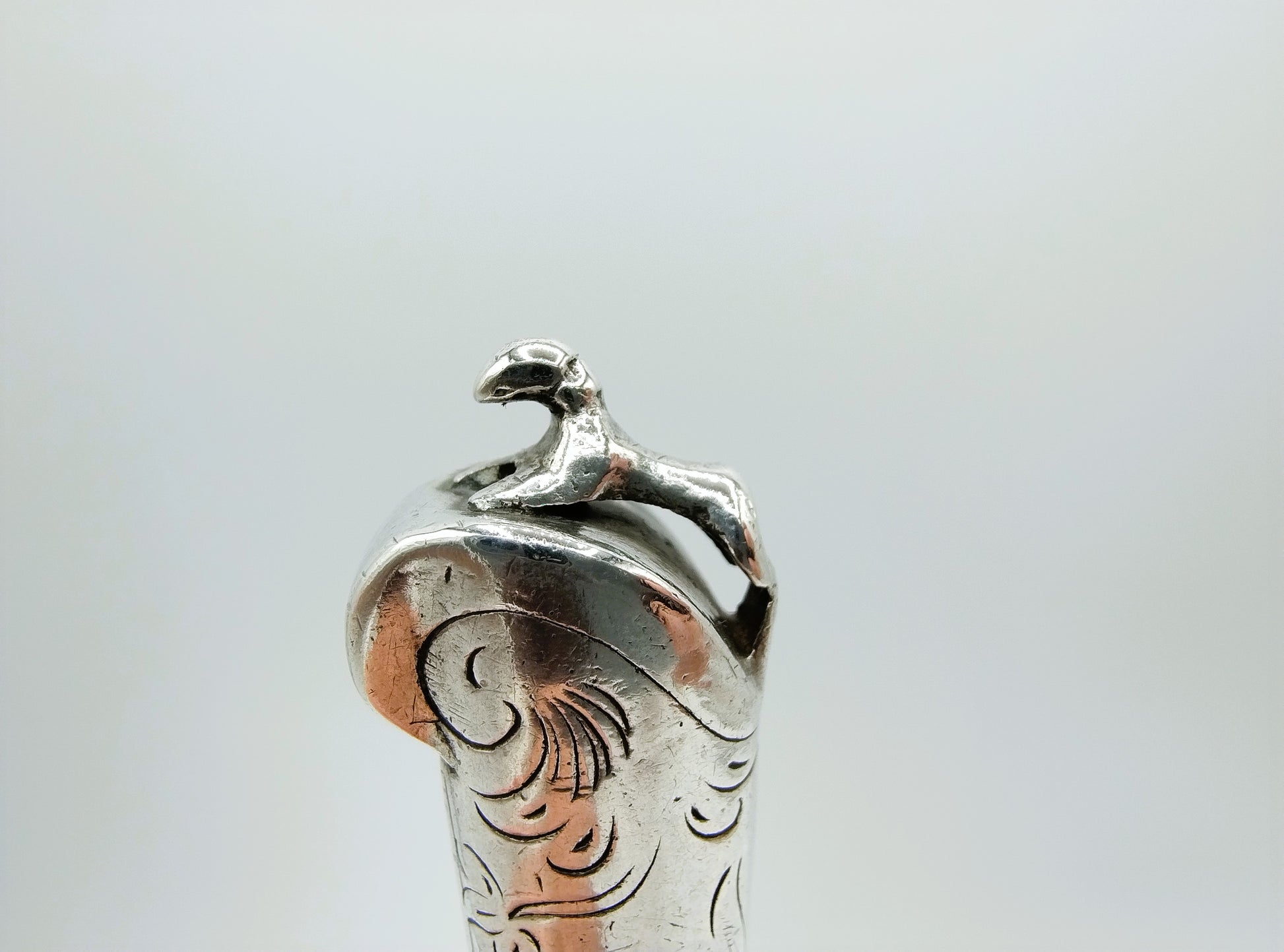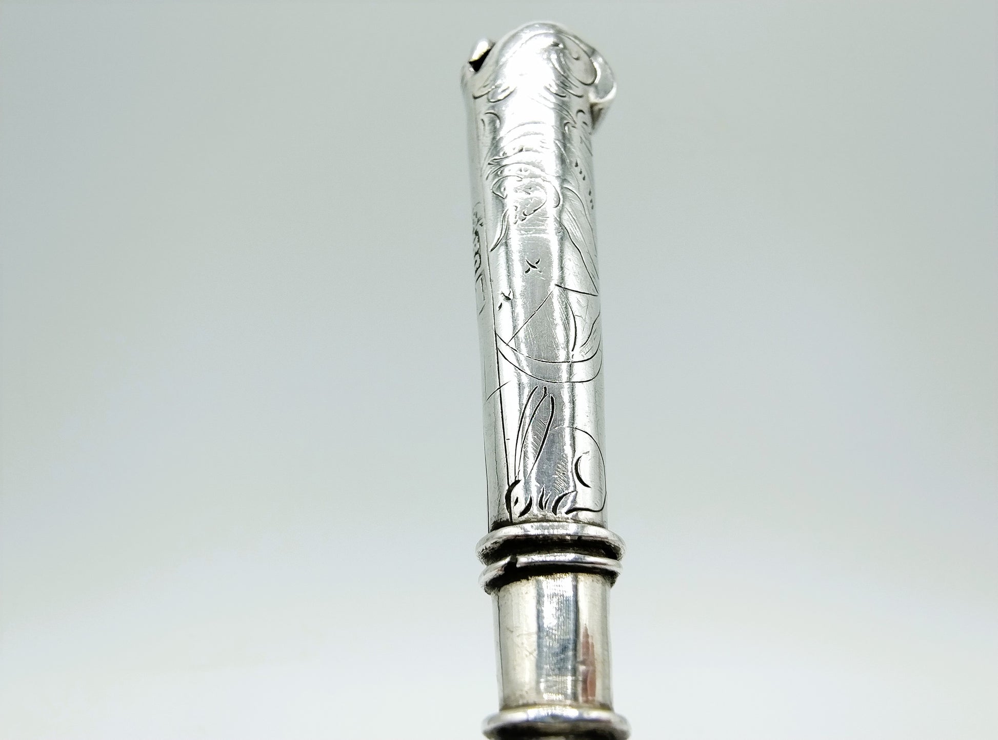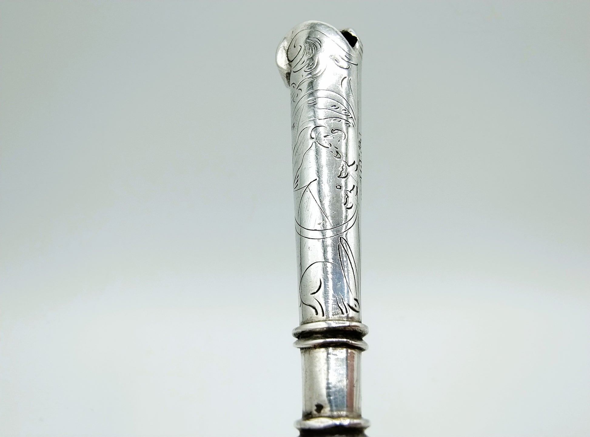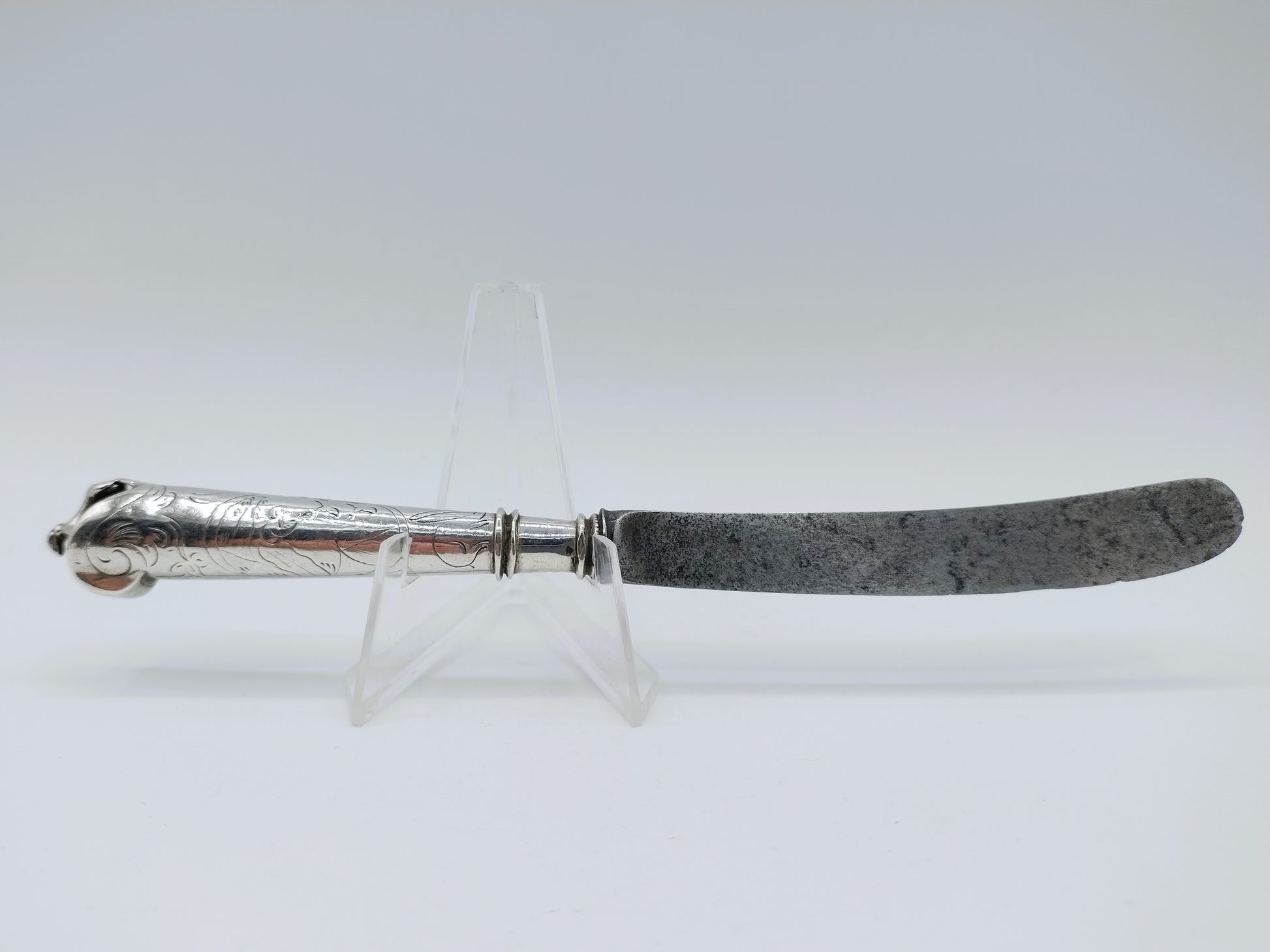 18e Eeuws mes met een zilveren heft. Het heft heeft als bekroning een hondje (teken van trouw).
