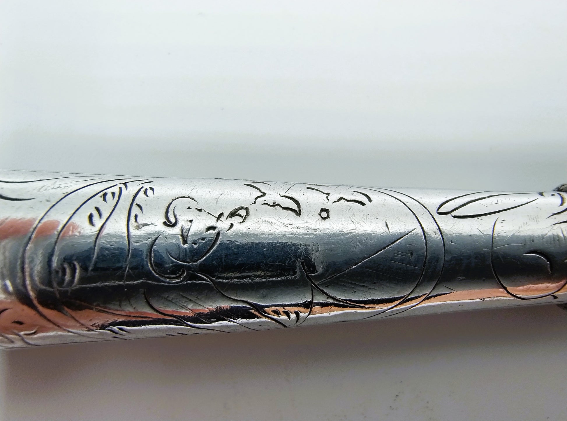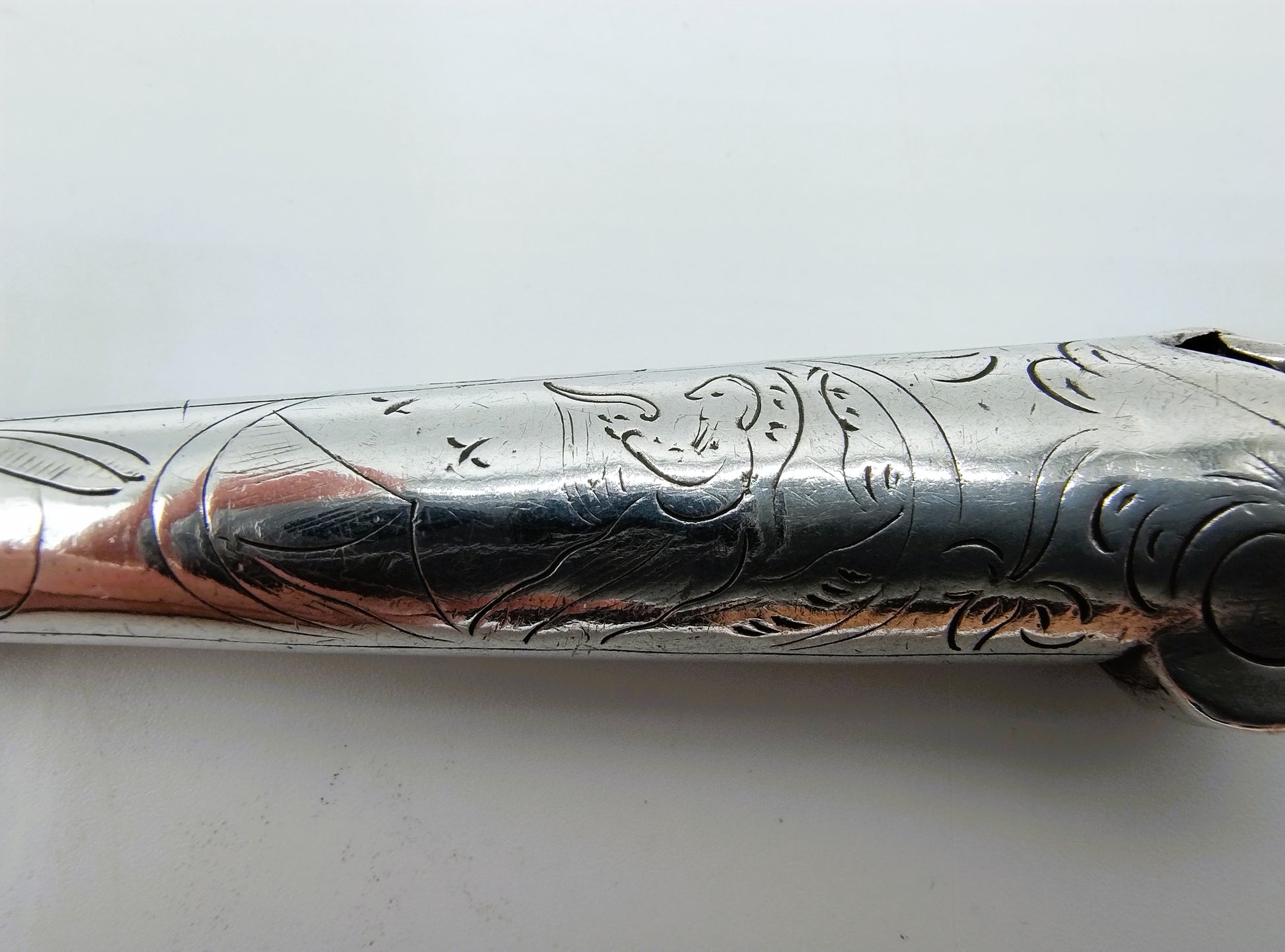 Het heft is voorzien van twee Bijbelse afbeeldingen. David die op zijn harp speelt en Elia die door de raven gevoed wordt.