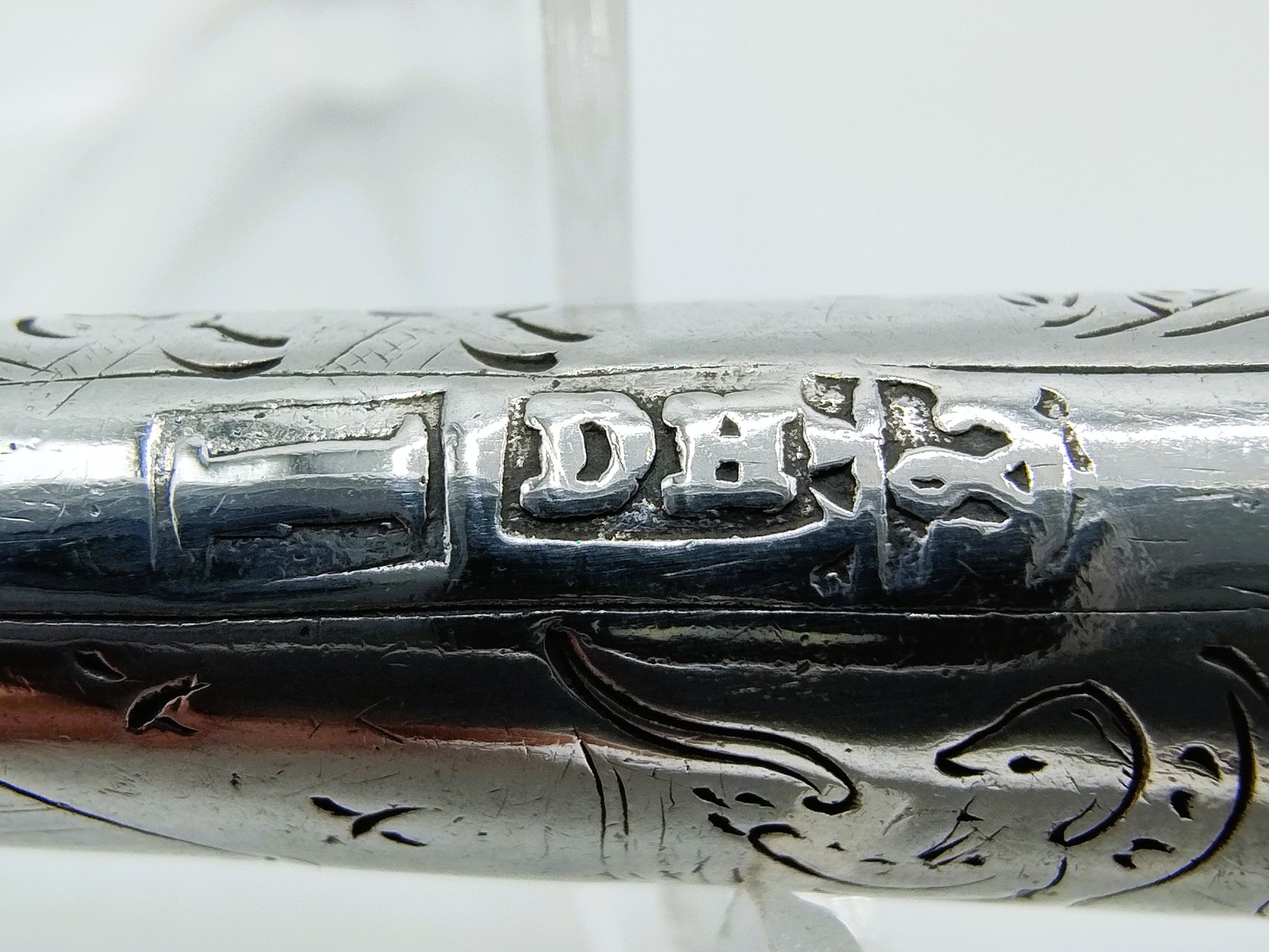 Het heft is gekeurd met meesterteken DH, Jaarletter I voor 1769 en stadskeur van Hoorn.