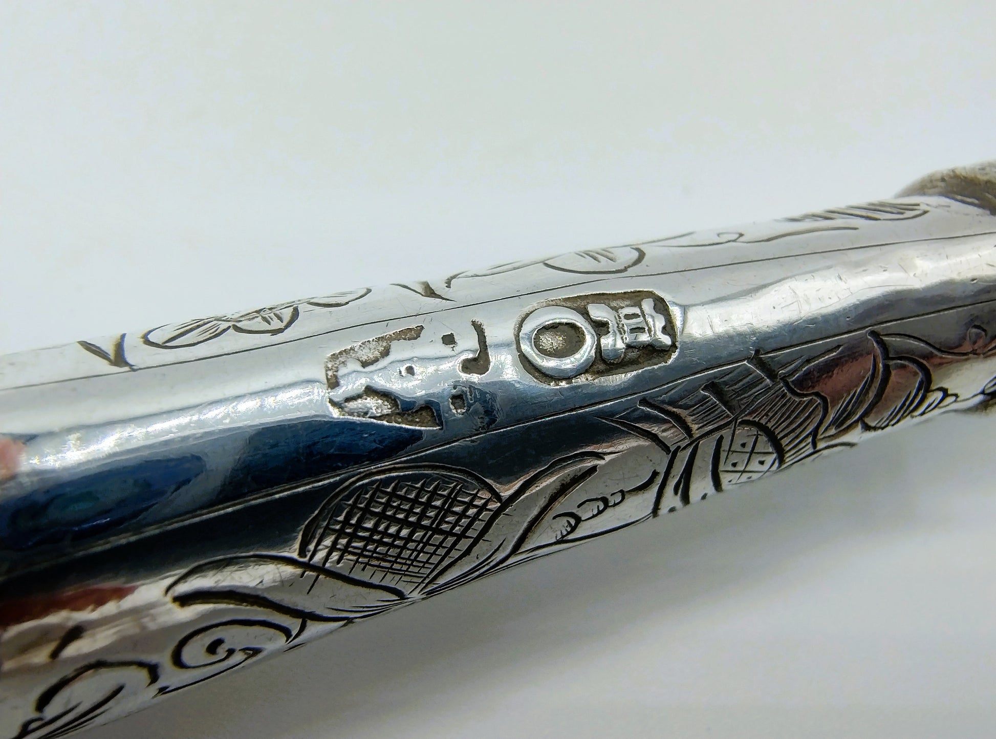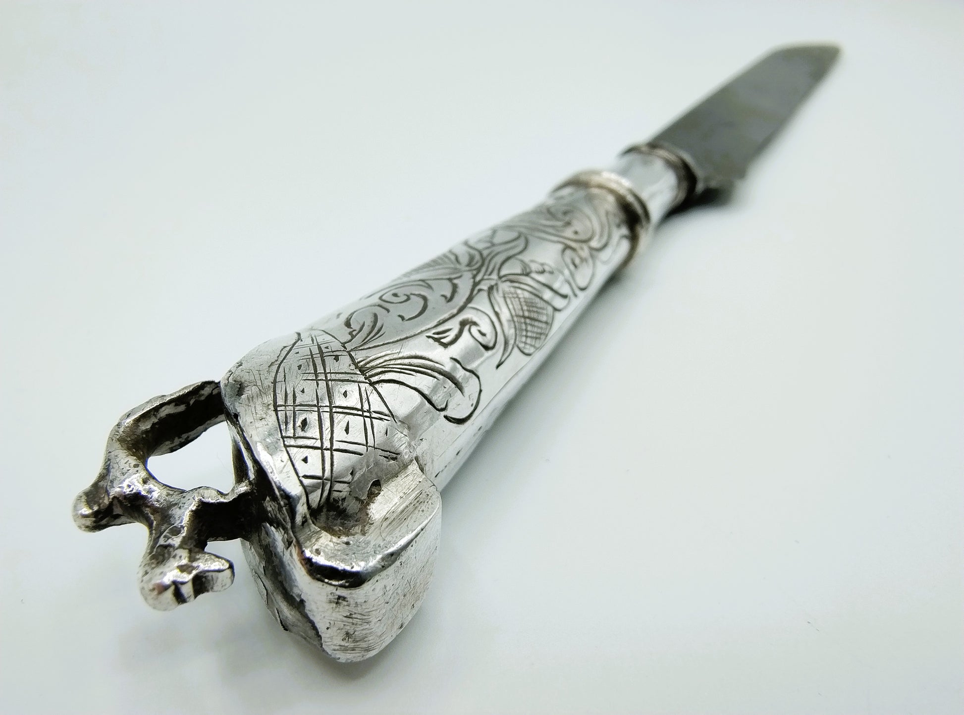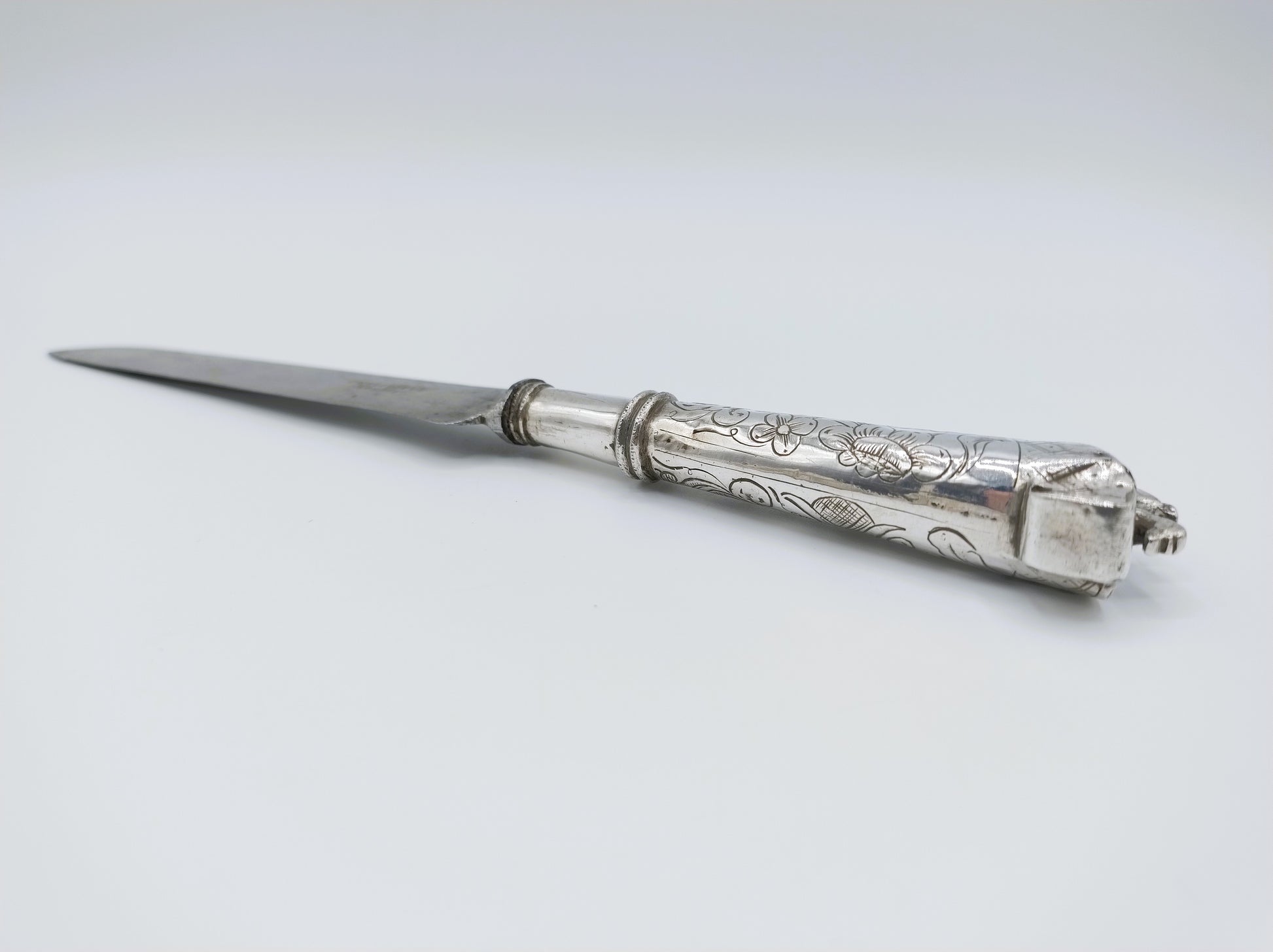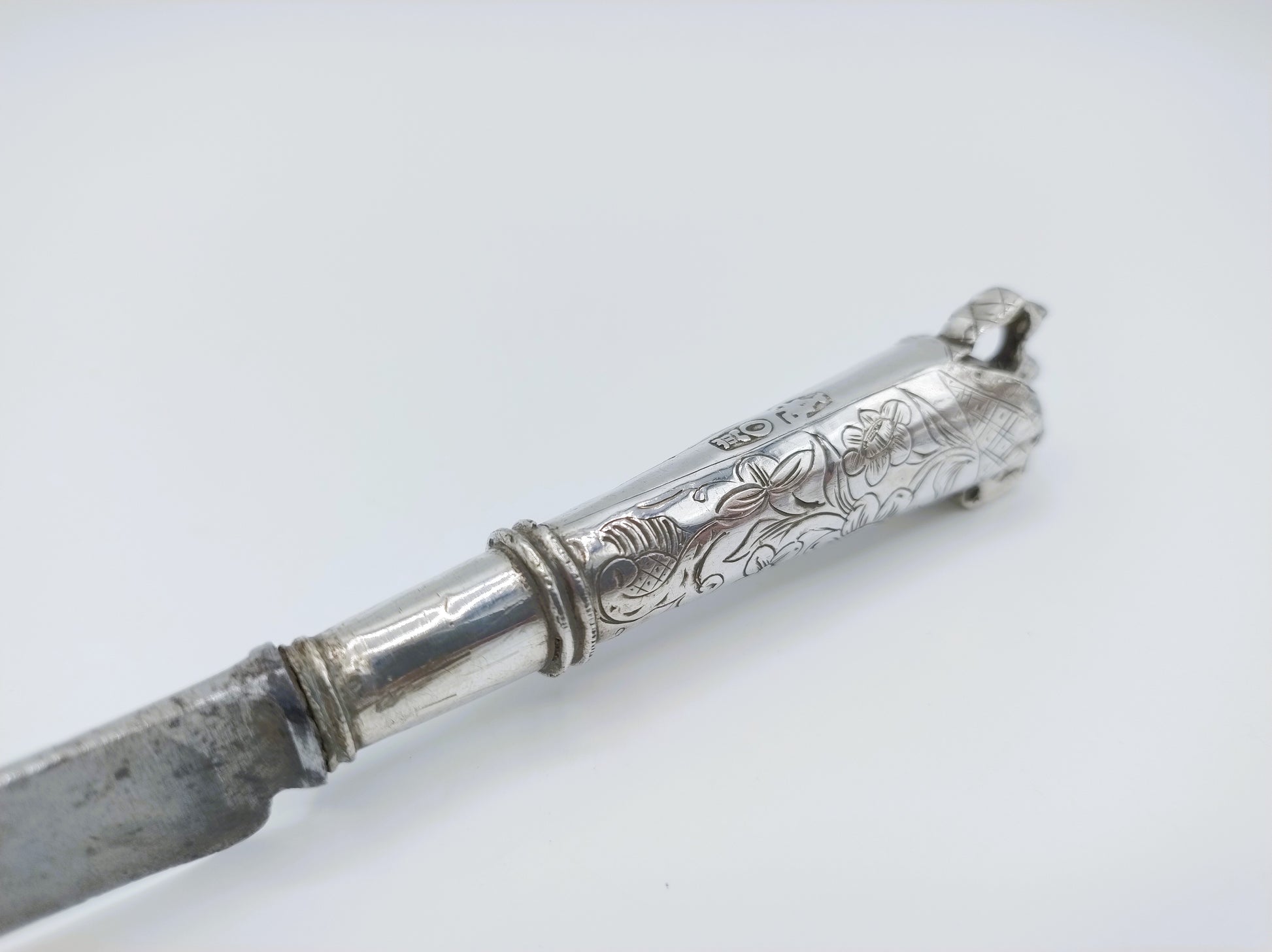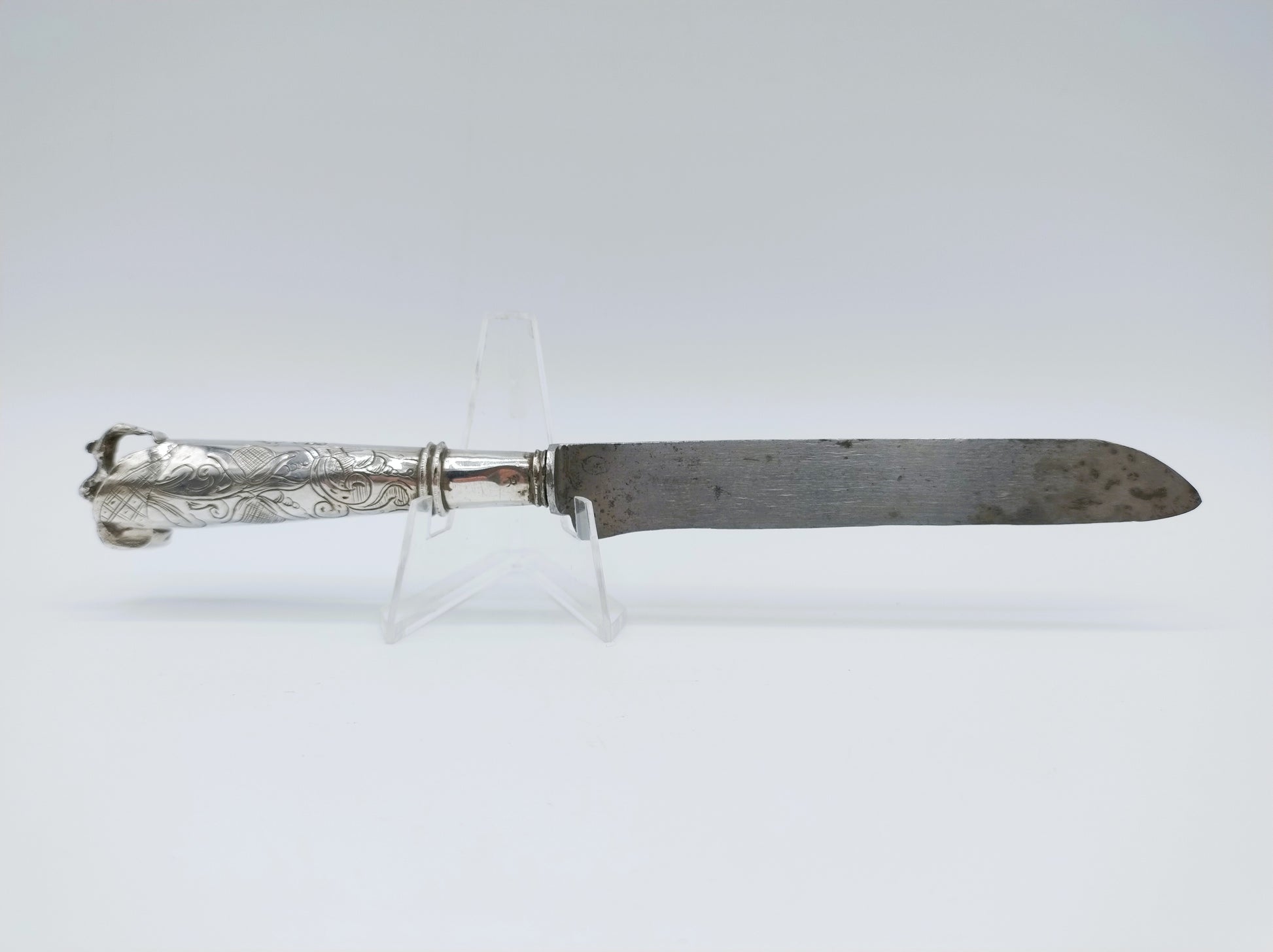 18e Eeuws mes met een zilveren heft. Het mes is gemaakt door Jacobus Kuyper (de Bree 317) werkzaam vanaf 1731.