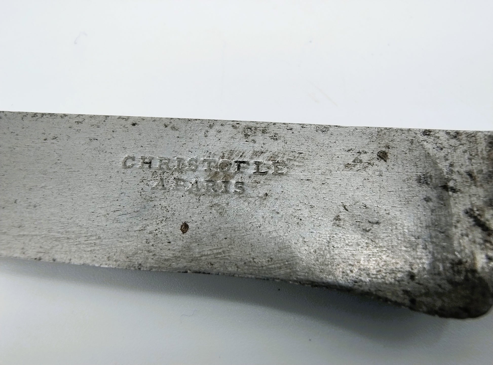 Het meesterteken is een kuipershamer, het mesheft is tevens gekeurd met het stadskeur van Middelburg en de jaarletter O voor 1750.