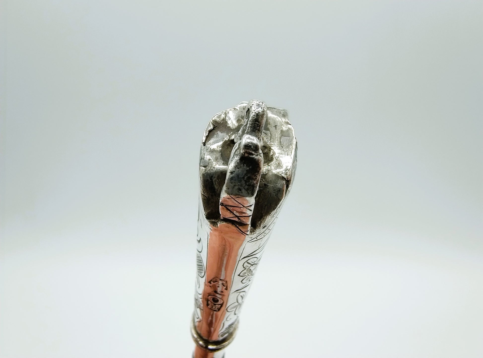 Het heft heeft als bekroning een hondje (teken van trouw) en is voorzien van een floraal decor.