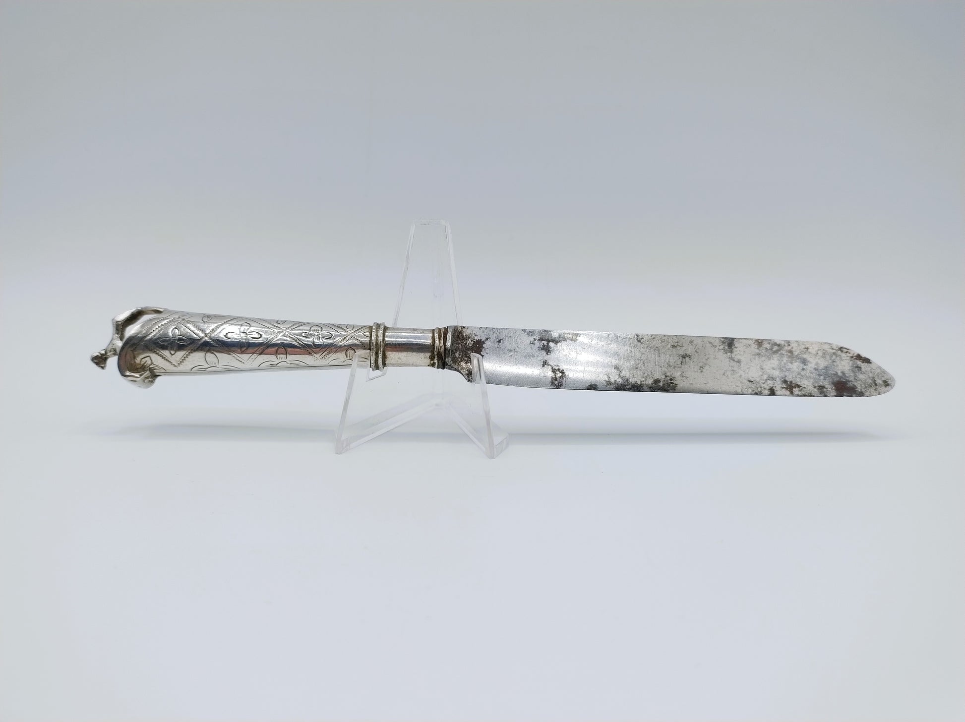 18e Eeuws mes met een zilveren heft. Het heft heeft als bekroning een hondje (teken van trouw).