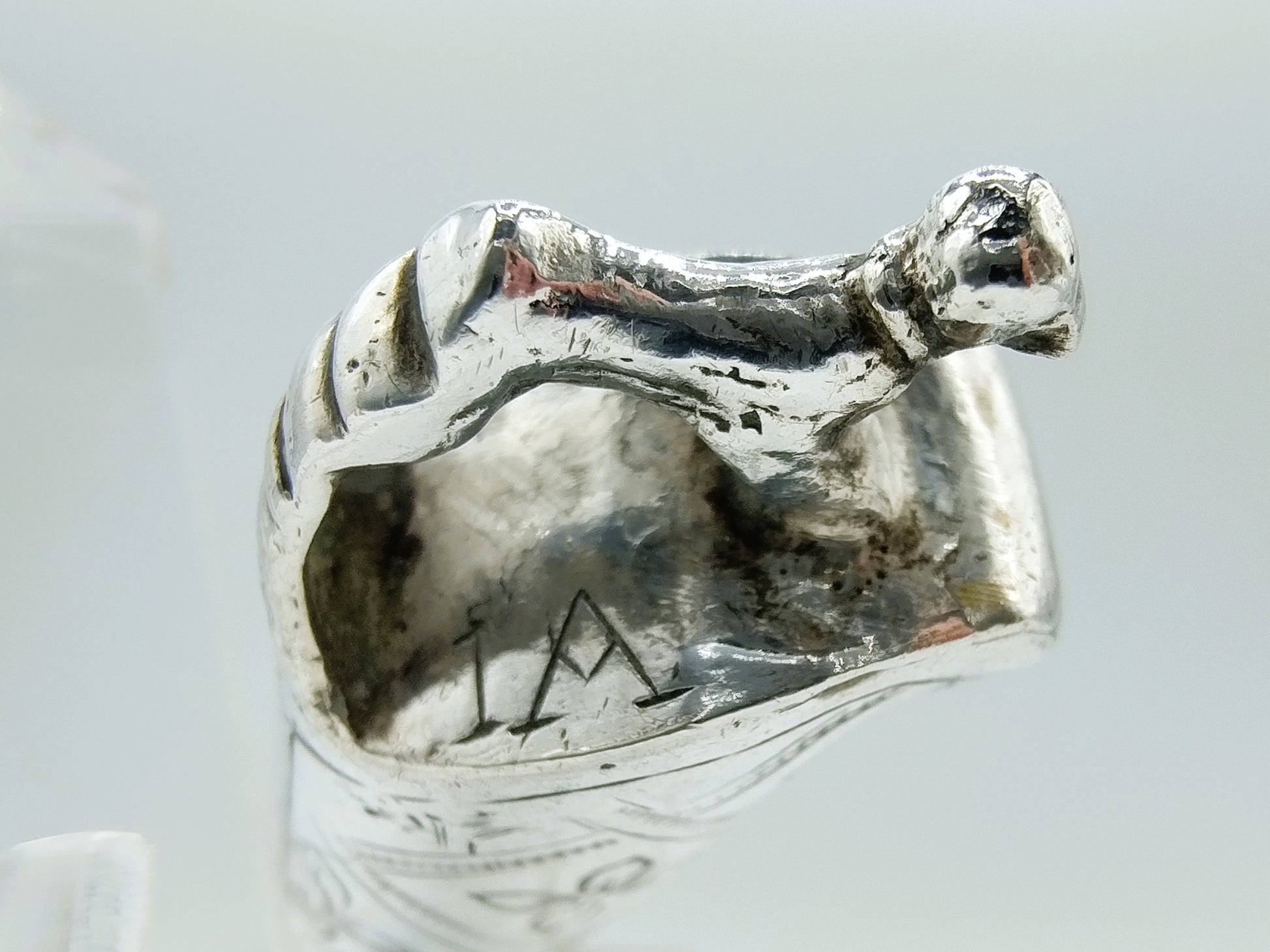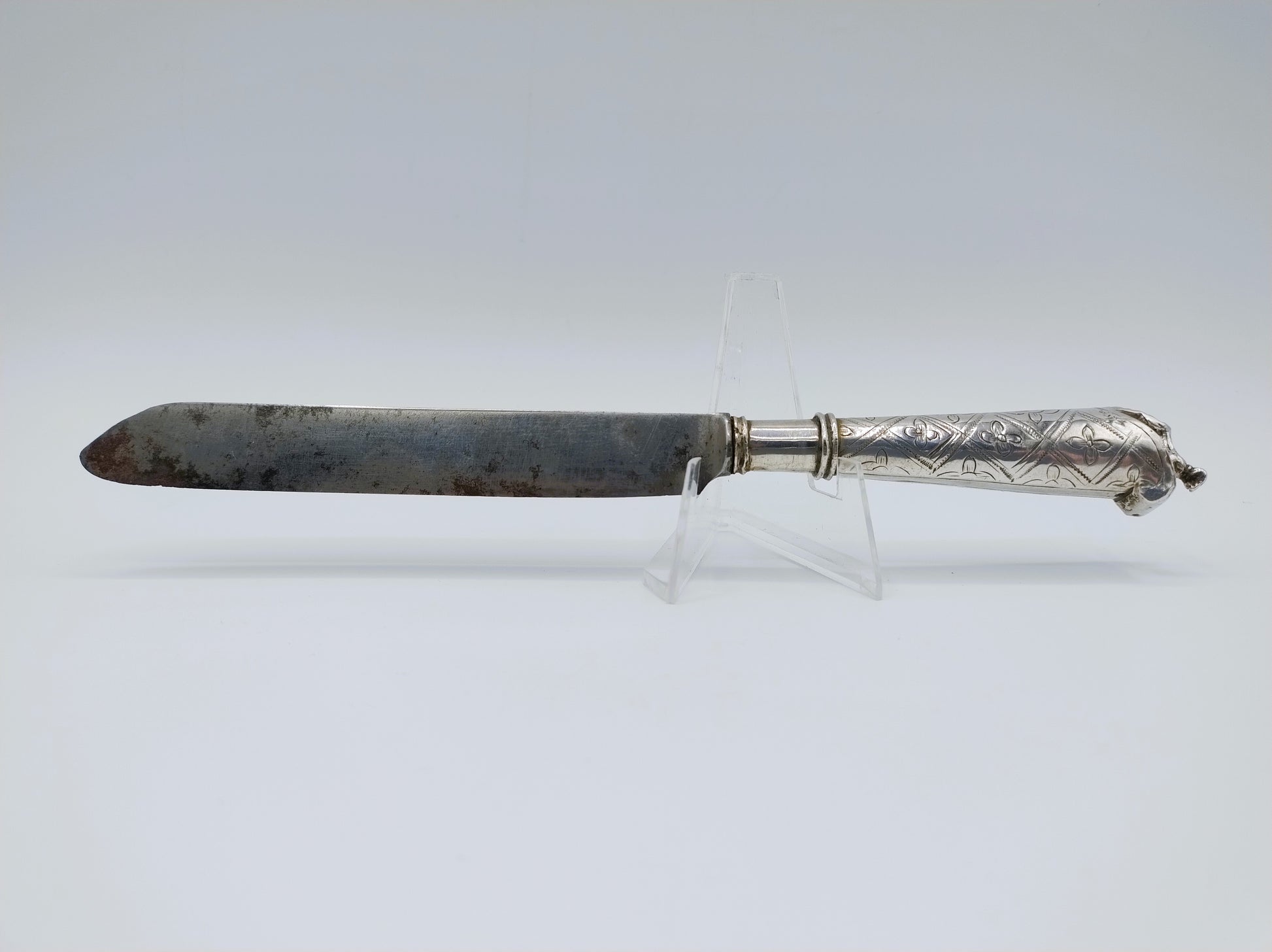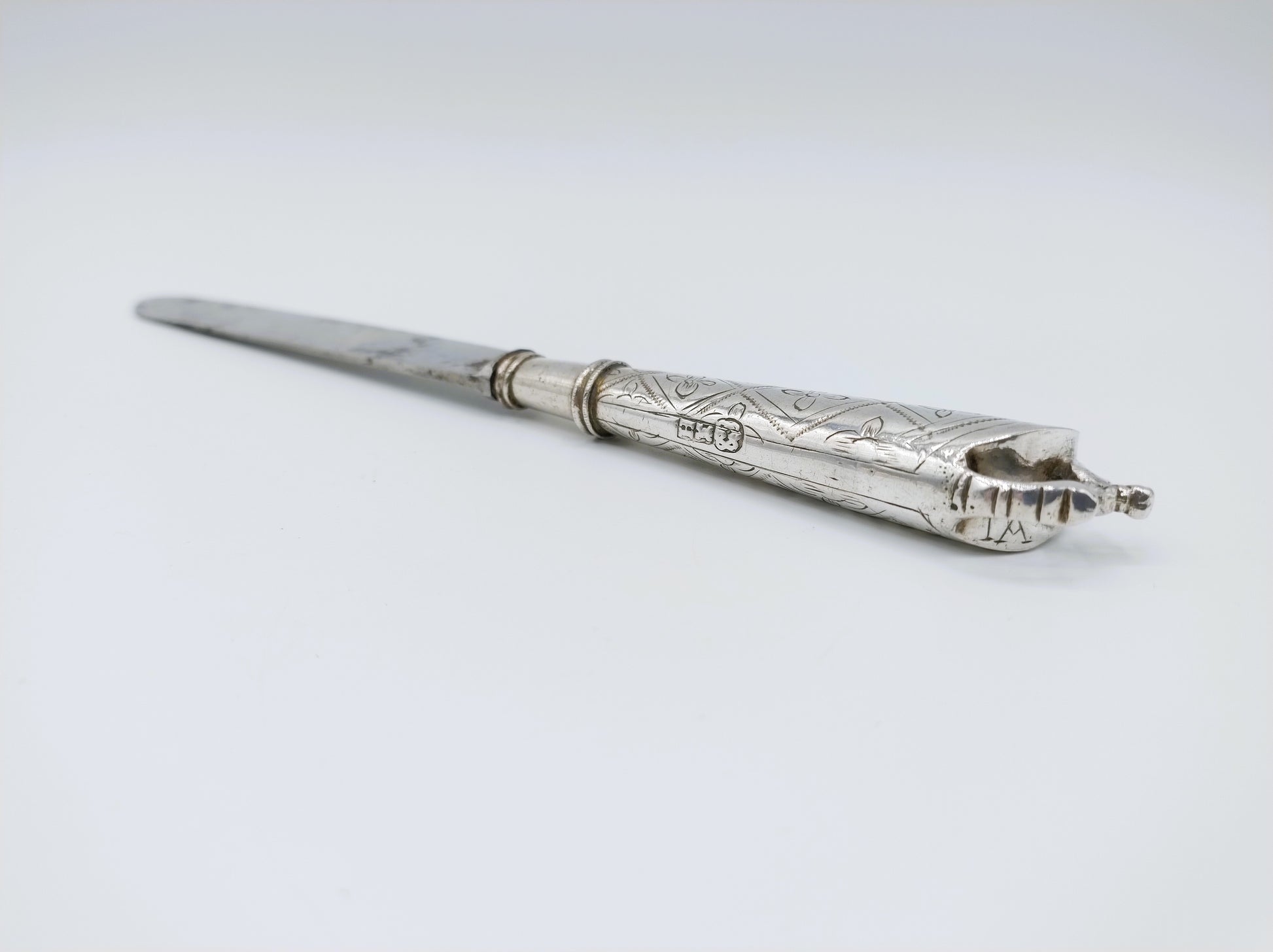 Het meesterteken is een slotplaat. Dit werd gebruikt door een onbekende zilversmid tussen 1765 en 1790. (J. de Bree, 628). Het mesheft is tevens gekeurd met het stadskeur van Middelburg en de jaarletter H voor 1771.