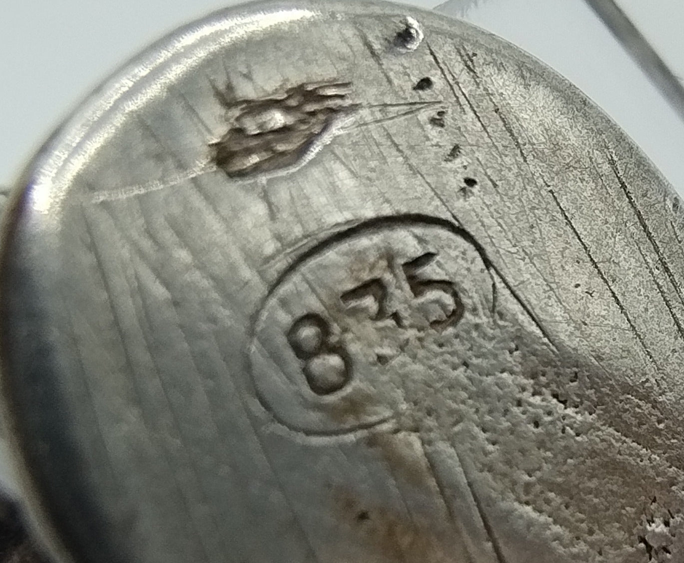 De miniatuur is gekeurd met 835 voor tweede gehalte zilver en een onduidelijk meesterkeur.