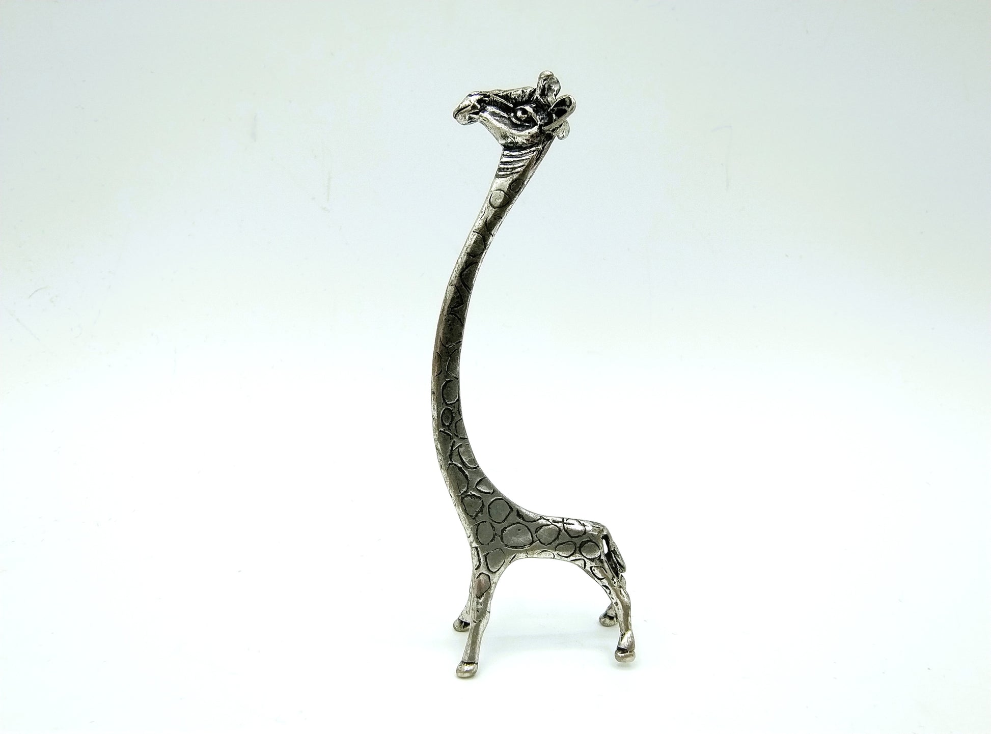 Zilveren miniatuur van een giraffe gemaakt door de F.lli Tortoli snc di Daniele Tortoli e C. uit Laterina. (Italië)