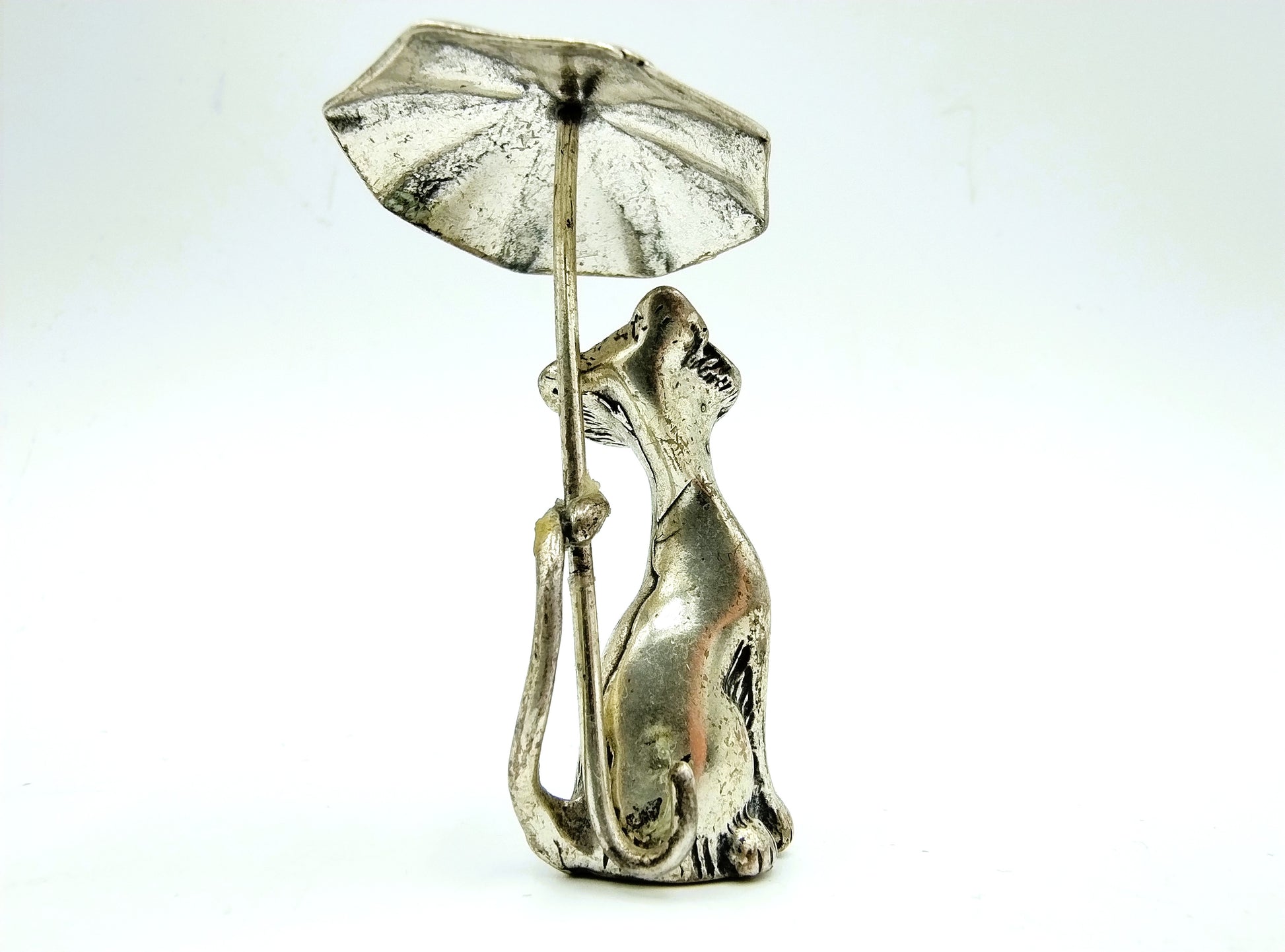Zilveren miniatuur van een kat onder een paraplu gemaakt in Arezzo. (Italië)