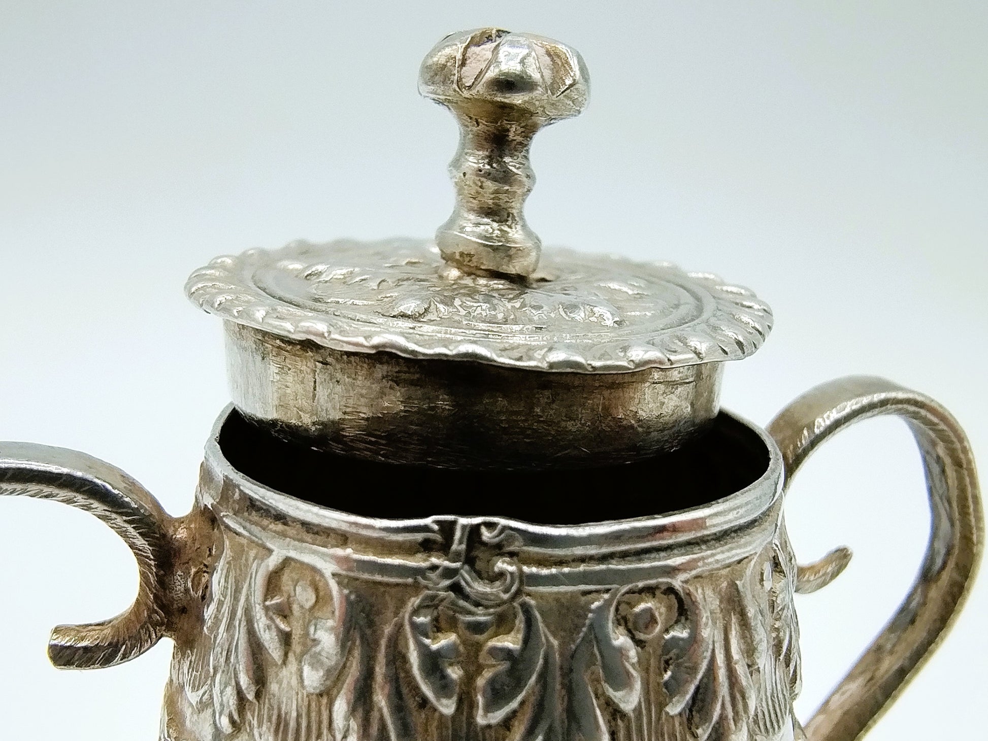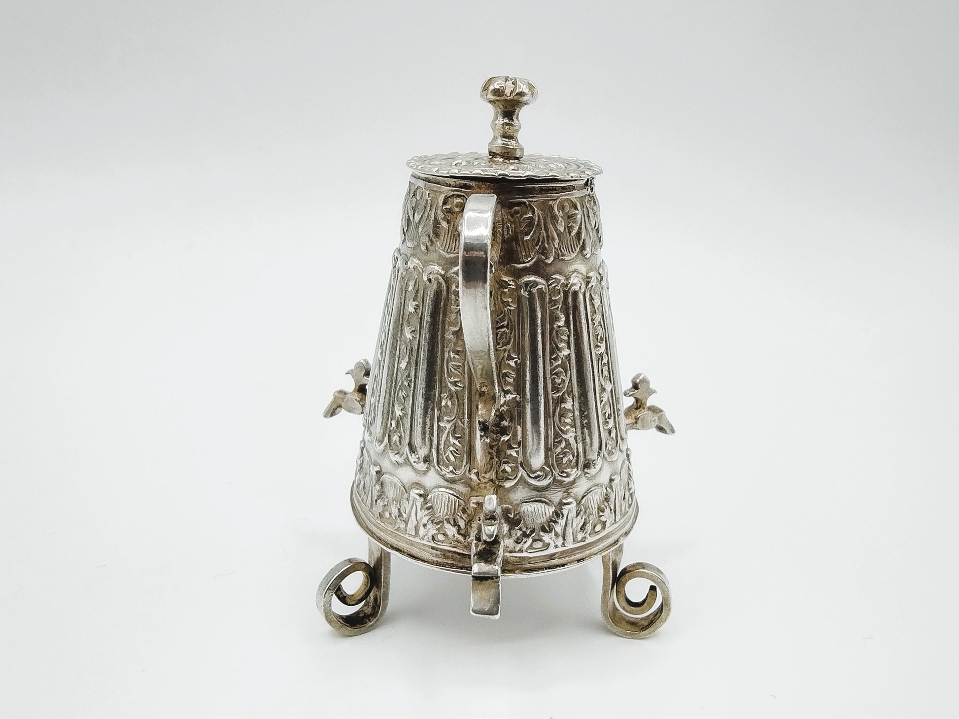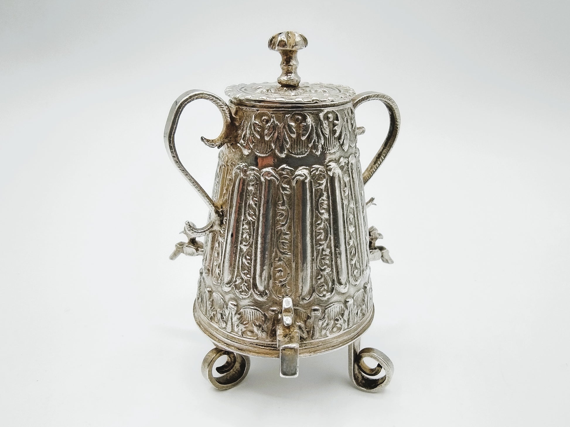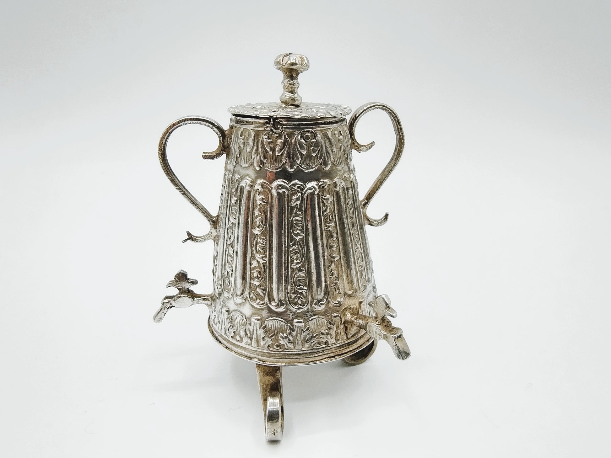 Zilveren miniatuur koffiekan met 3 kranen. Gemaakt door een onbekende meestersmid uit Amsterdam werkzaam rond 1725 (Citroen 970)