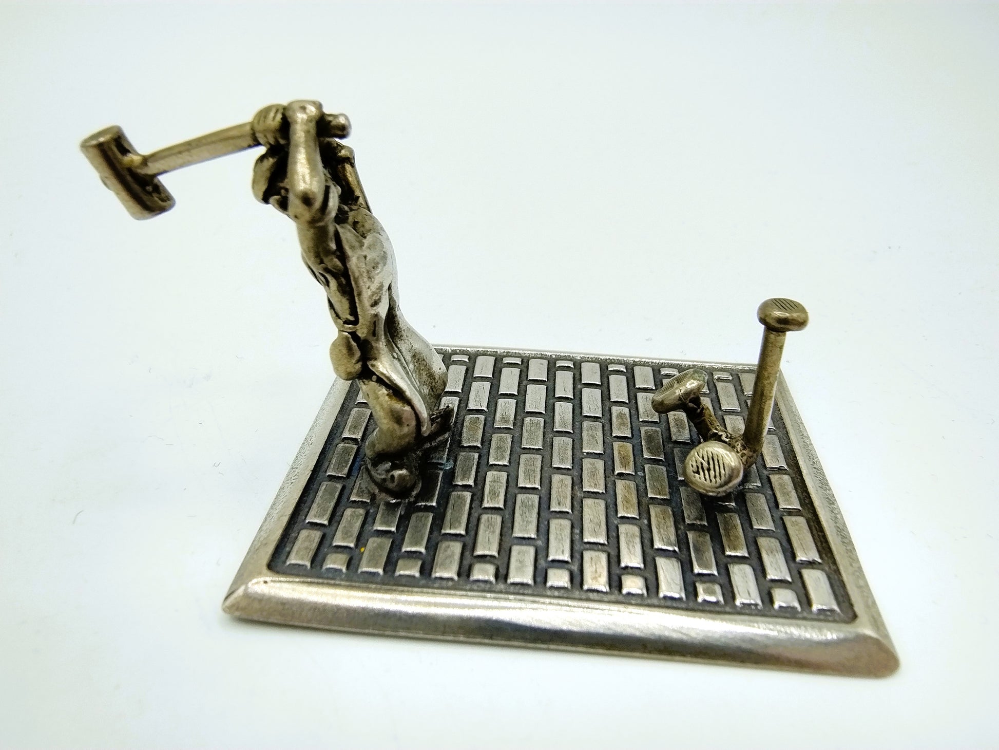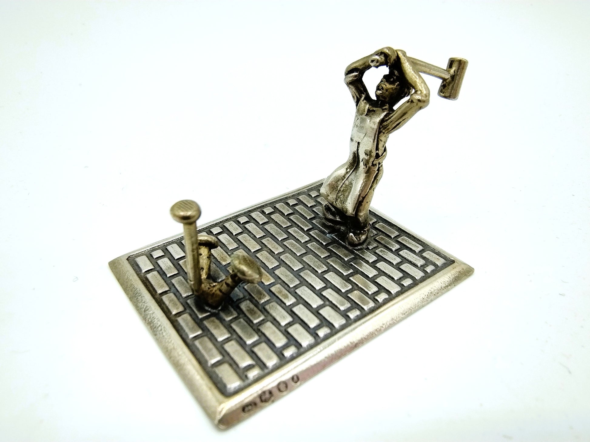 Nederlands zilveren miniatuur van een man met een hamer gemaakt door Cor Kuijf uit Schoonhoven. Cor Kuijf werkt al meer dan 60 jaar als goud- en zilversmid. Hij is op dit moment 1 van de laatste filigrain specialisten in Nederland..
