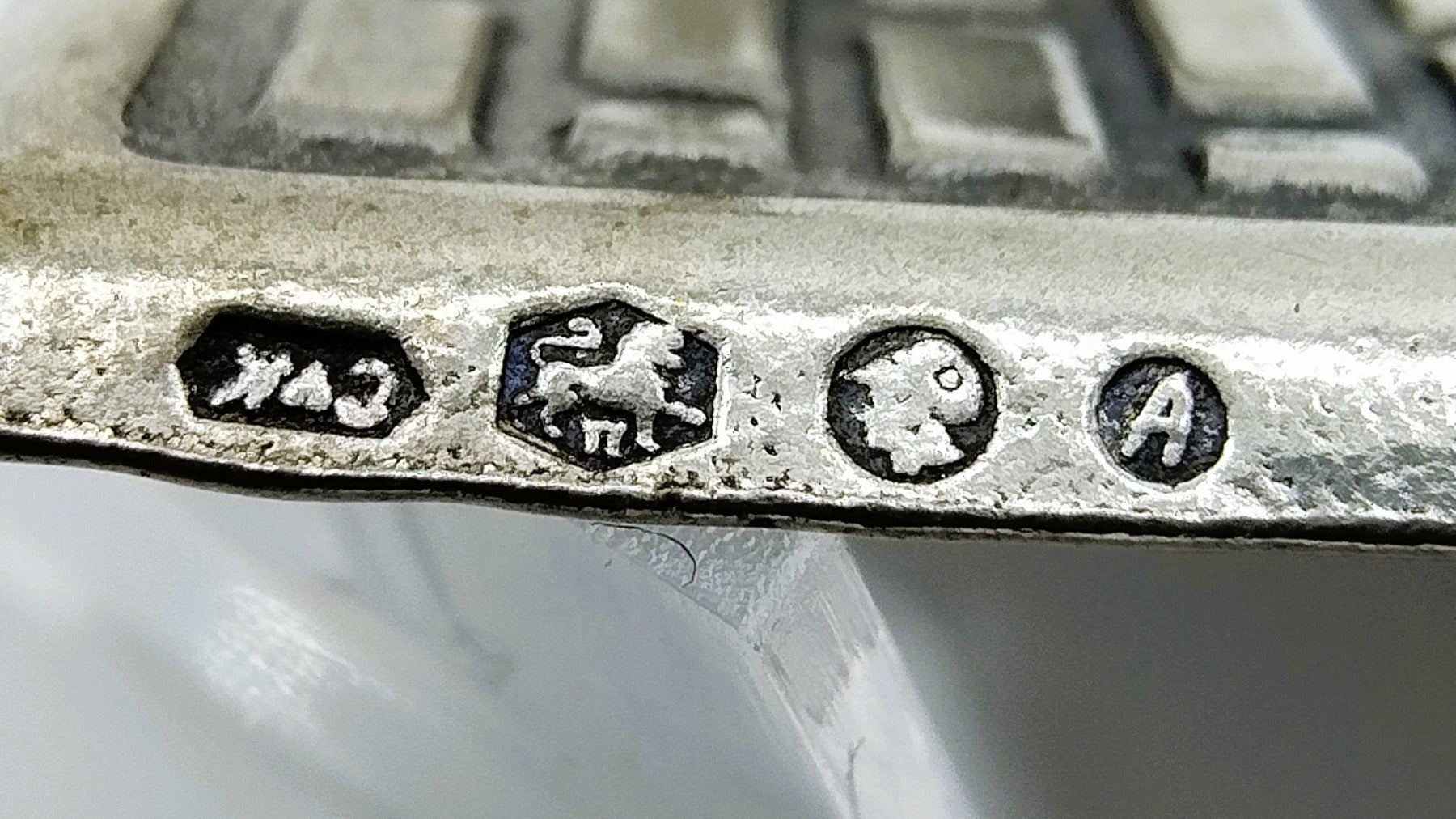 Gekeurd met meesterteken CvK, 2e gehalte keur, jaarletter A voor 1985 en minervakopje D voor Rotterdam.