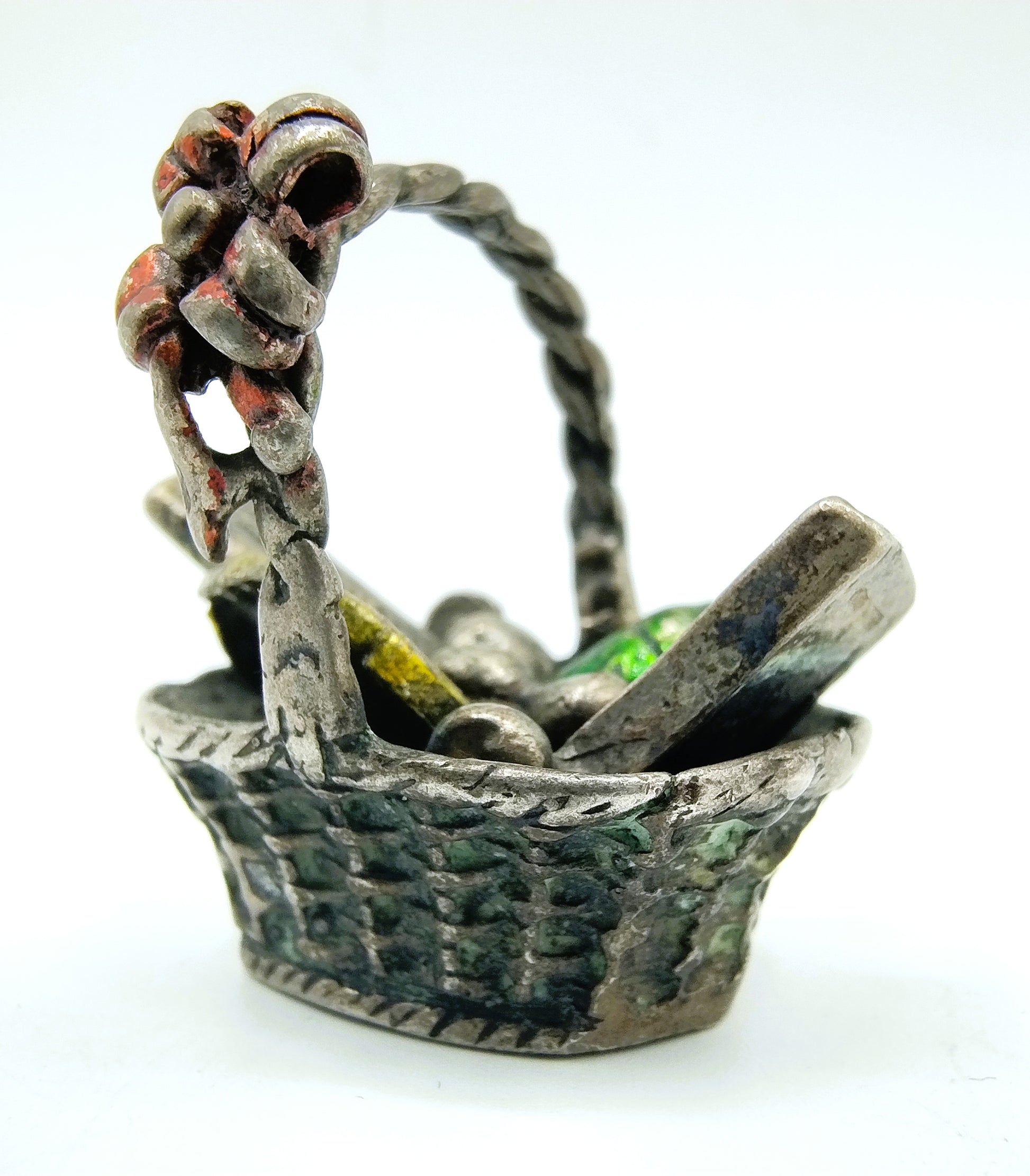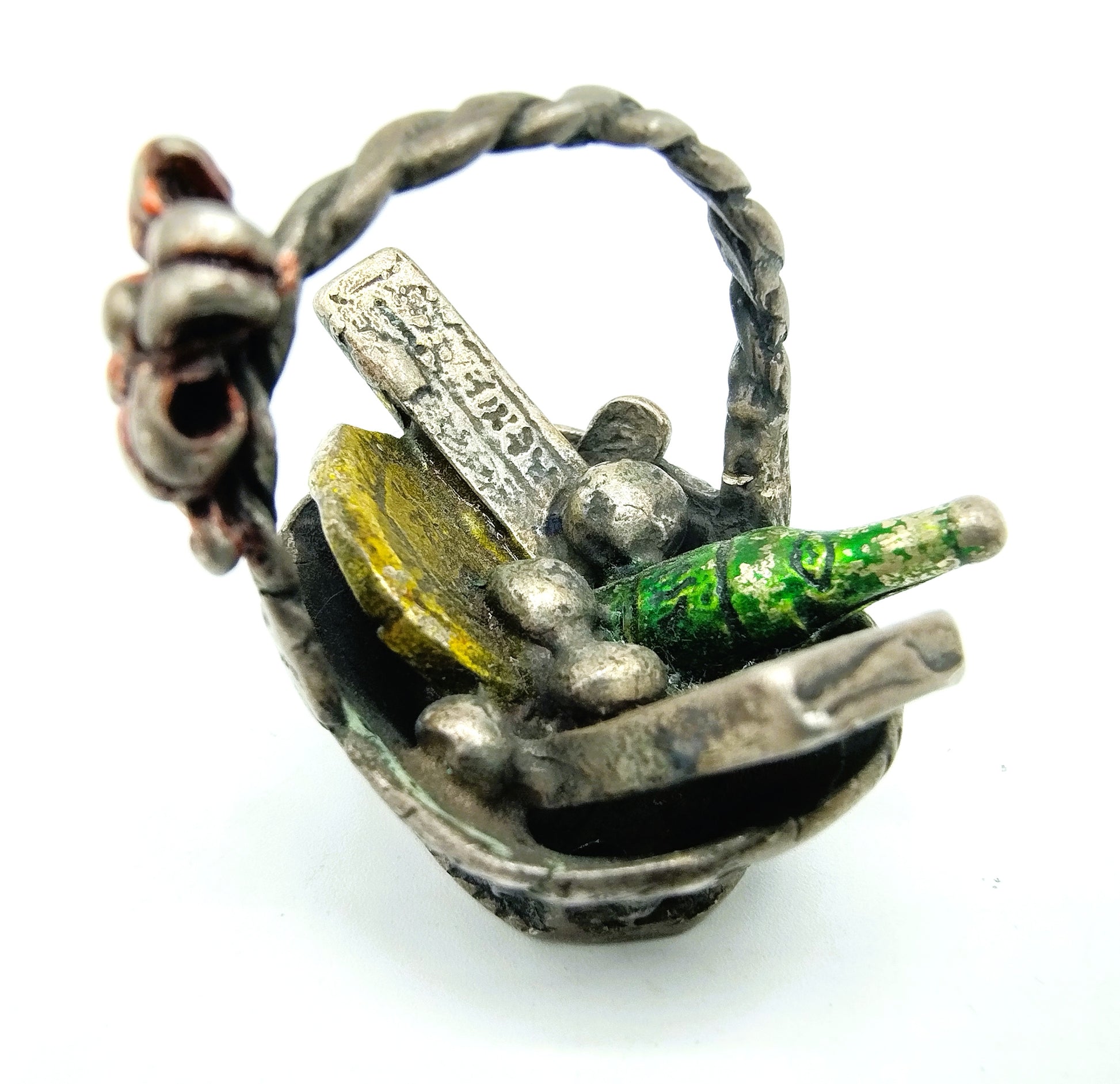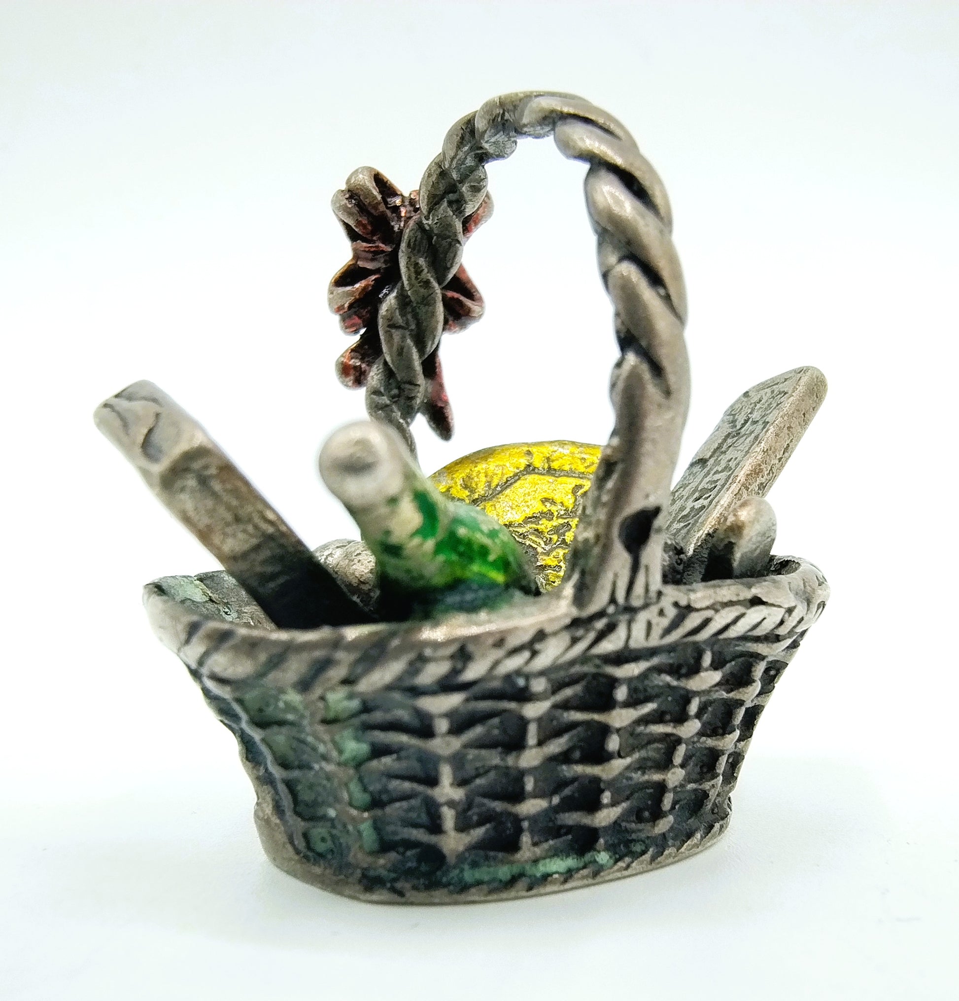 Zware zilveren miniatuur van een gevulde picknickmand.