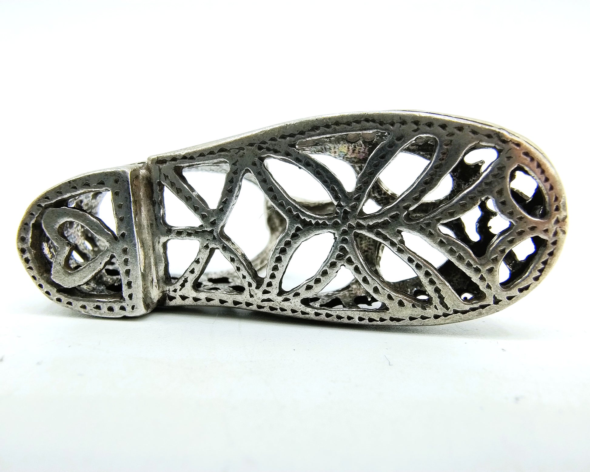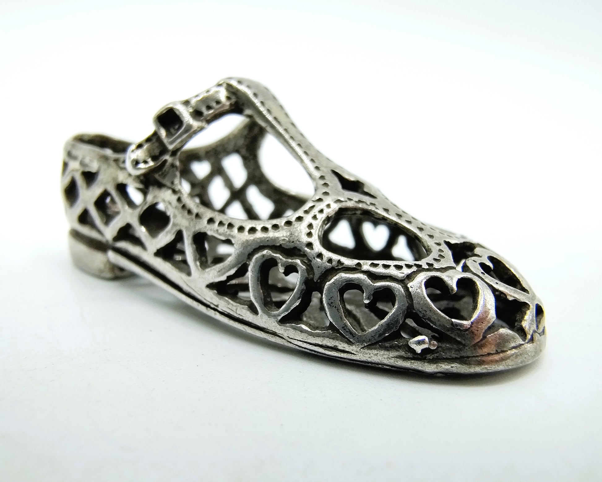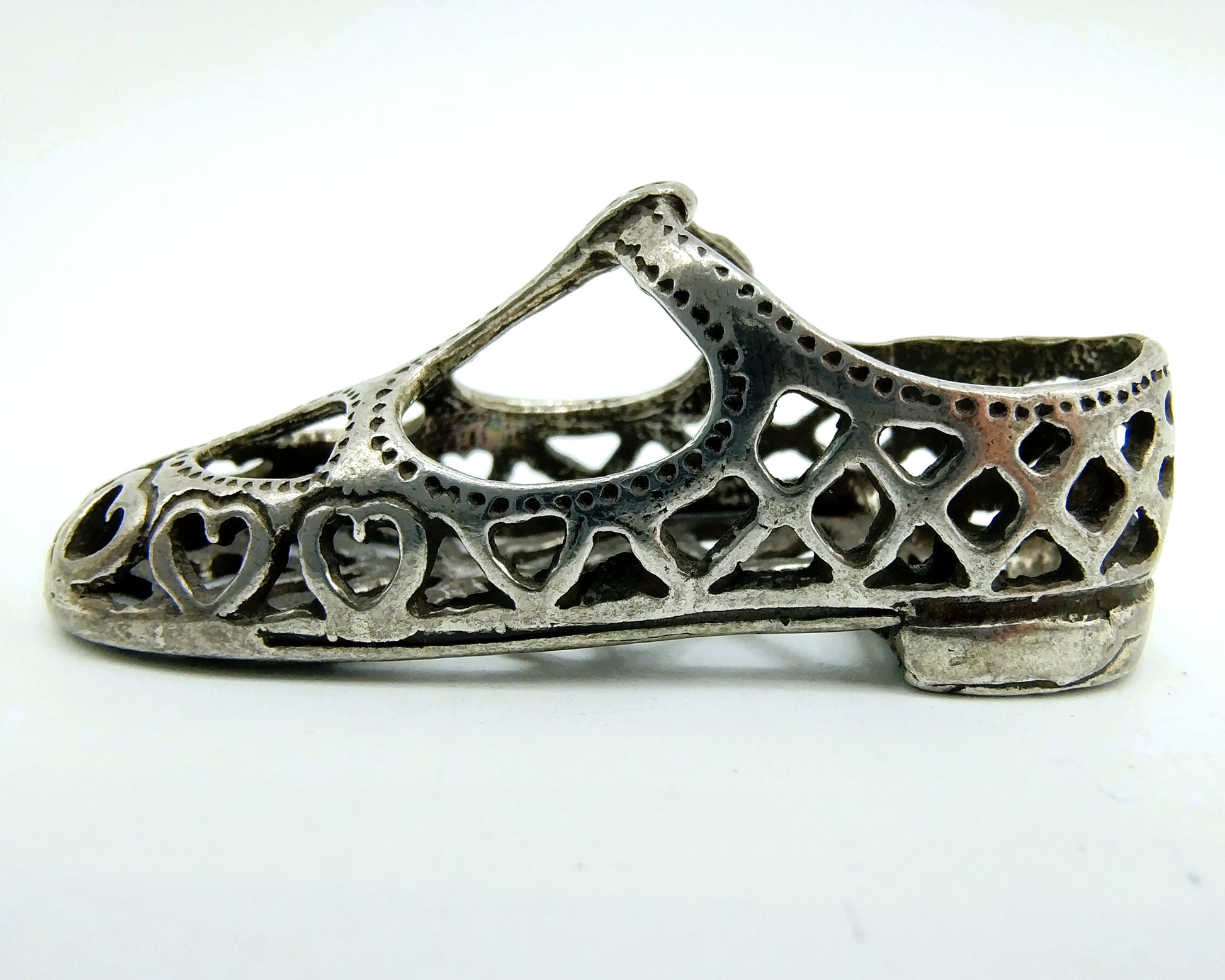 Zilveren miniatuur van een sandaal gemaakt door de fa. Chimera Oro di Nappini Piero & C. snc uit Arezzo (Italië), werkzaam vanaf 1972.
