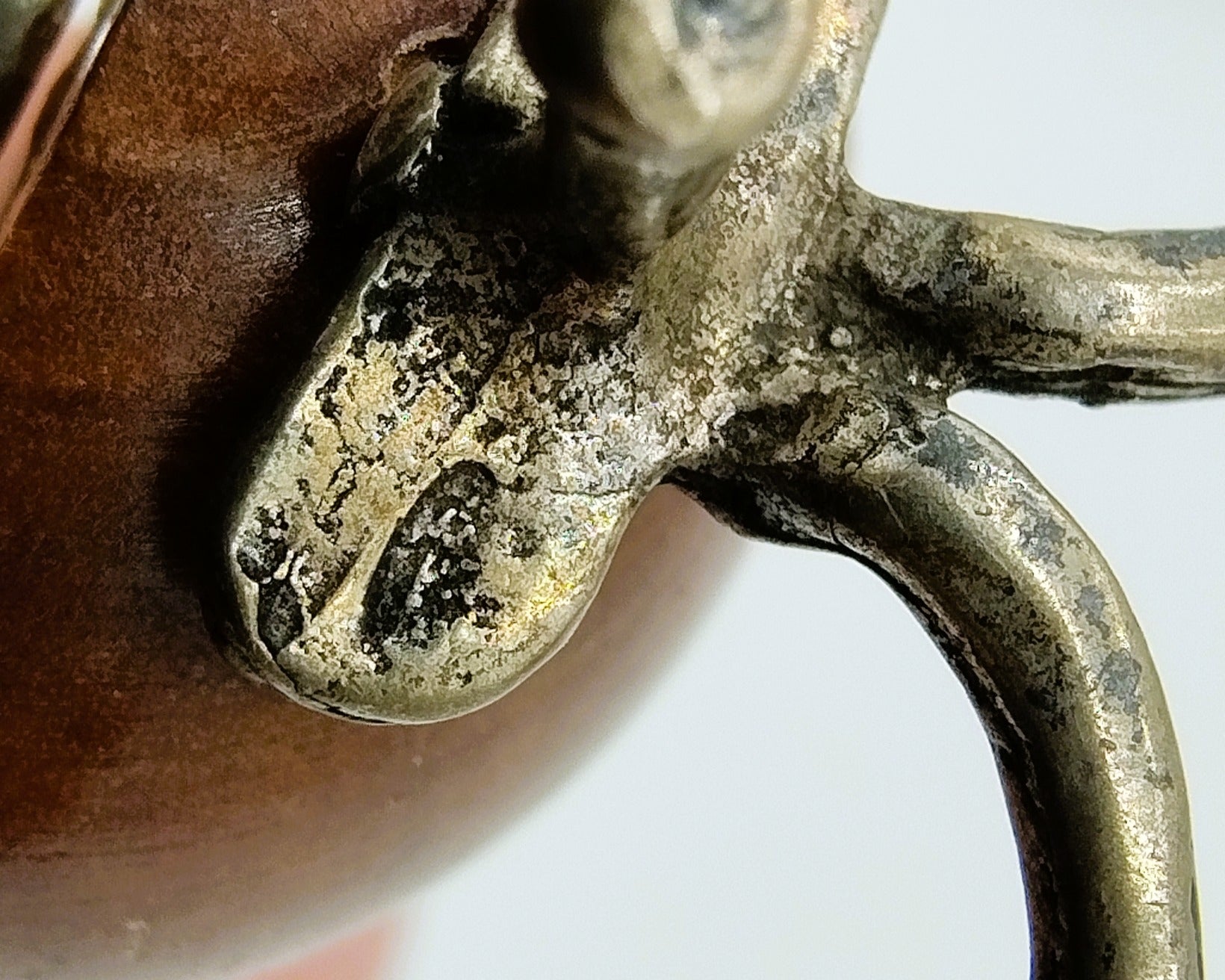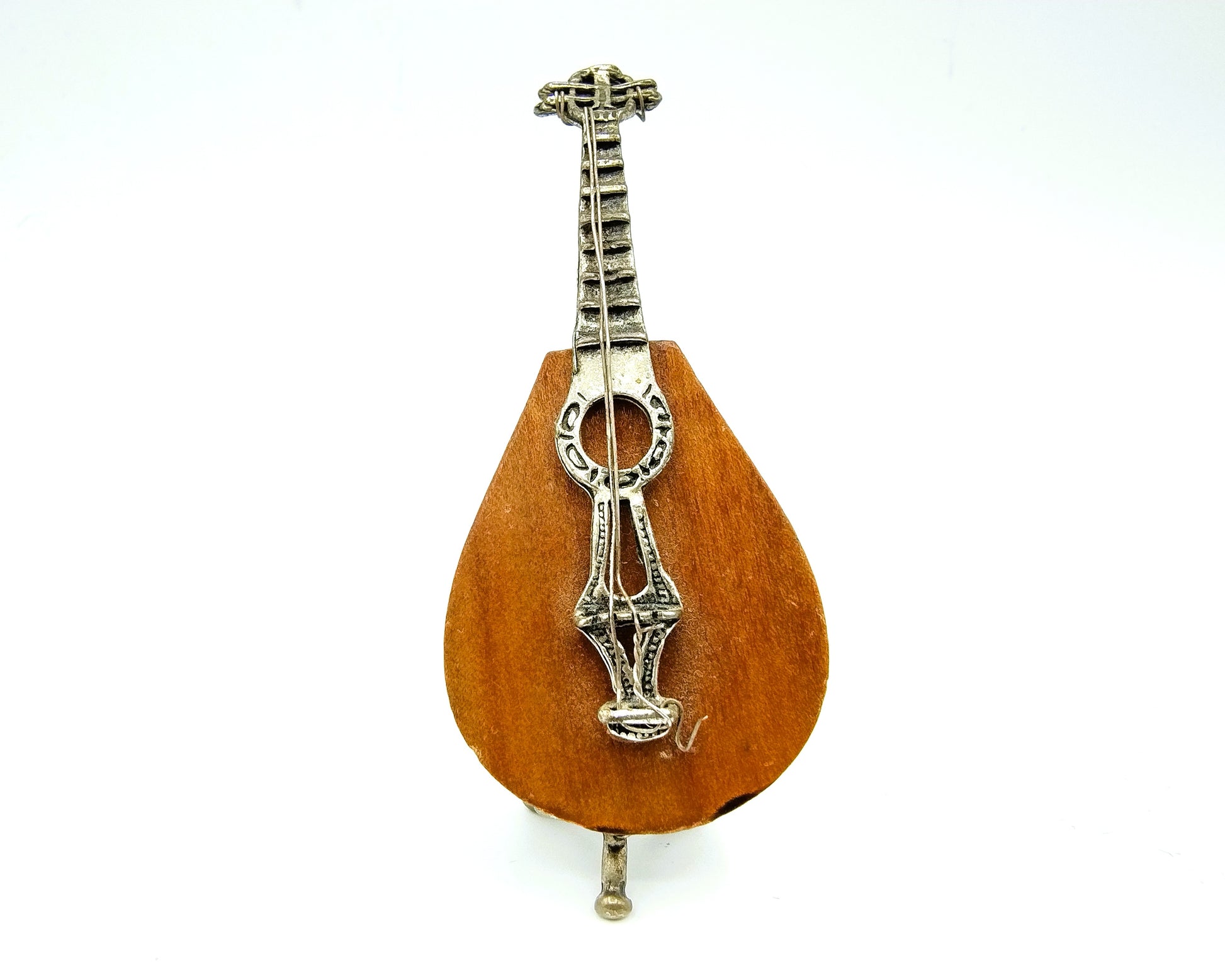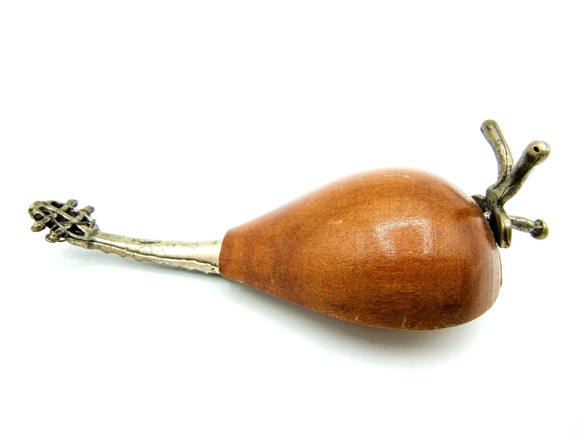 Zilveren miniatuur van een mandoline op zilveren voet.