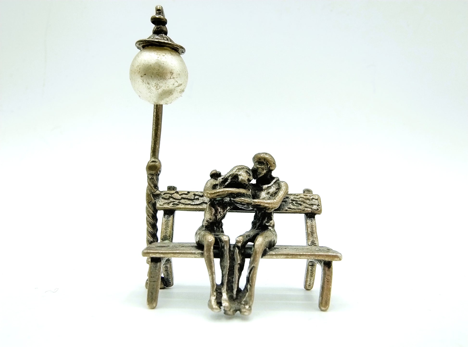 Zilveren miniatuur van een verliefd koppel op een bankje. Naast het bankje staat een lantaarnpaal met een parel als licht.