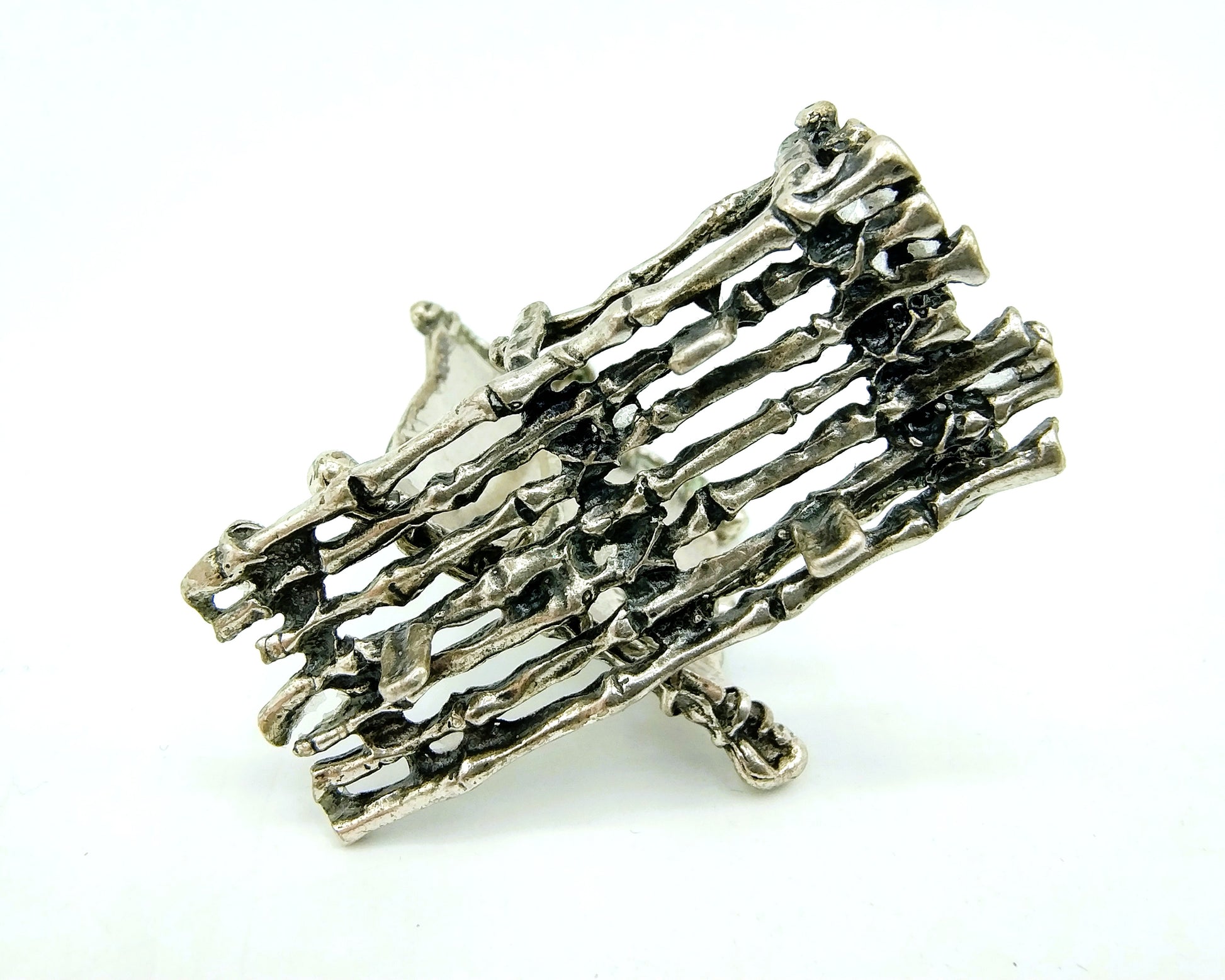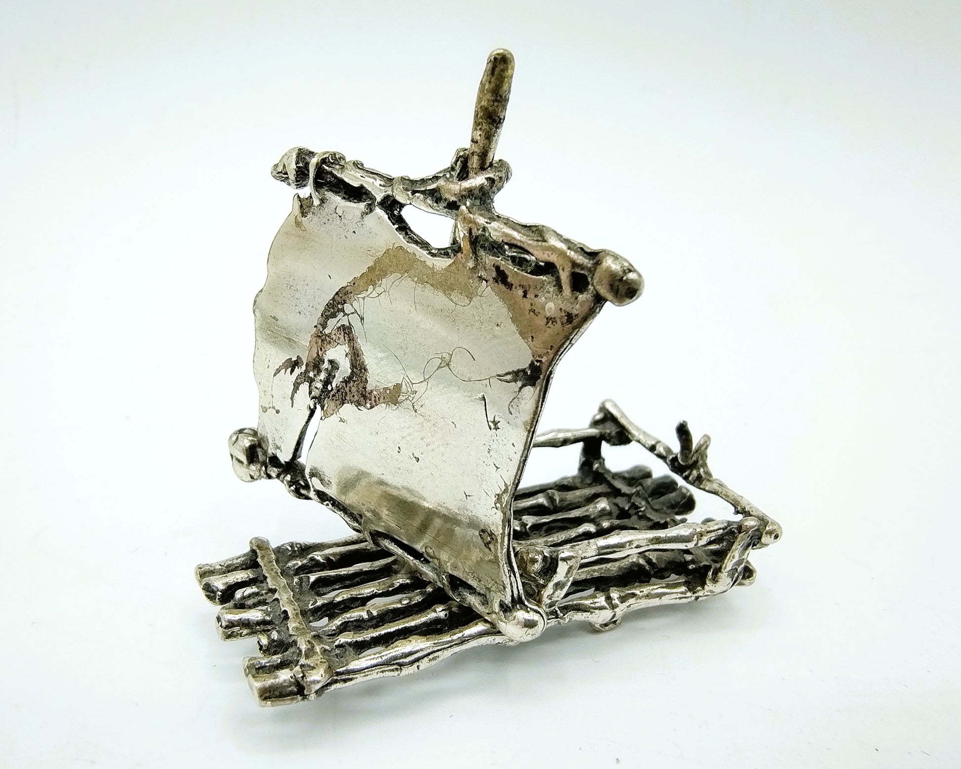 Zilveren miniatuur van een houten vlot met een zeil. Gedetailleerd opgebouwd.
