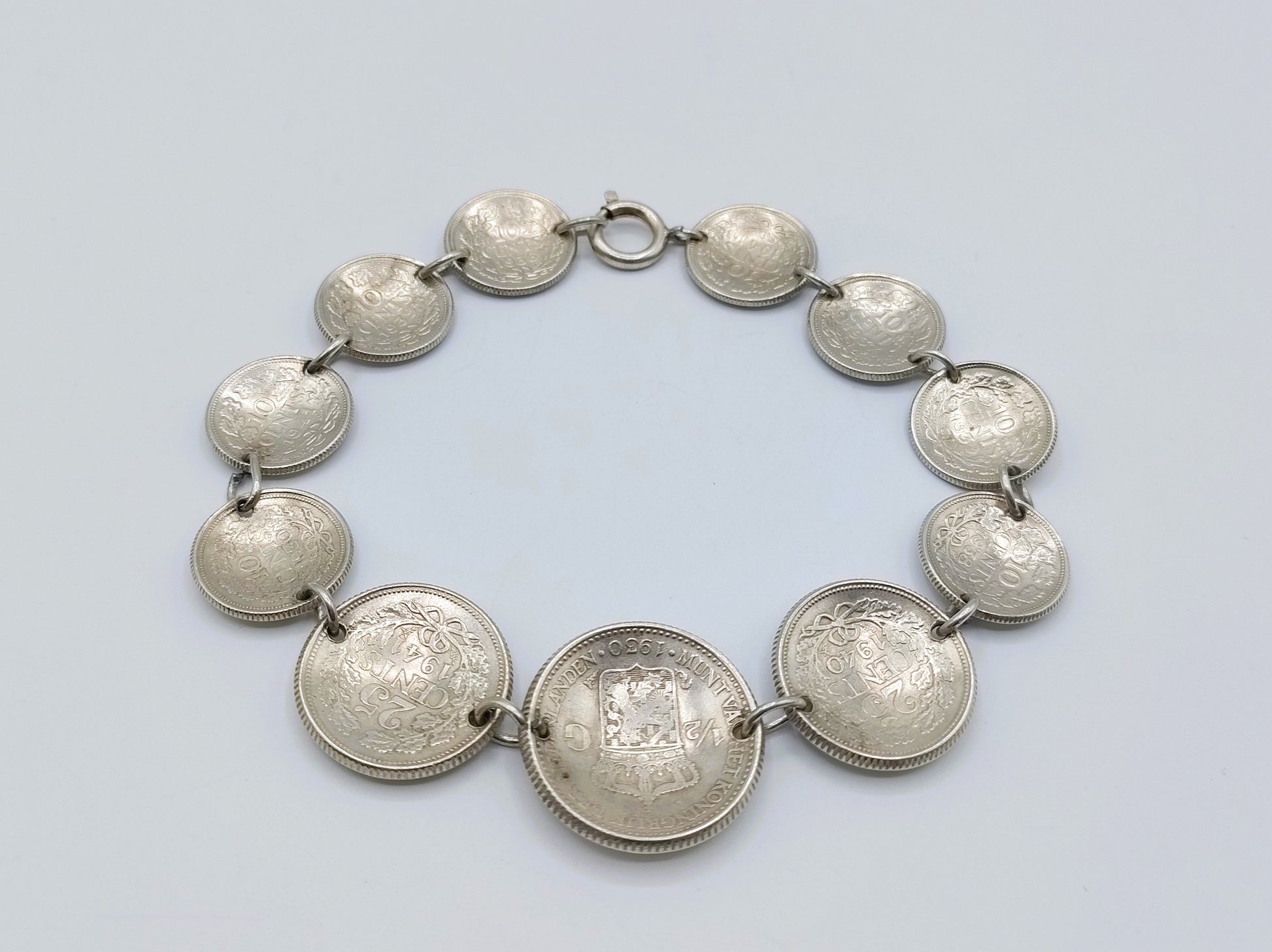 Zilveren armband met munten van Wilhelmina. De munten dateren tussen 1930 en 1944. In totaal zijn er 8 dubbeltjes, 2 kwartjes en een halve gulden verwerkt in de armband.