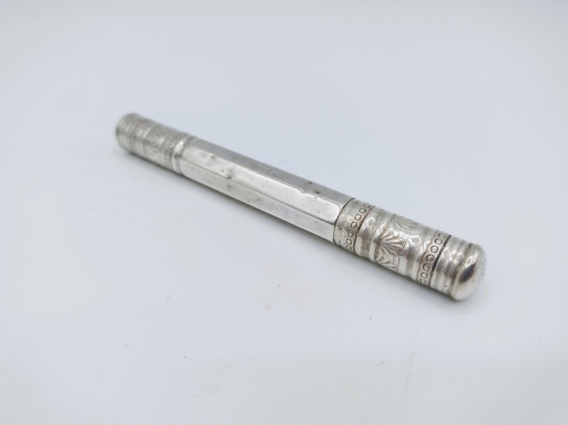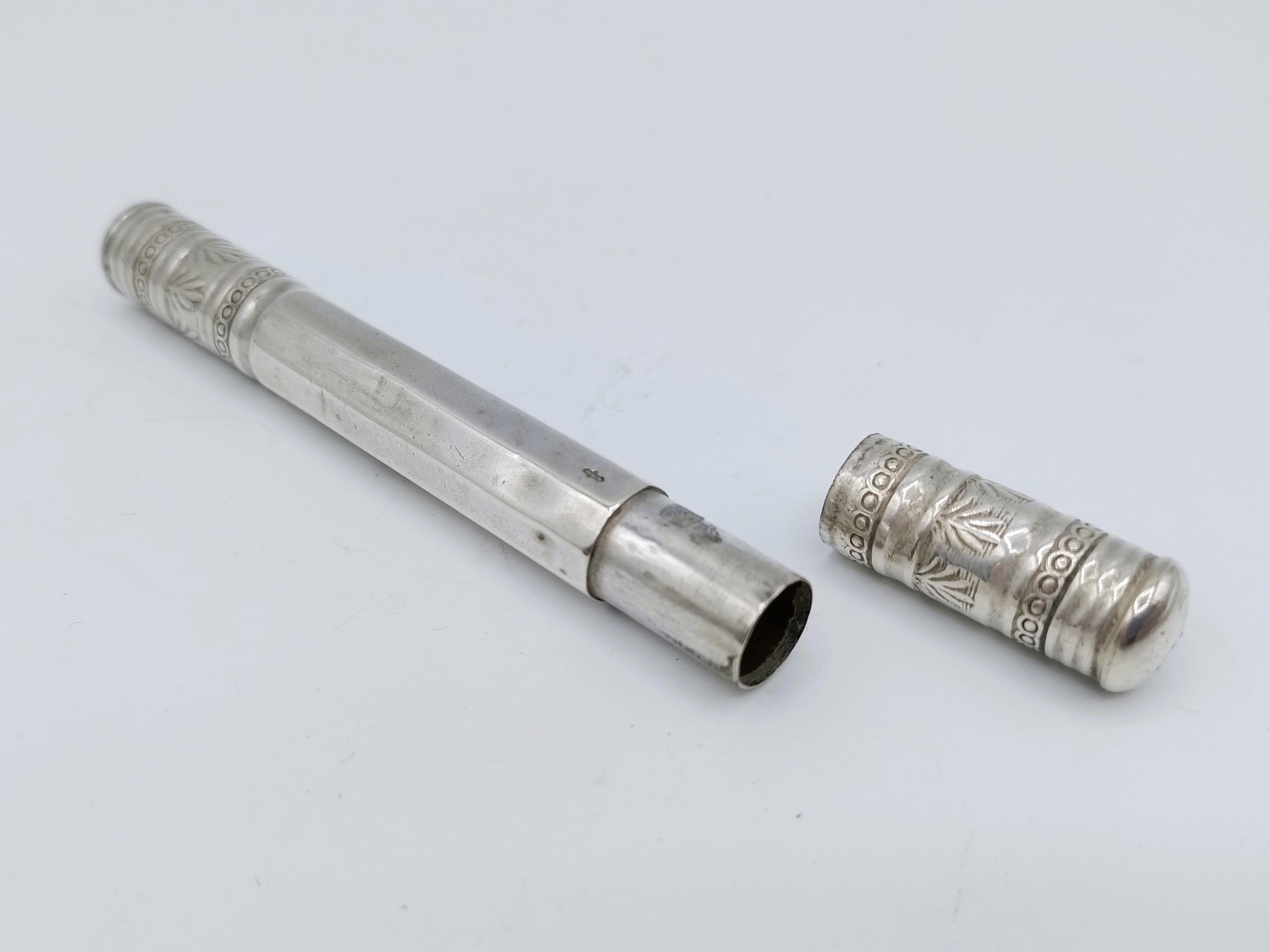 De koker is gekeurd met meesterteken PC114 en het zwaardje voor tweede gehalte zilver.