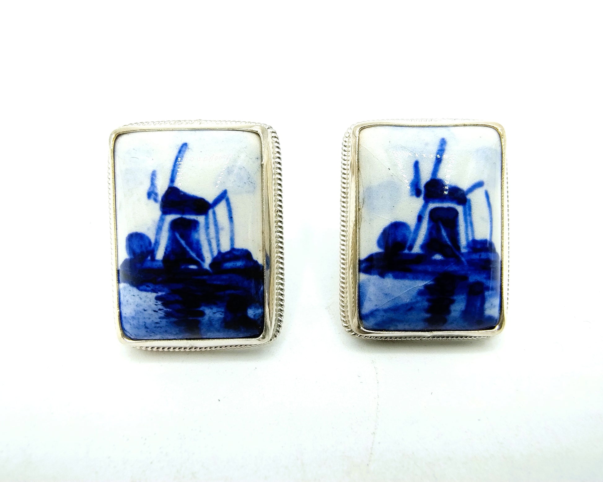 Zilveren oorbellen met Delfts blauwe keramieken afbeelding van een molen. Deze afbeelding is gezet in een gladde kast met parelrand.