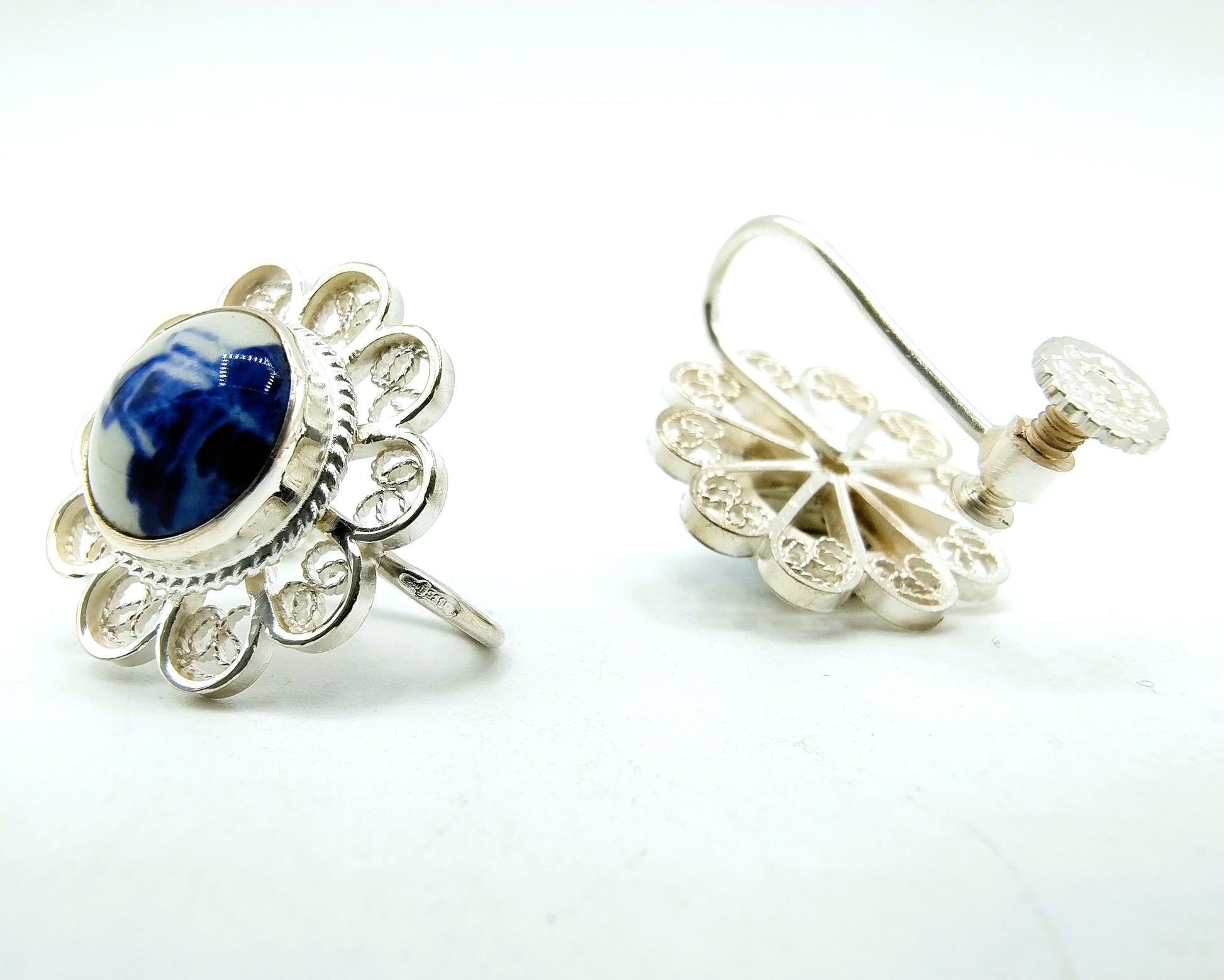 Zilveren oorbellen met Delfts blauwe keramieken afbeelding van een molen. Deze afbeelding is gezet in een gladde kast met filigrain rand.