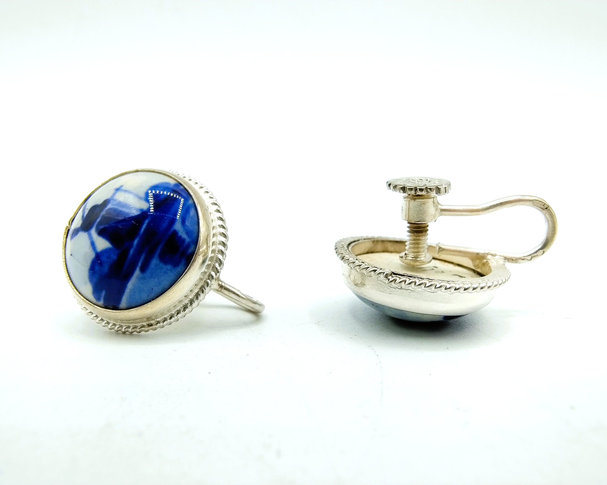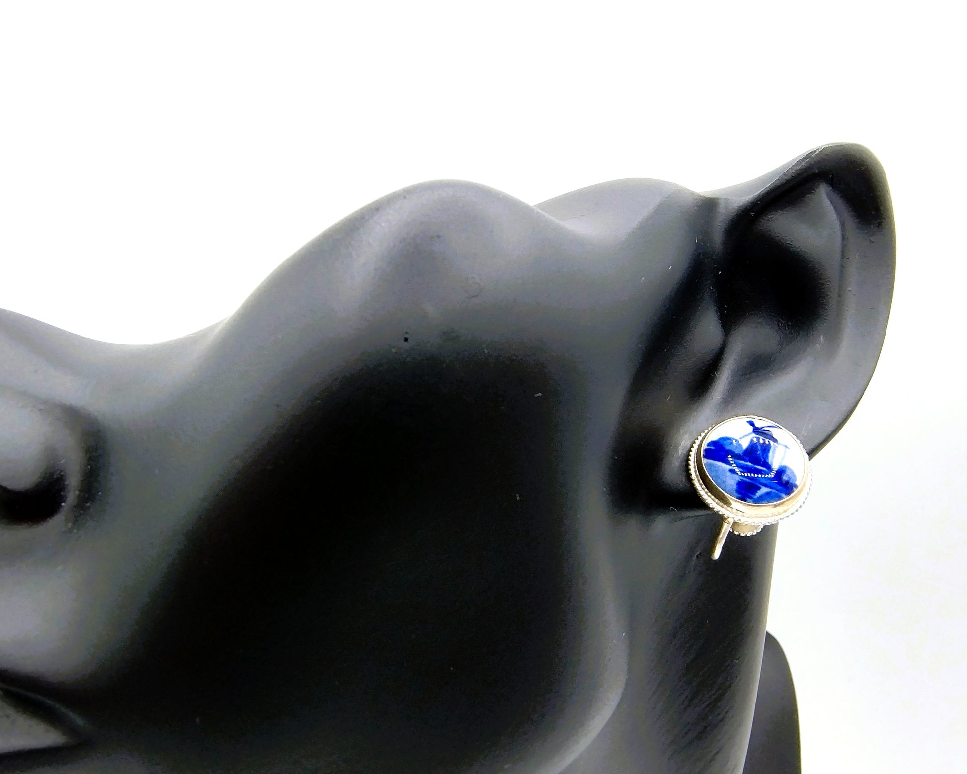 Zilveren oorbellen met Delfts blauwe keramieken afbeelding van een molen. Deze afbeelding is gezet in een gladde kast.