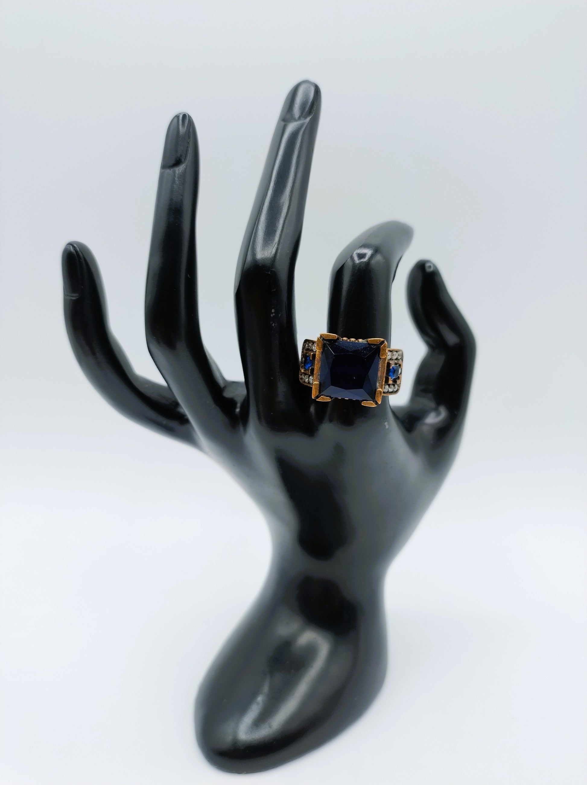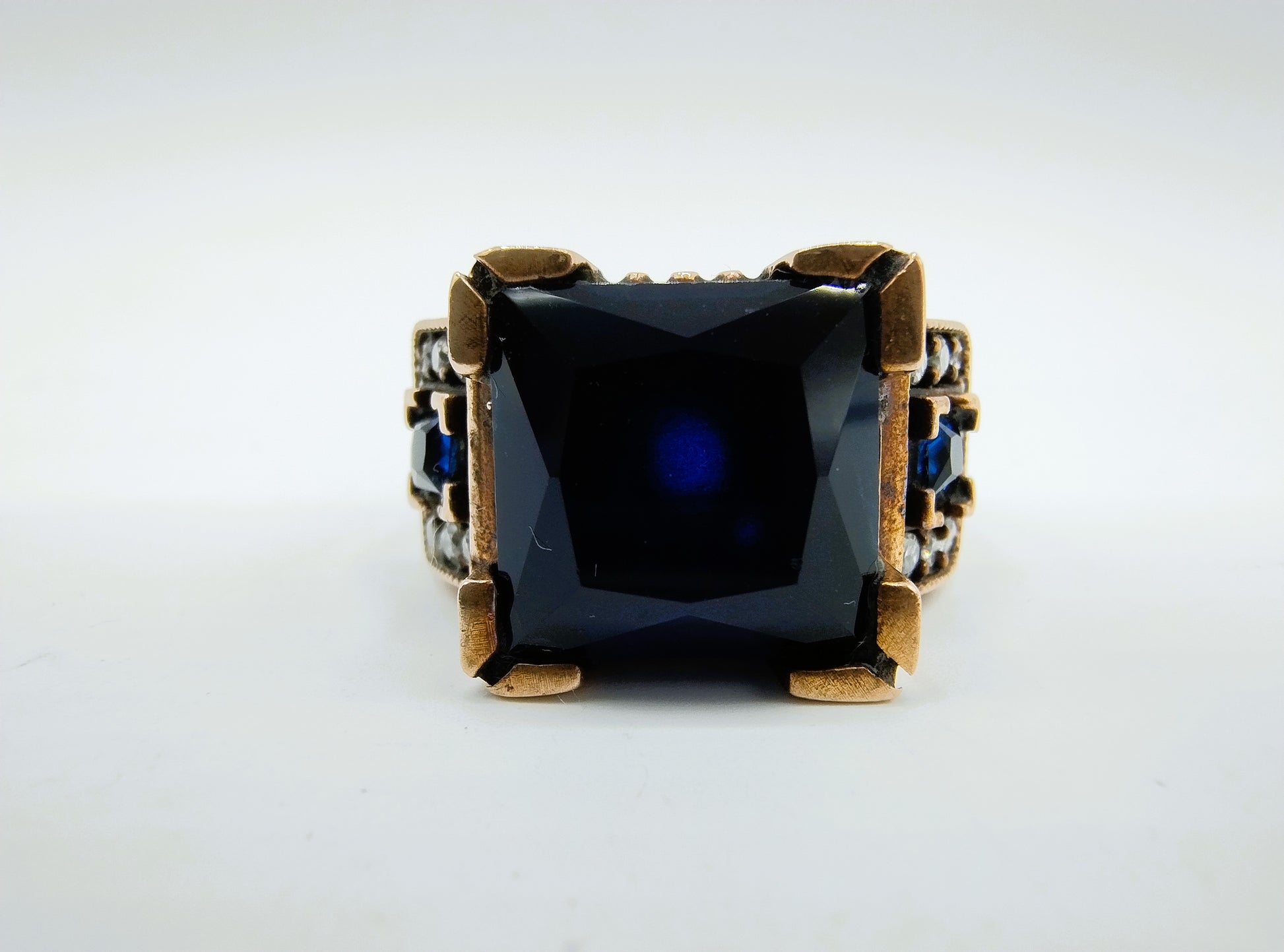 Robuuste heren ring, combinatie van zilver en brons met synthetische saffier en zirkonia.