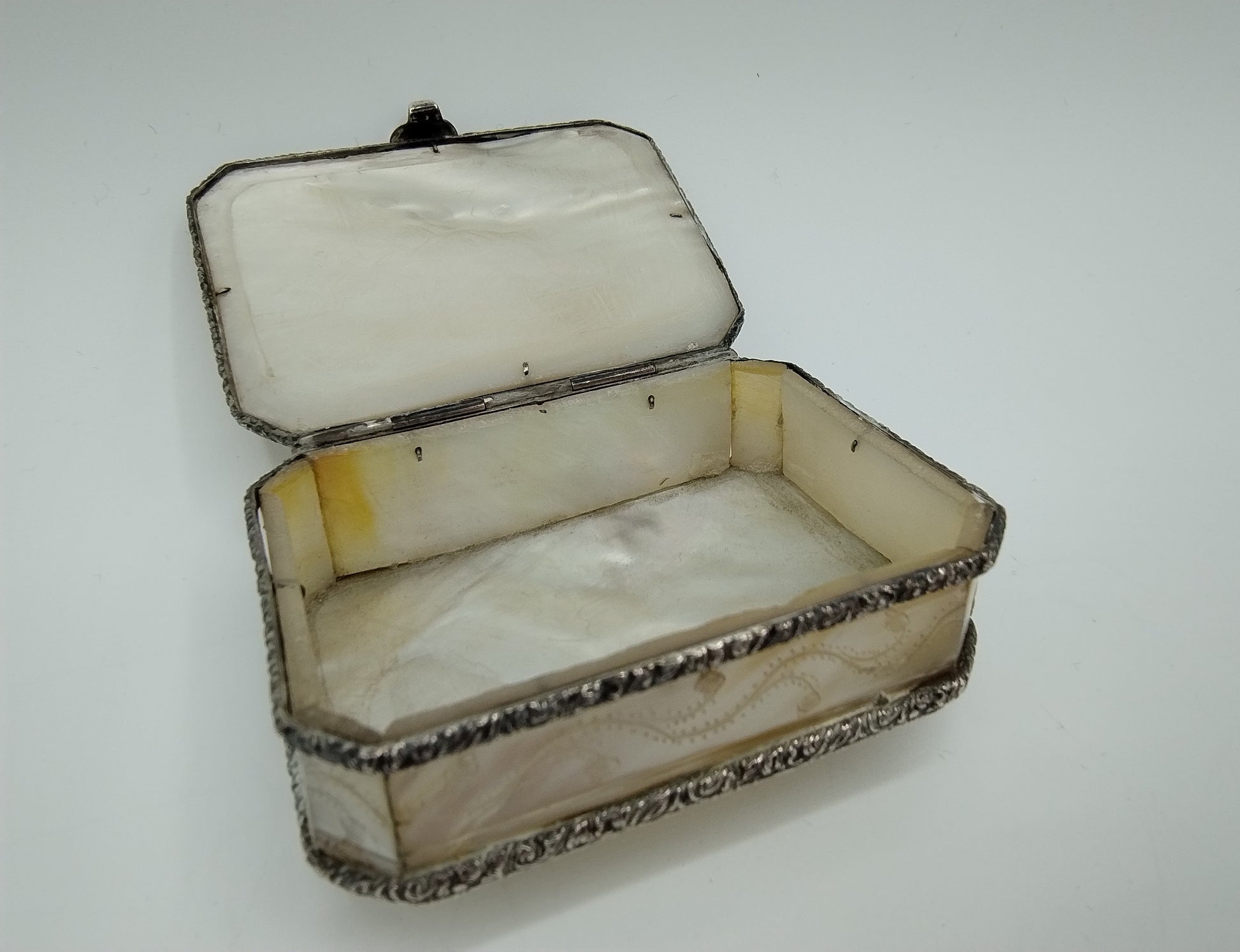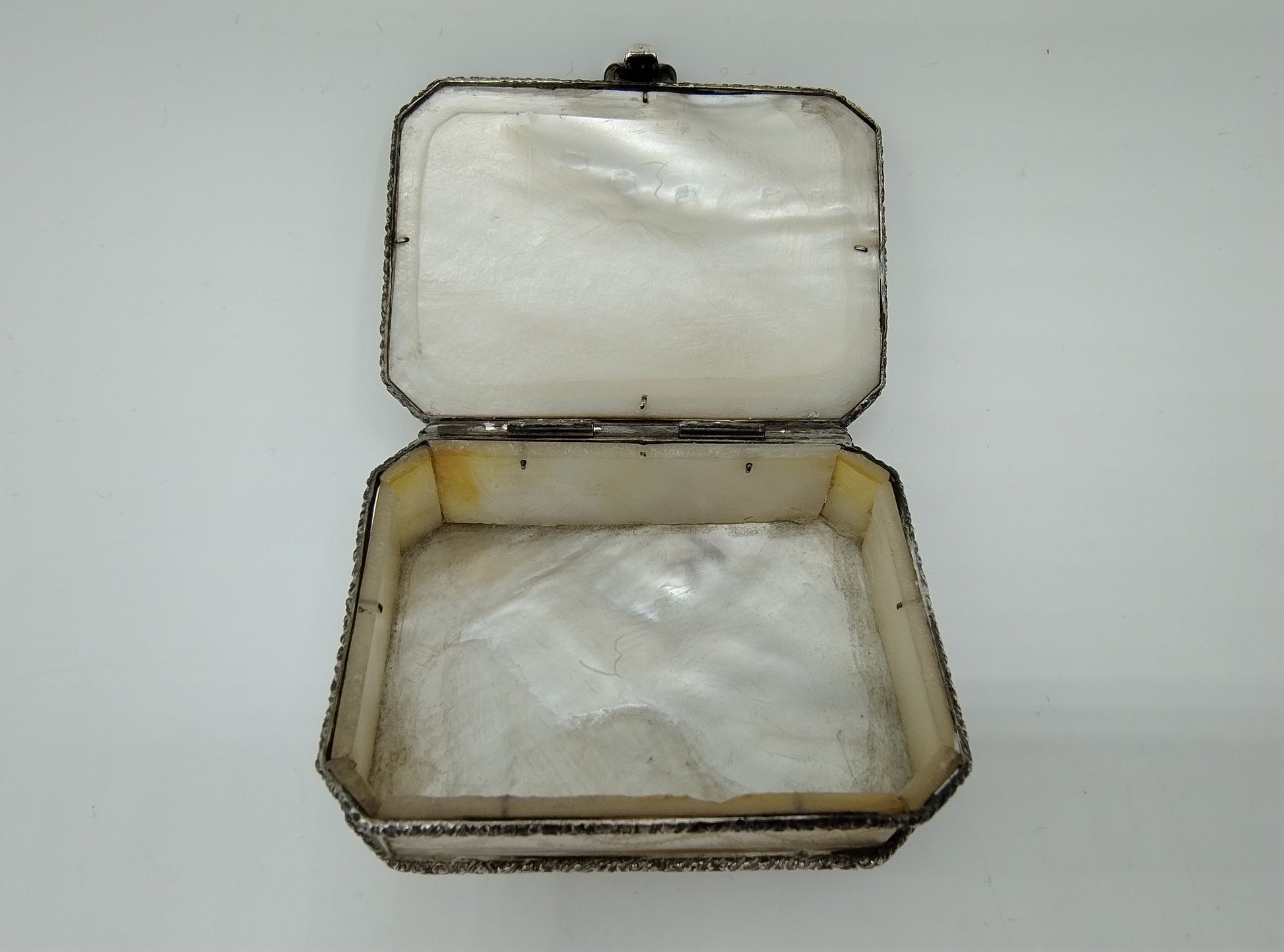 Zilveren doosje opgebouwd uit parelmoer zijkanten, boven- en onderkant.