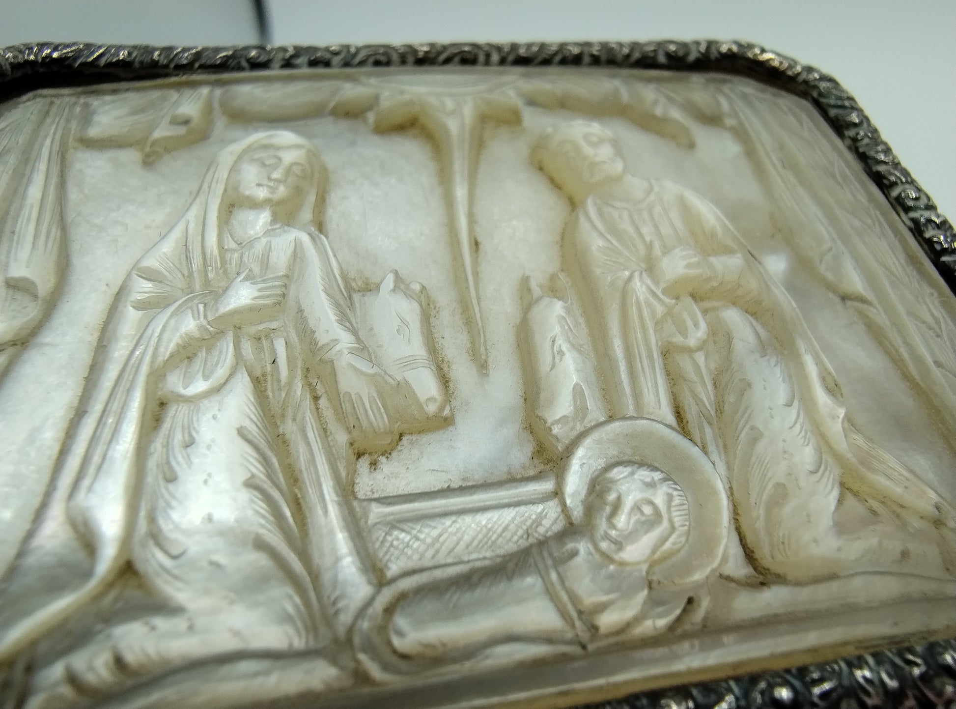 Op de bovenkant is een afbeelding uitgesneden van de geboorte van Jezus met Jozef en Maria.