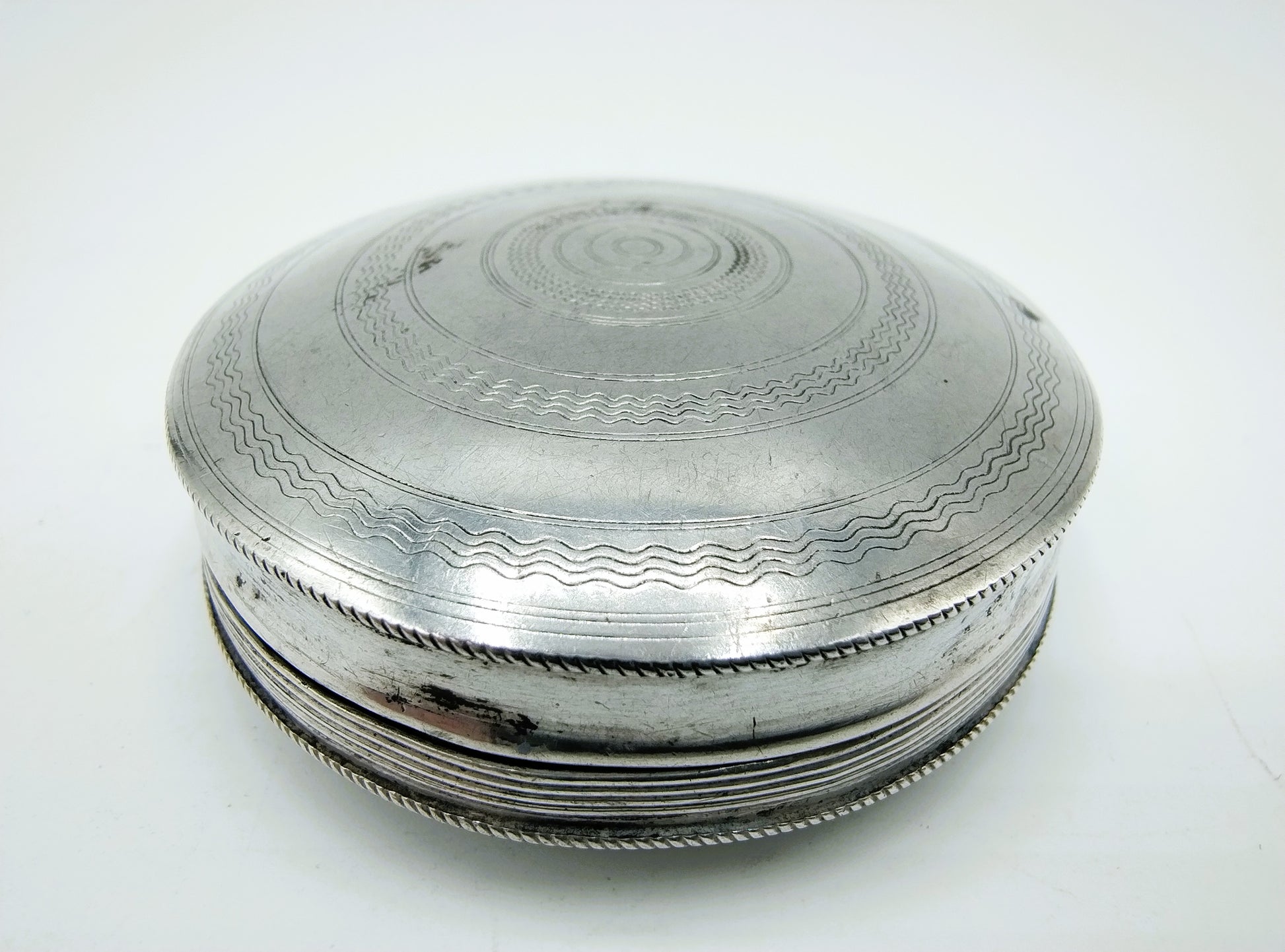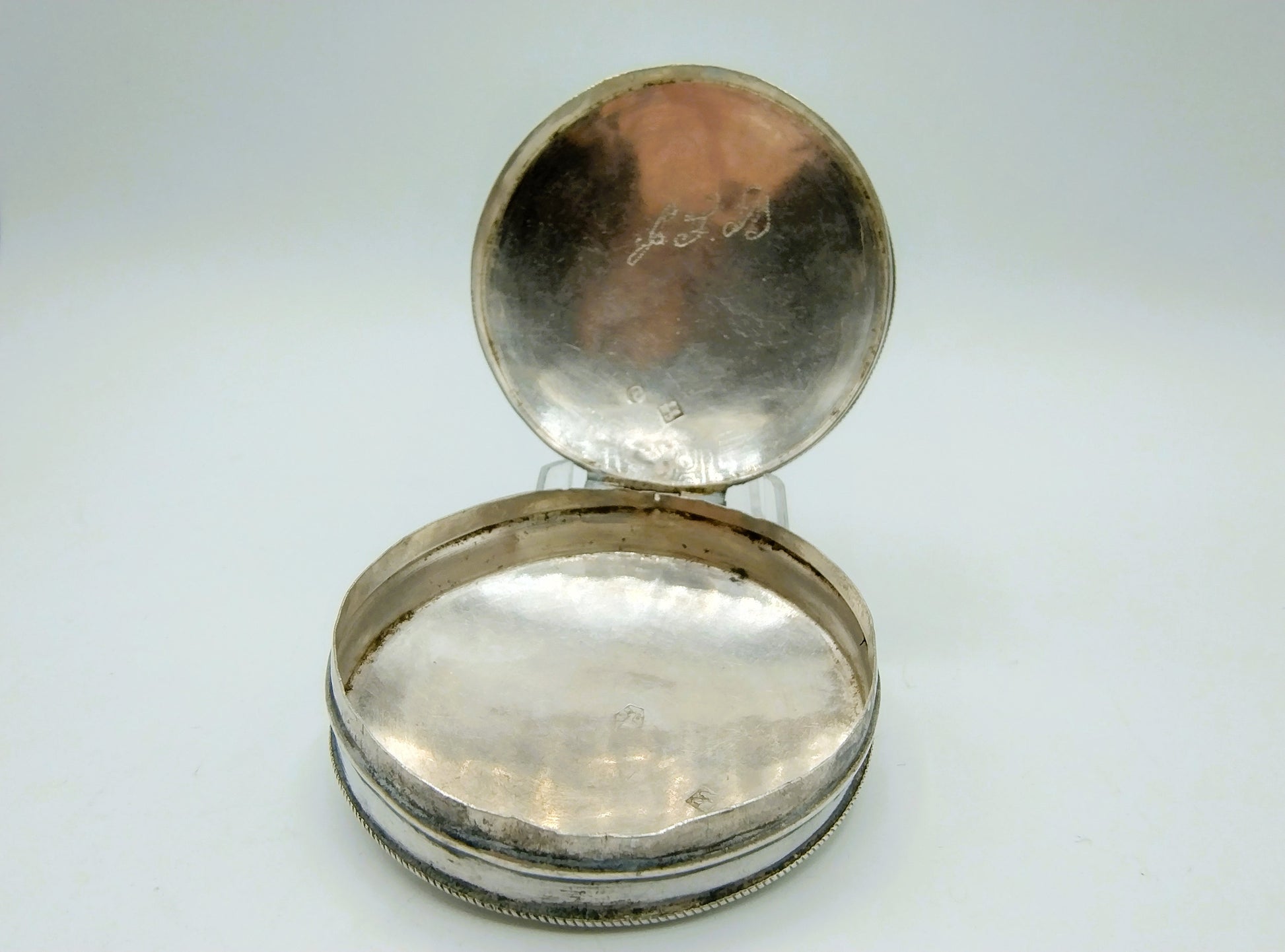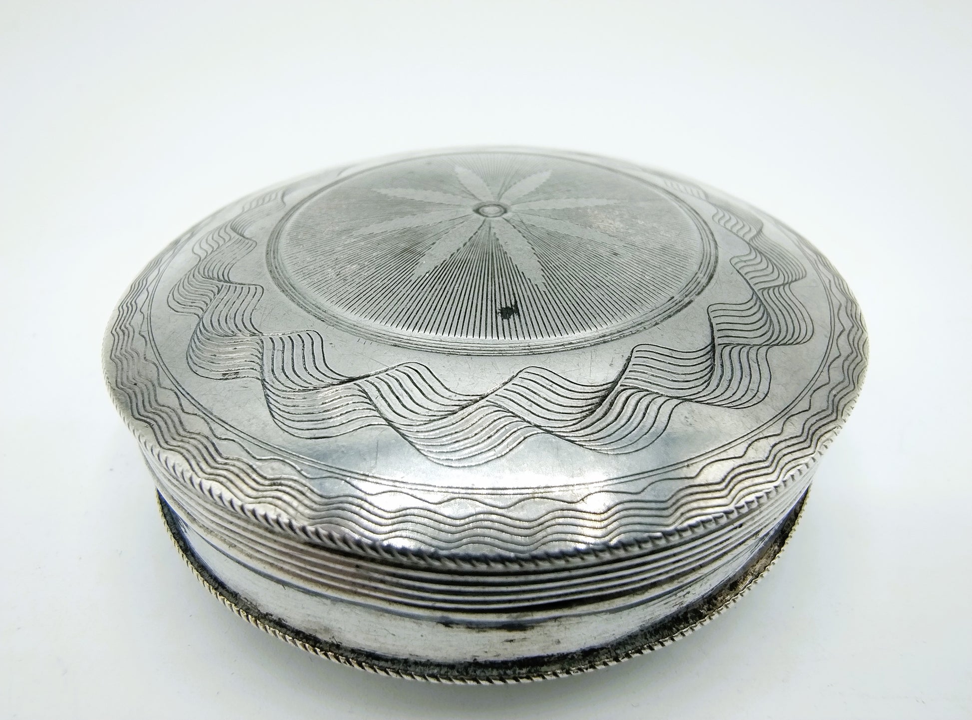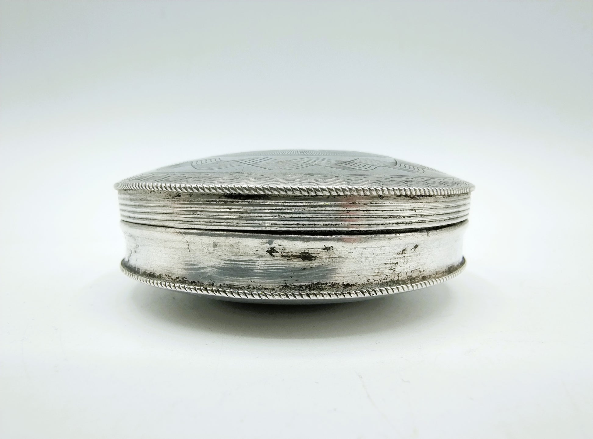 Zilveren pepermuntdoosje met zowel op het deksel als de onderkant een fraaie versiering.
