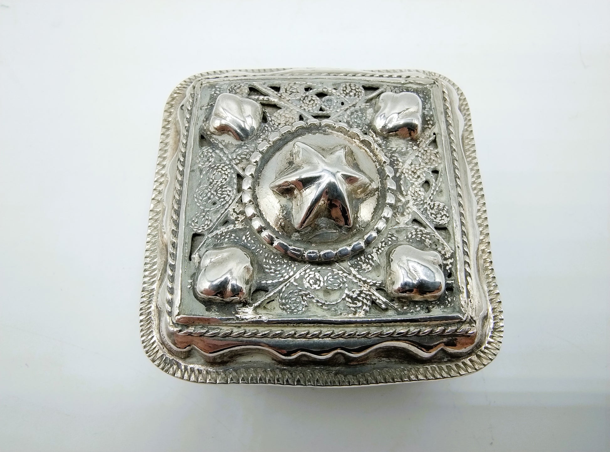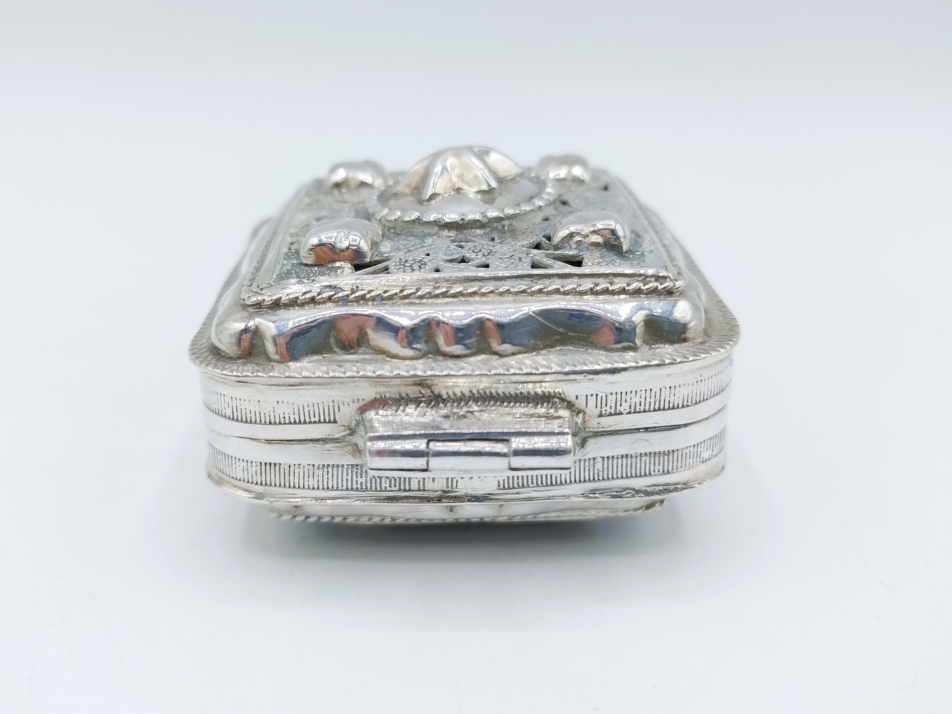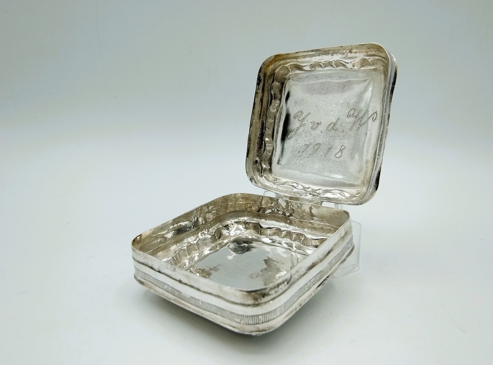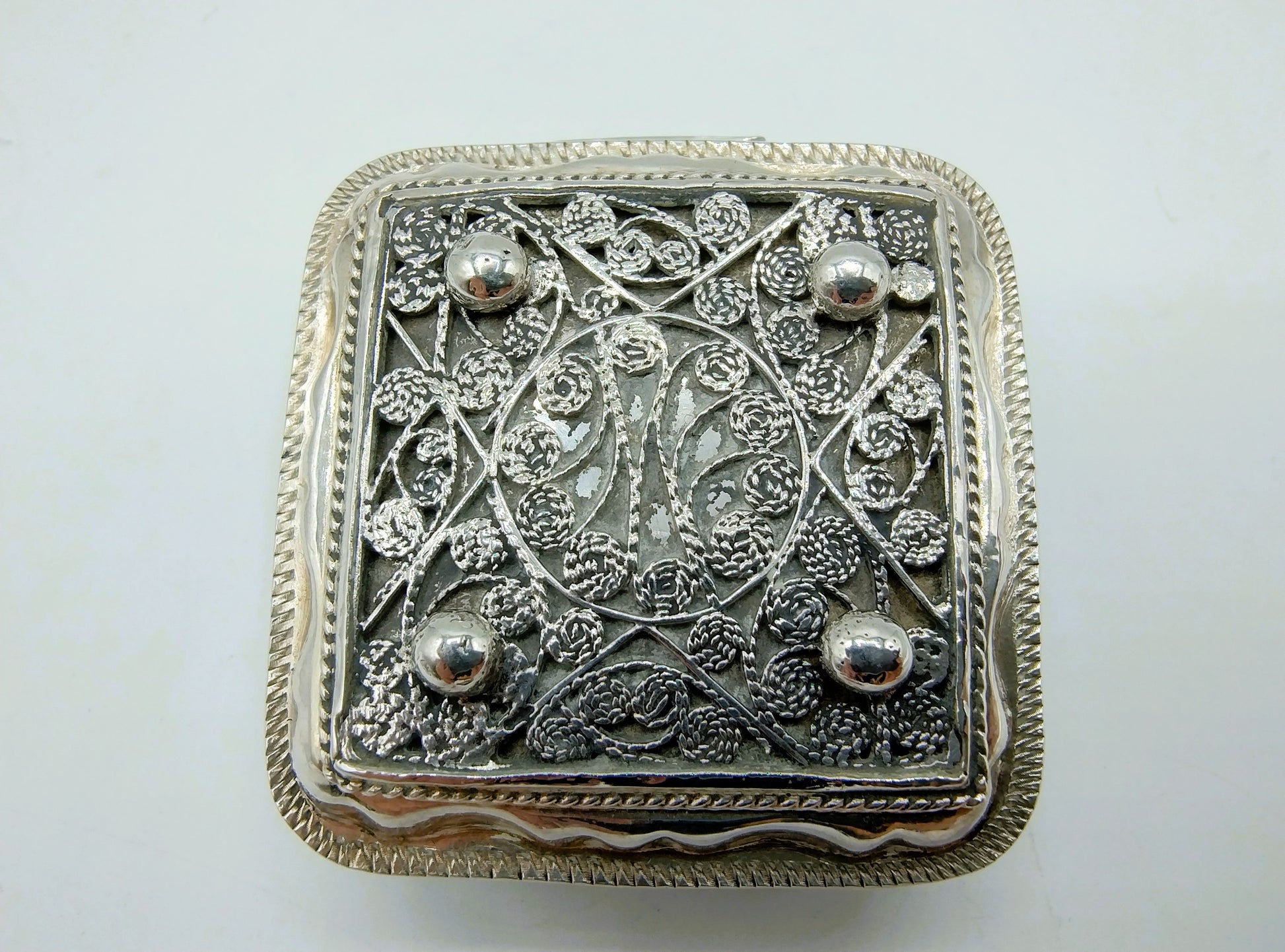 Zilveren pepermuntdoosje met zowel op het deksel als de onderkant filigrain zilversmeedwerk. gemaakt door Cornelis Capoen uit Schoonhoven. Werkzaam van 1900 tot 1920.