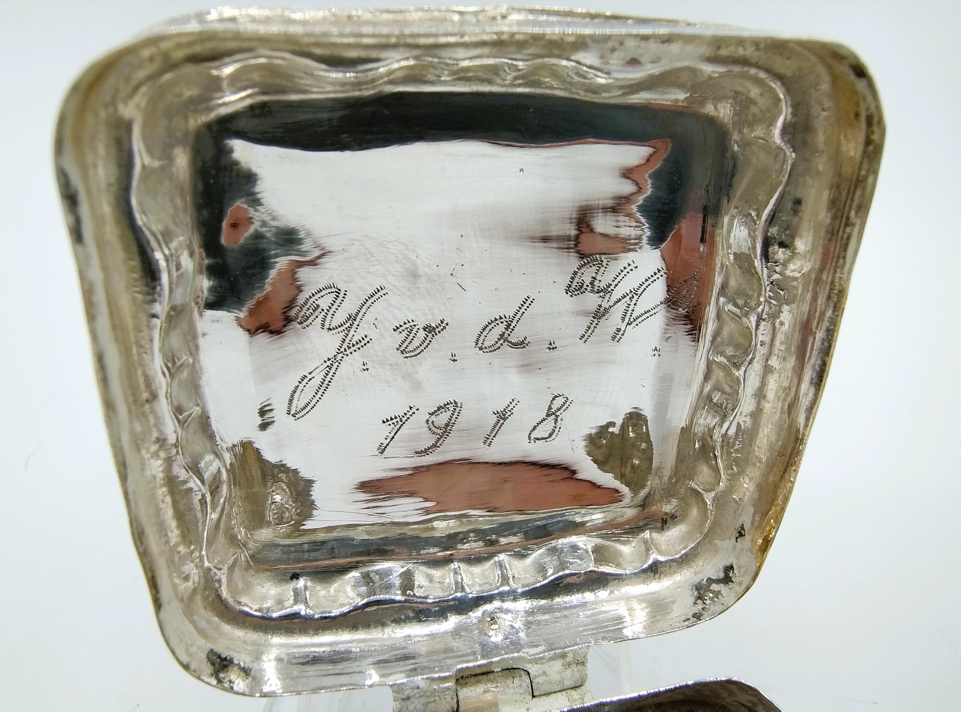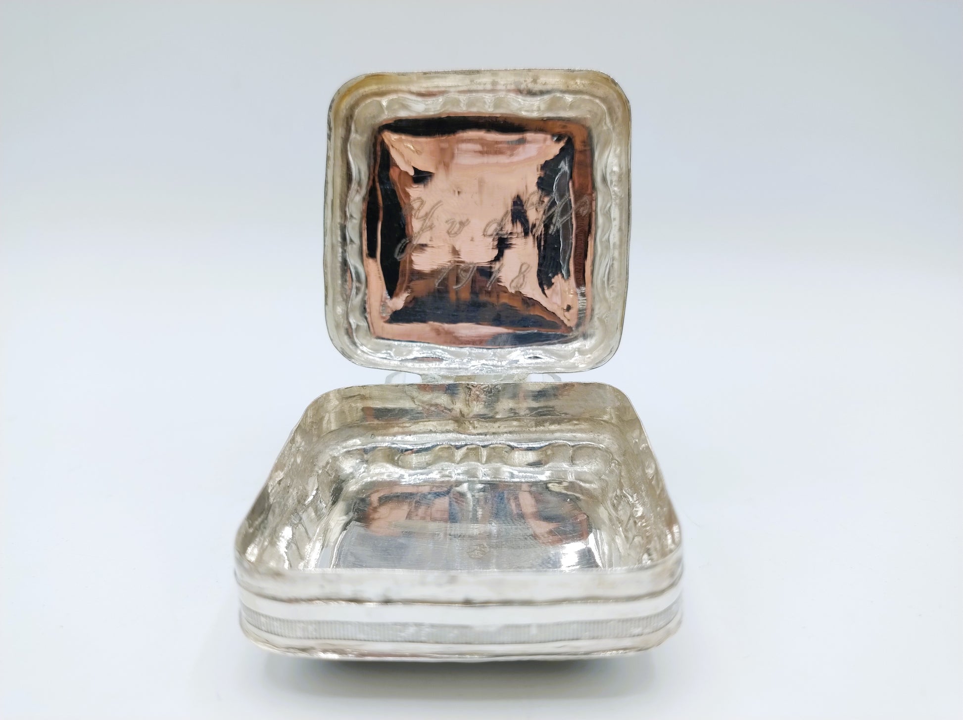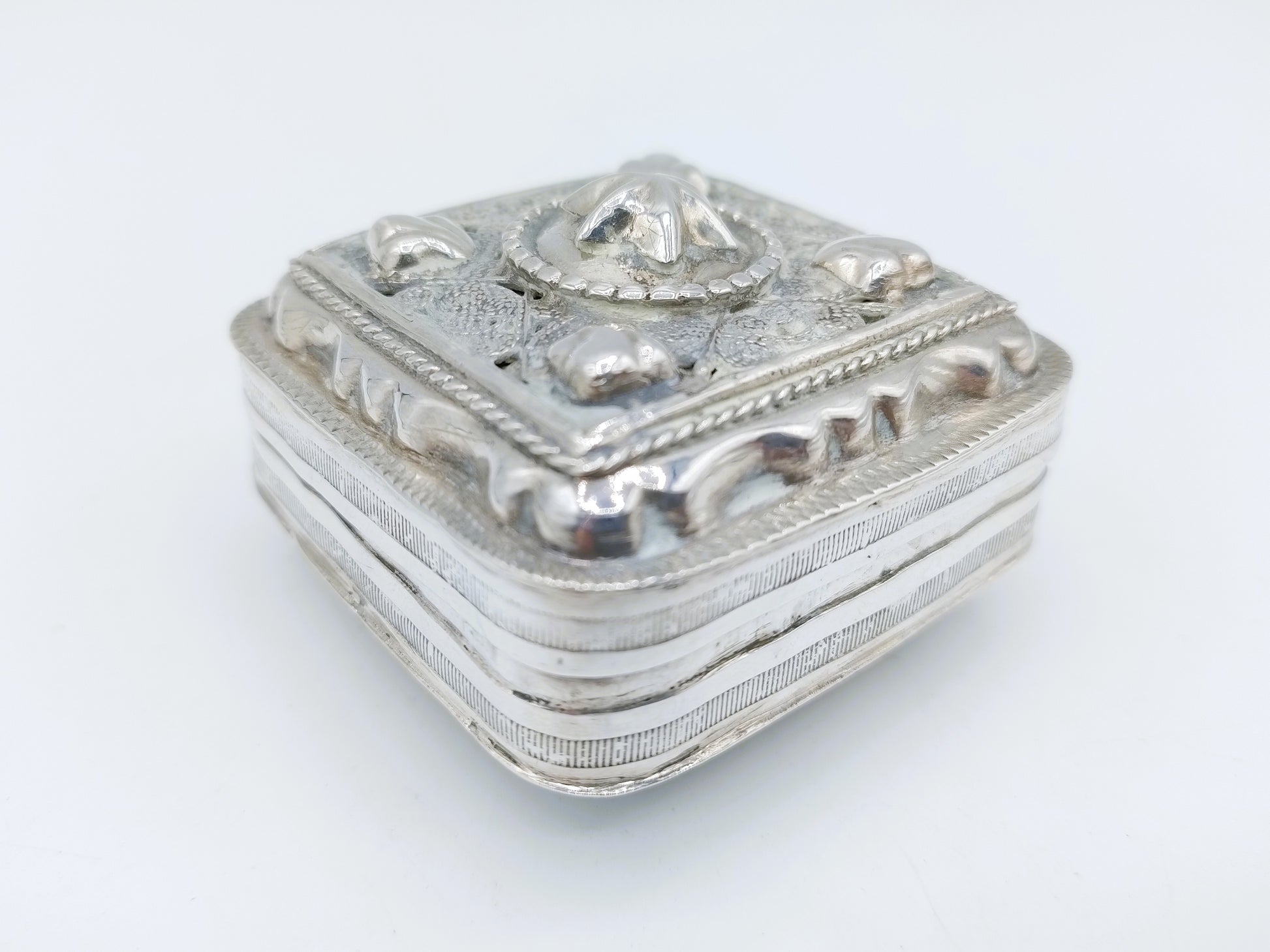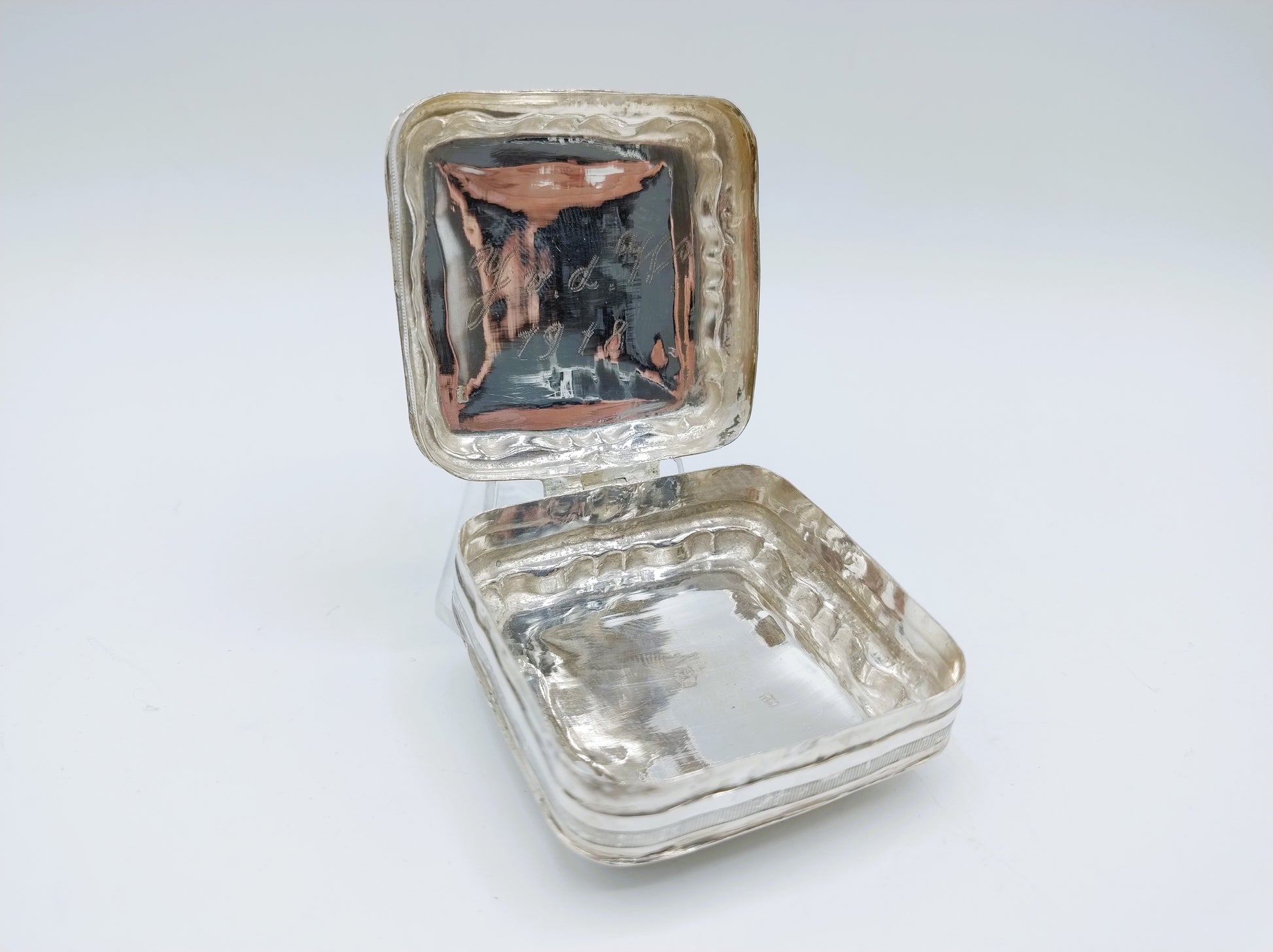 Zilveren pepermuntdoosje met zowel op het deksel als de onderkant filigrain zilversmeedwerk. gemaakt door Cornelis Capoen uit Schoonhoven. Werkzaam van 1900 tot 1920.