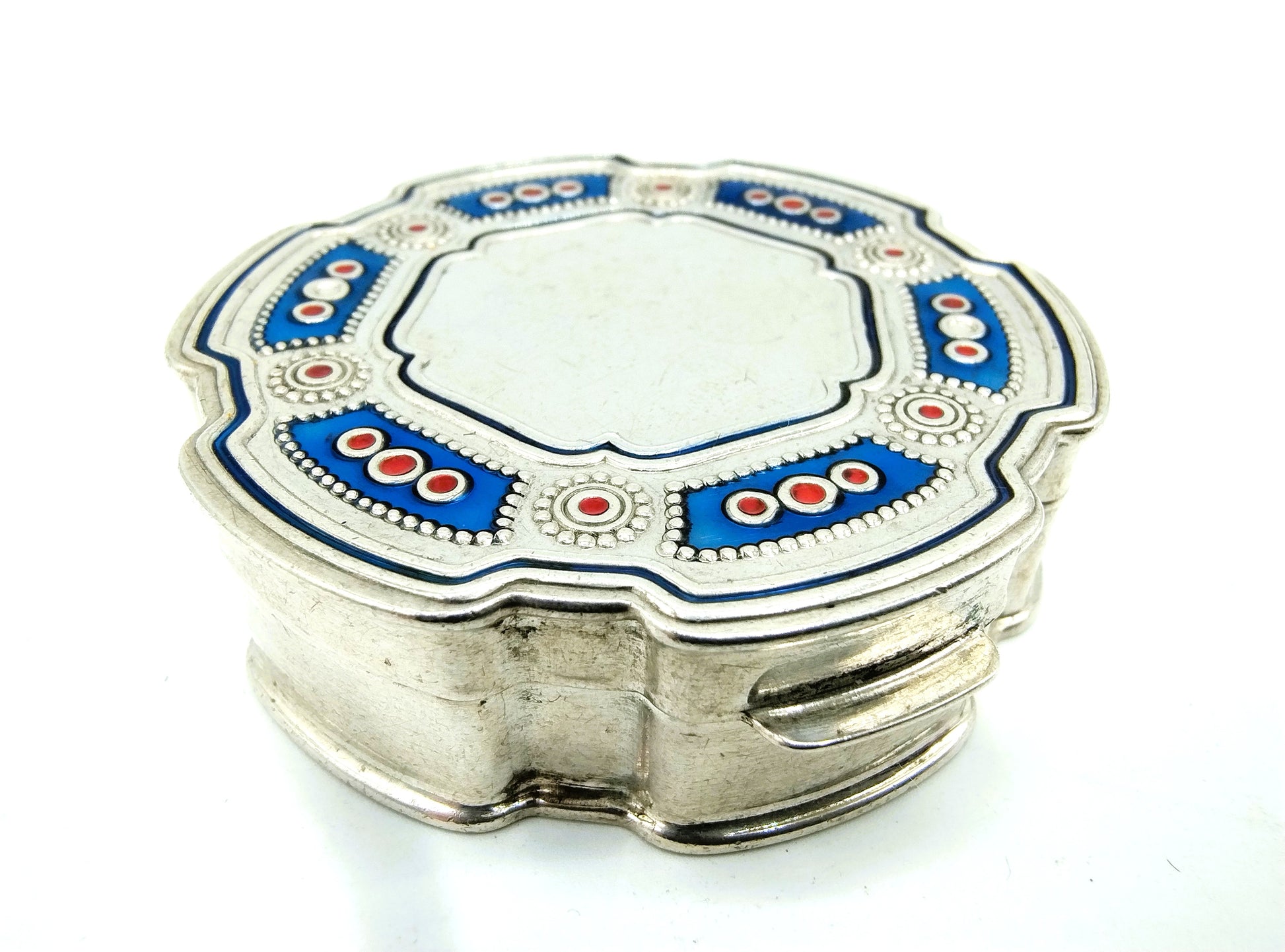 Zilveren pillendoosje met blauwe inleg van de fabrikant Rino Greggio uit Sarmeola di Rubano. (Italië) Werkzaam vanaf 1948 tot heden.