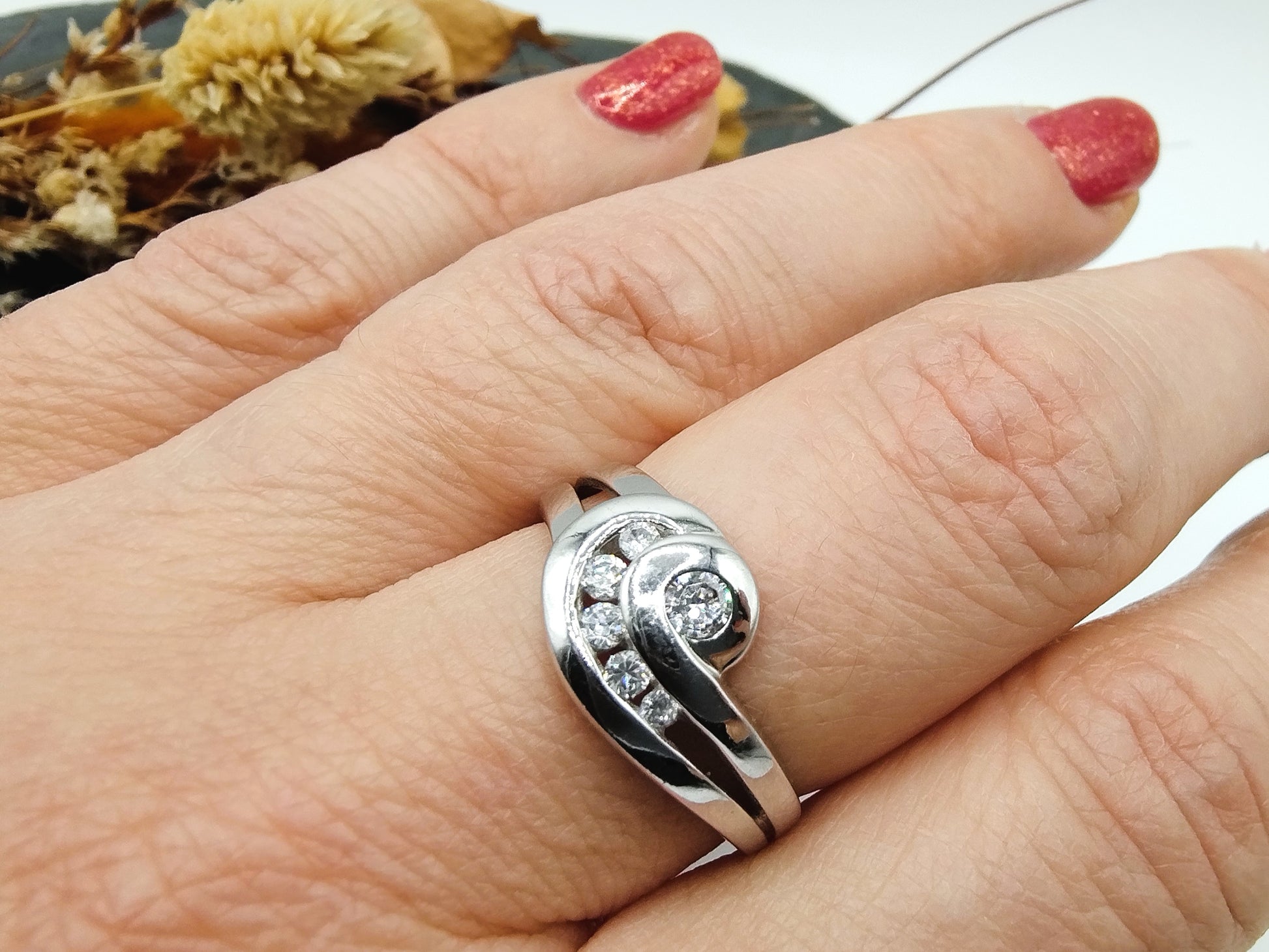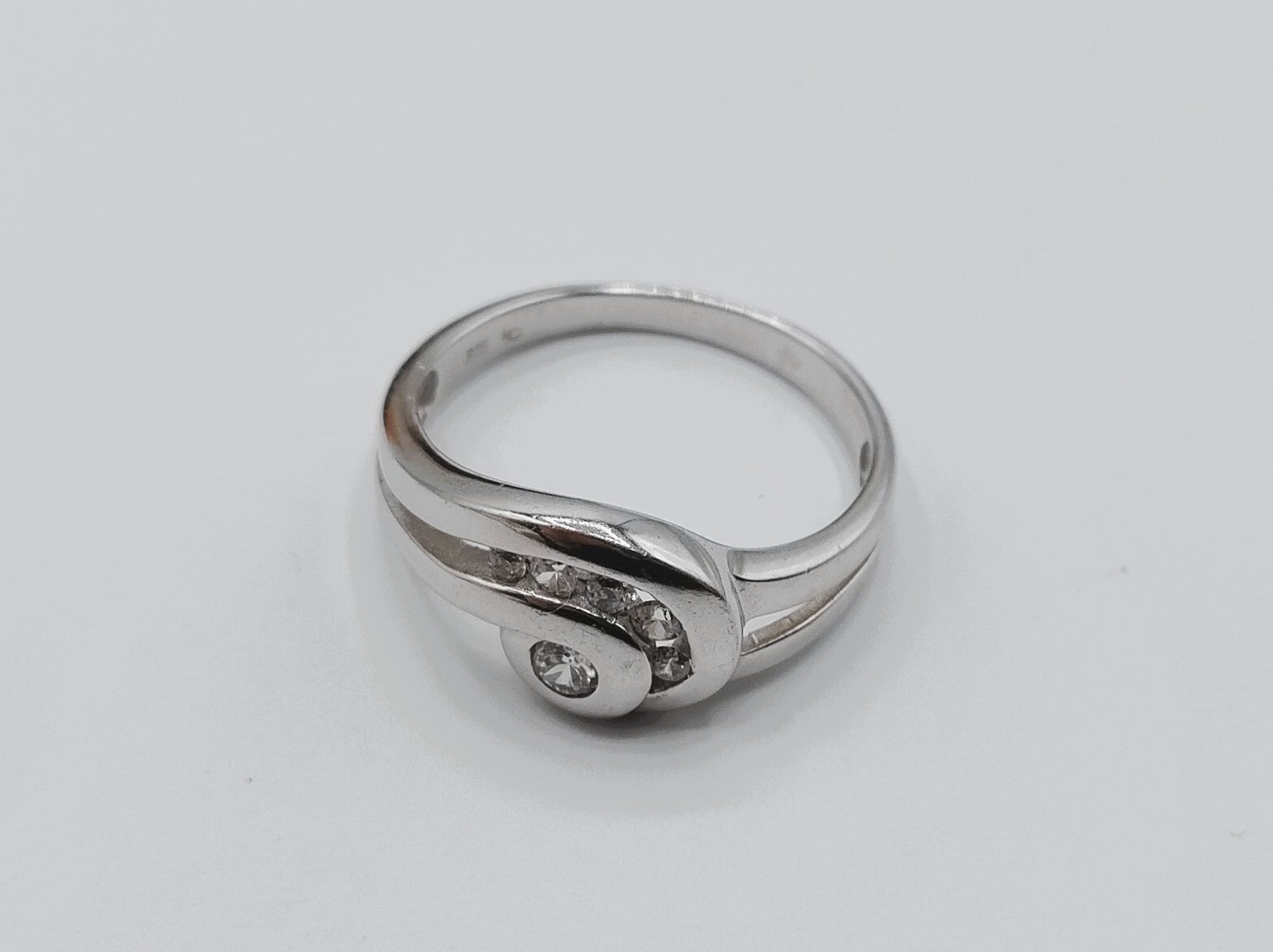 Zilveren ring bezet met 6 zirkonia's in een design zetting.