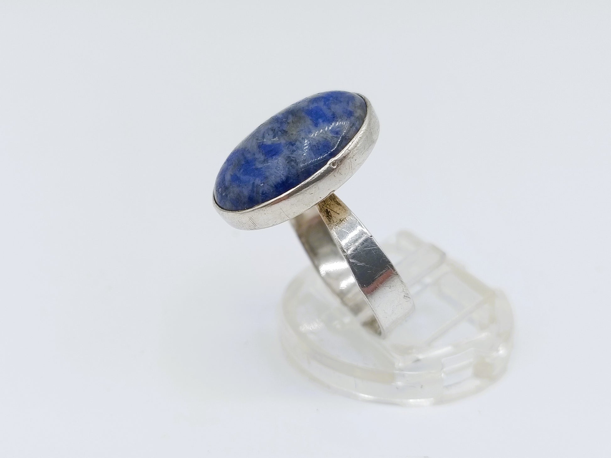 Stijlvolle zilveren ring, bezet met een opvallende blauwe kleursteen met afmetingen van circa 1,2 × 1,7 cm. De heldere kleur van de steen vormt een mooi contrast met het zilver en geeft de ring een tijdloze en elegante uitstraling.