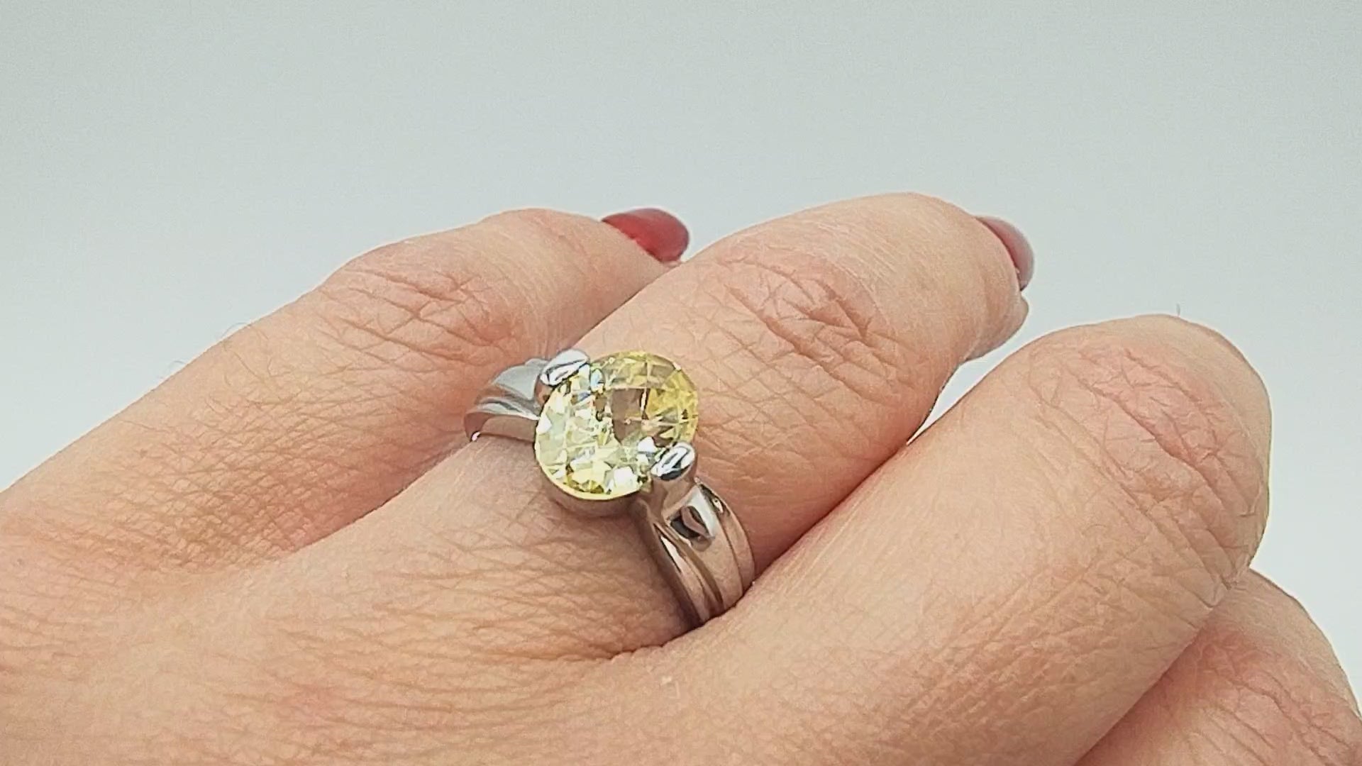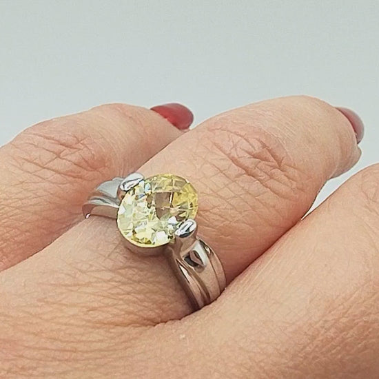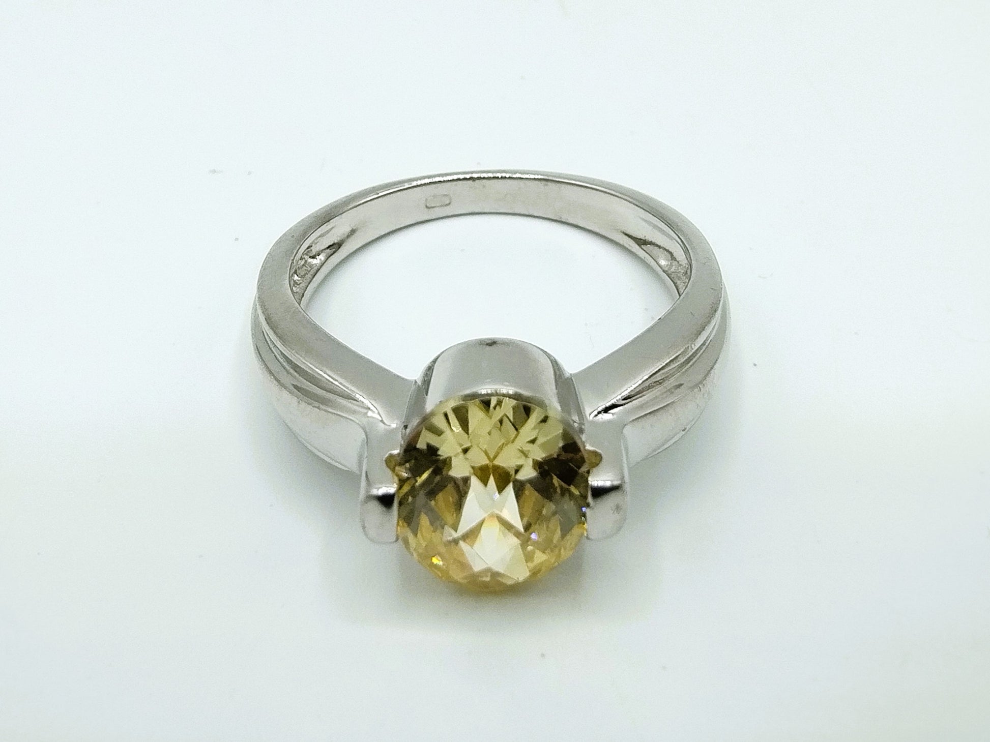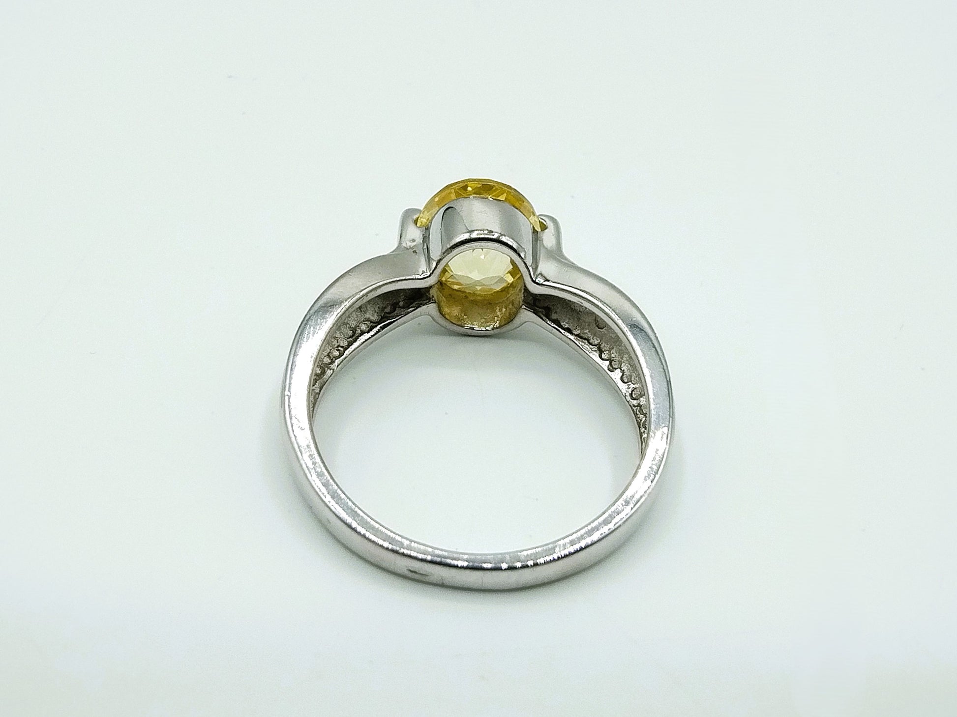 Zilveren ring met een briljant geslepen gele steen. Deze heeft een afmeting van 9 x 7 mm.