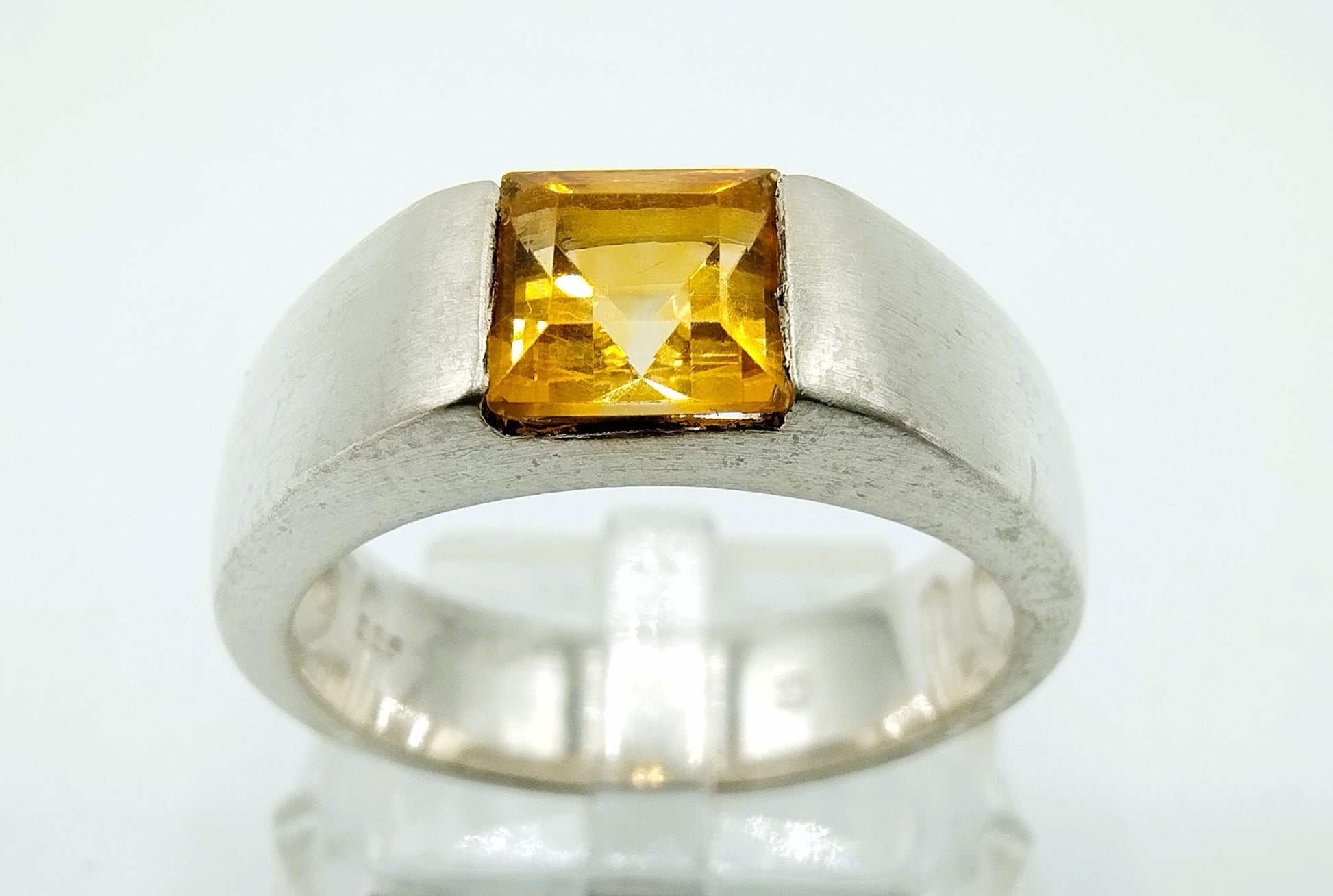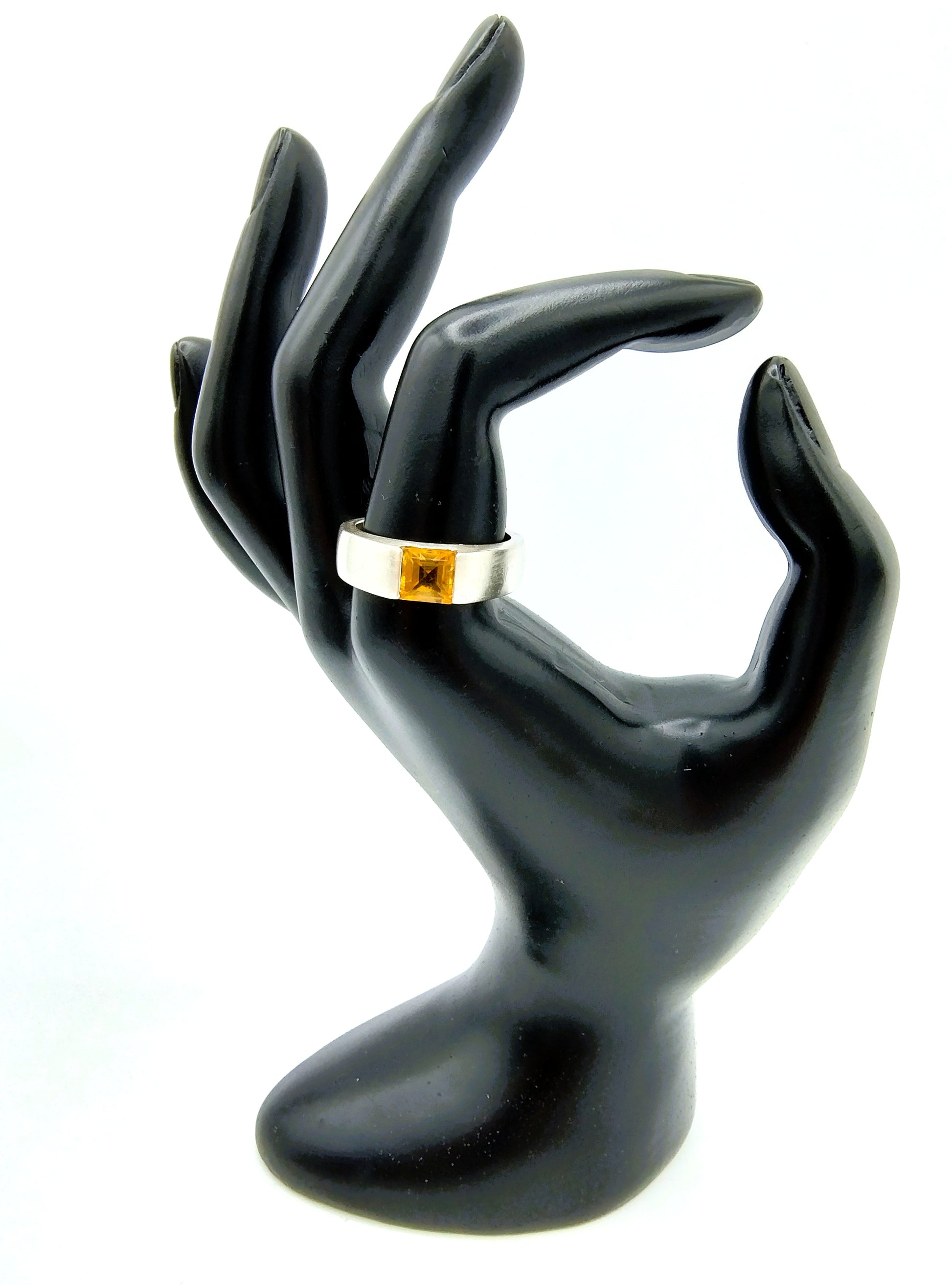 Zilveren ring met princess cut geslepen gele citrien steen.
