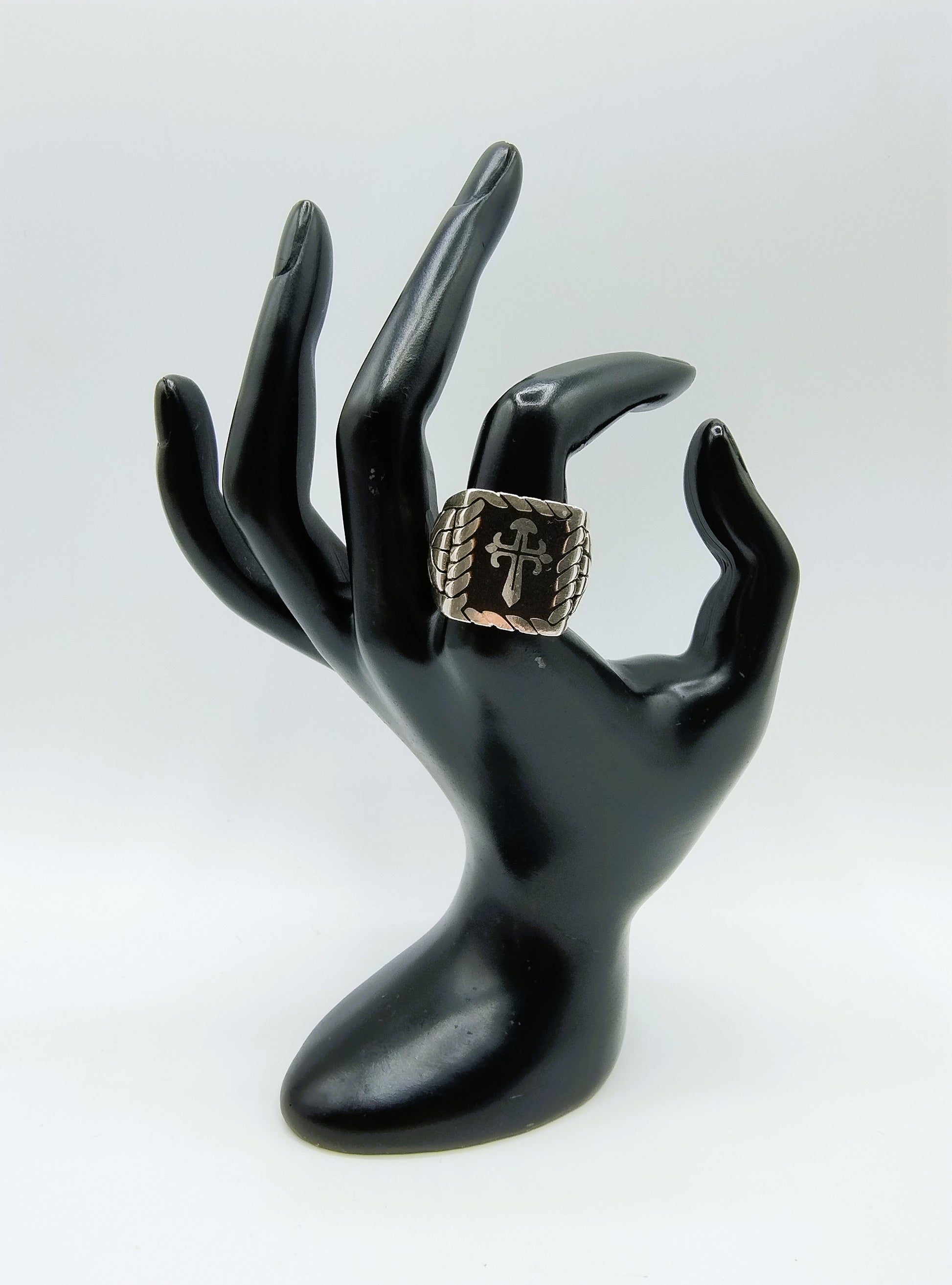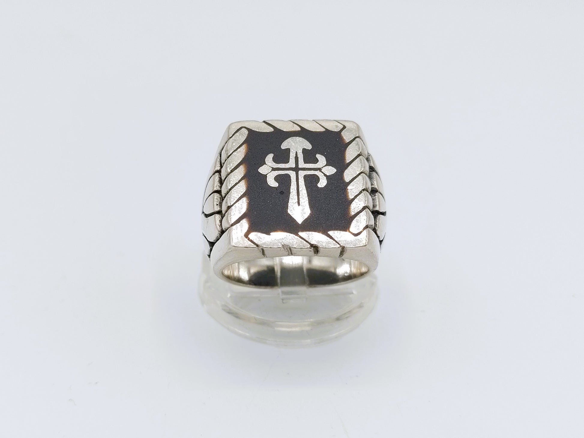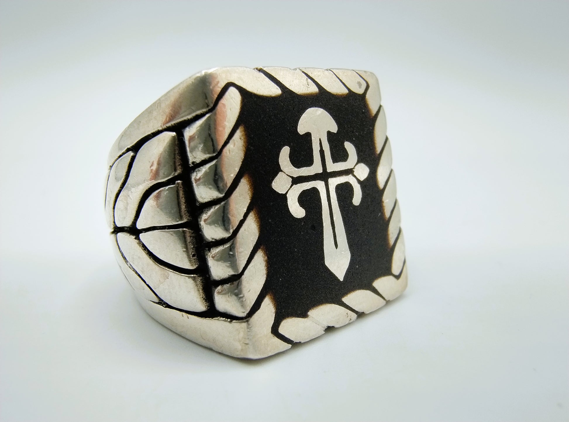 Zilveren ring met daarop een kruis in de vorm van een zwaard. Beide kanten versierd met een Fleur de lis.
