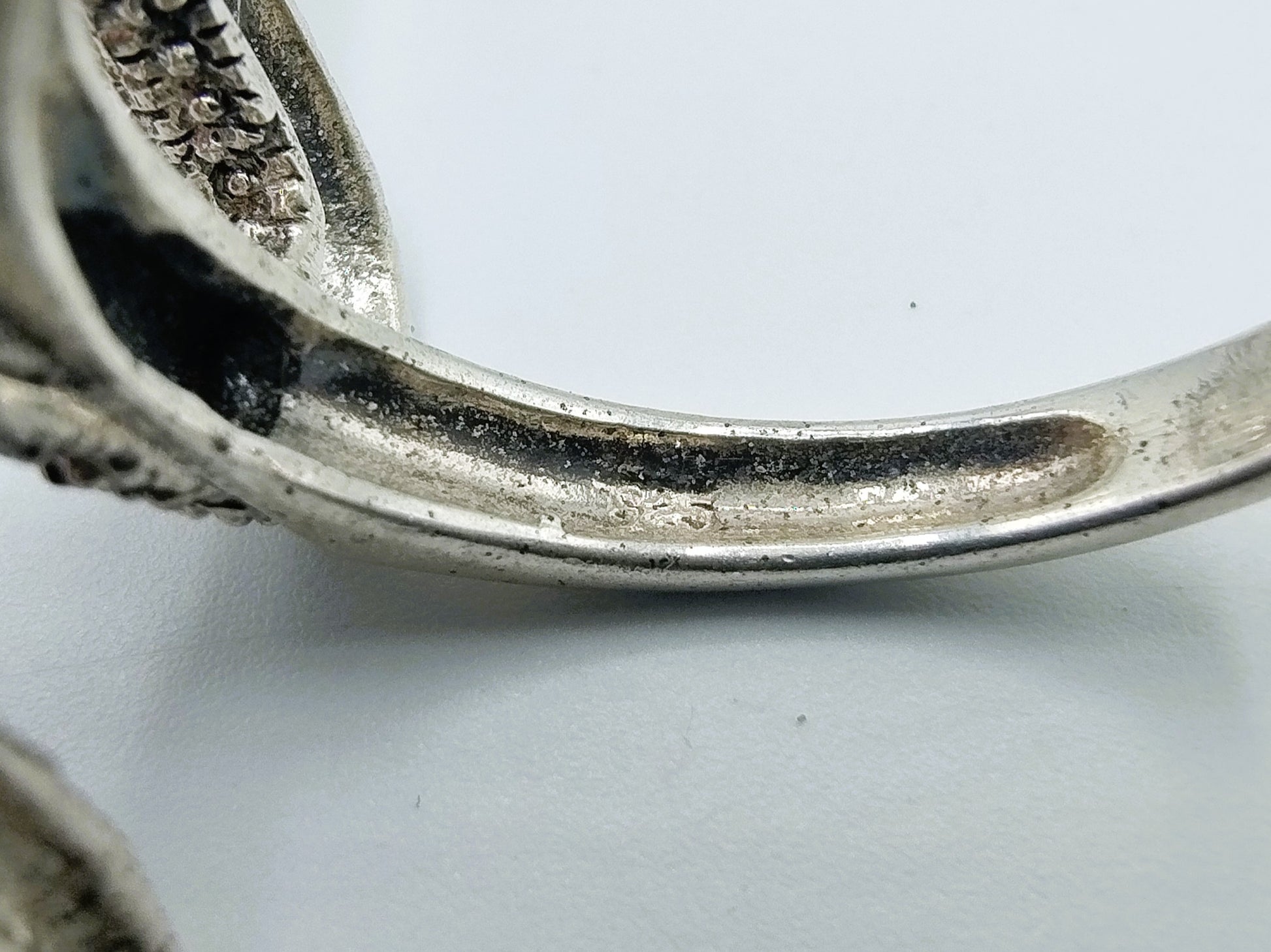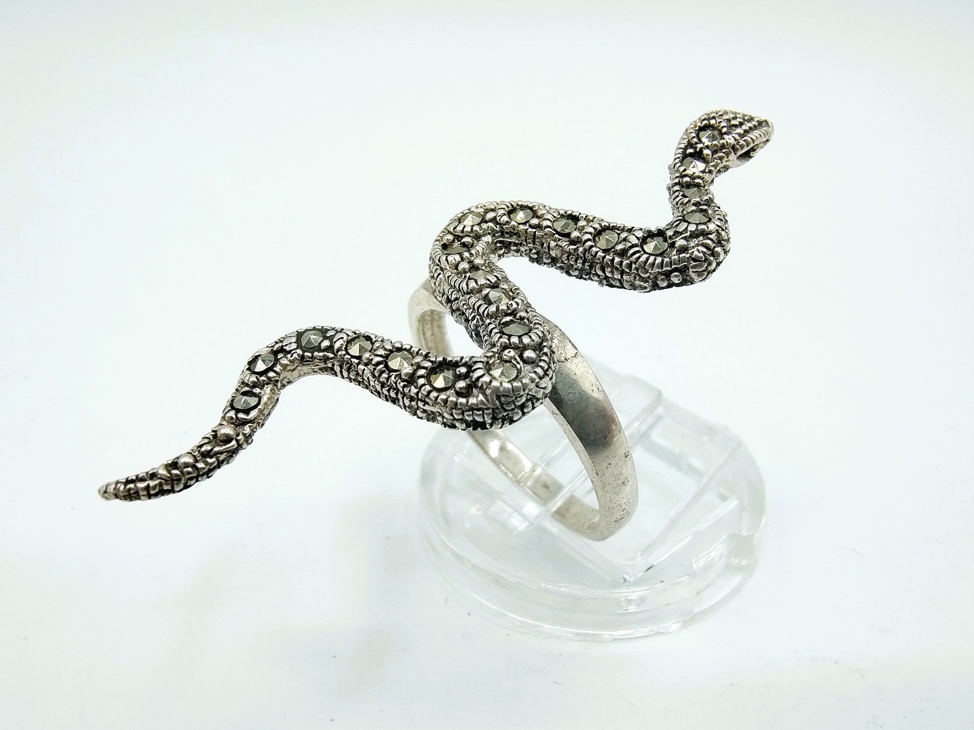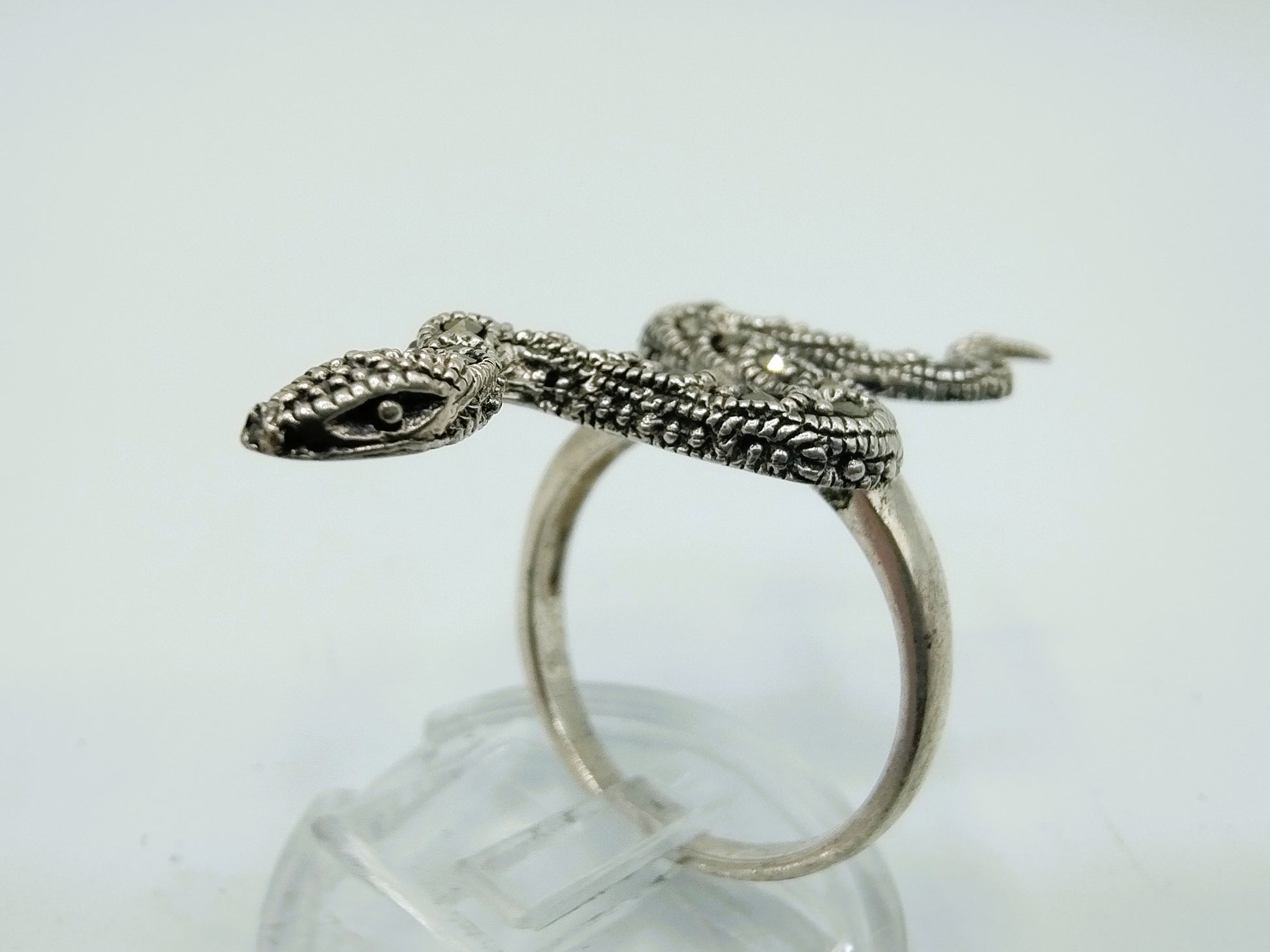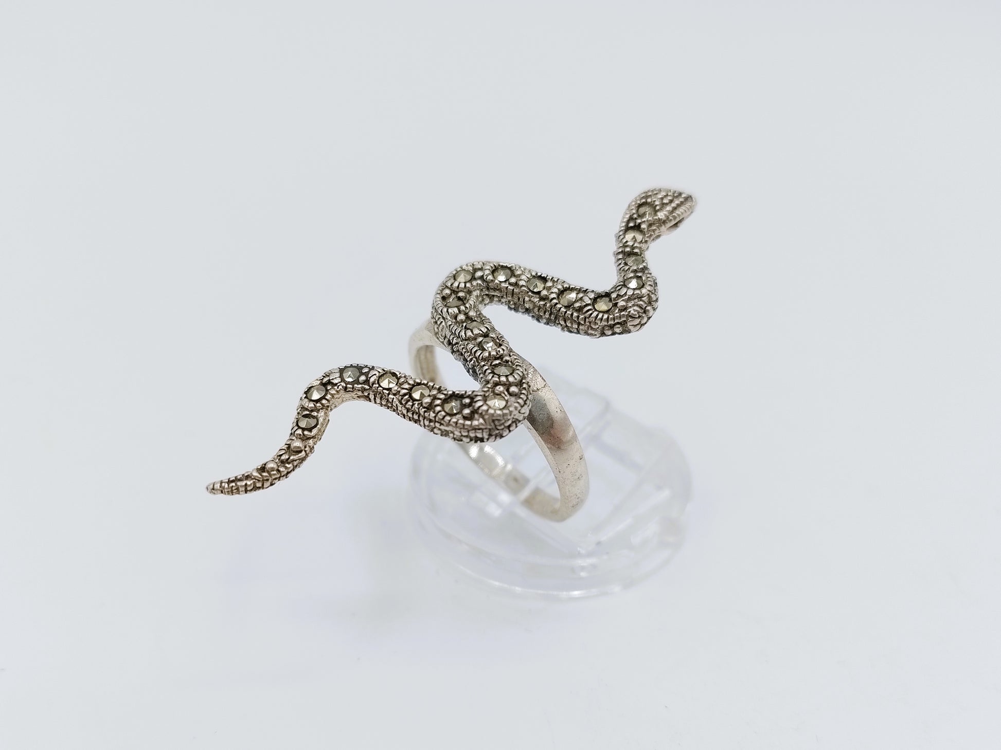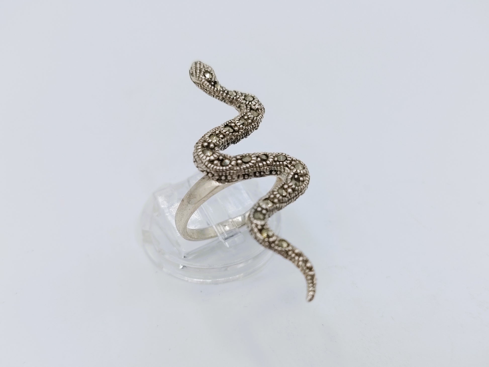 Vintage zilveren ring met daarop een kronkelende slang bezet met markasieten.
