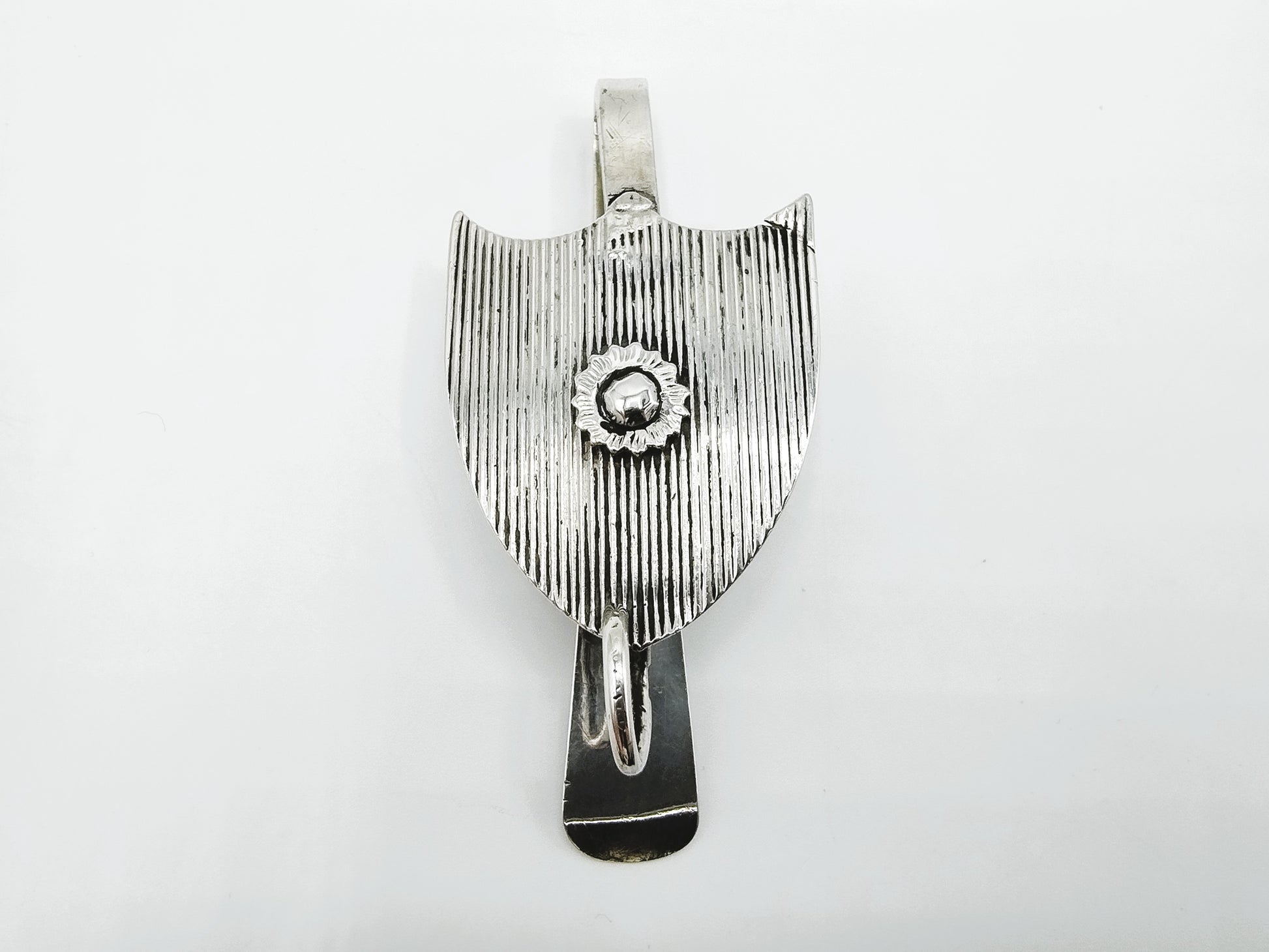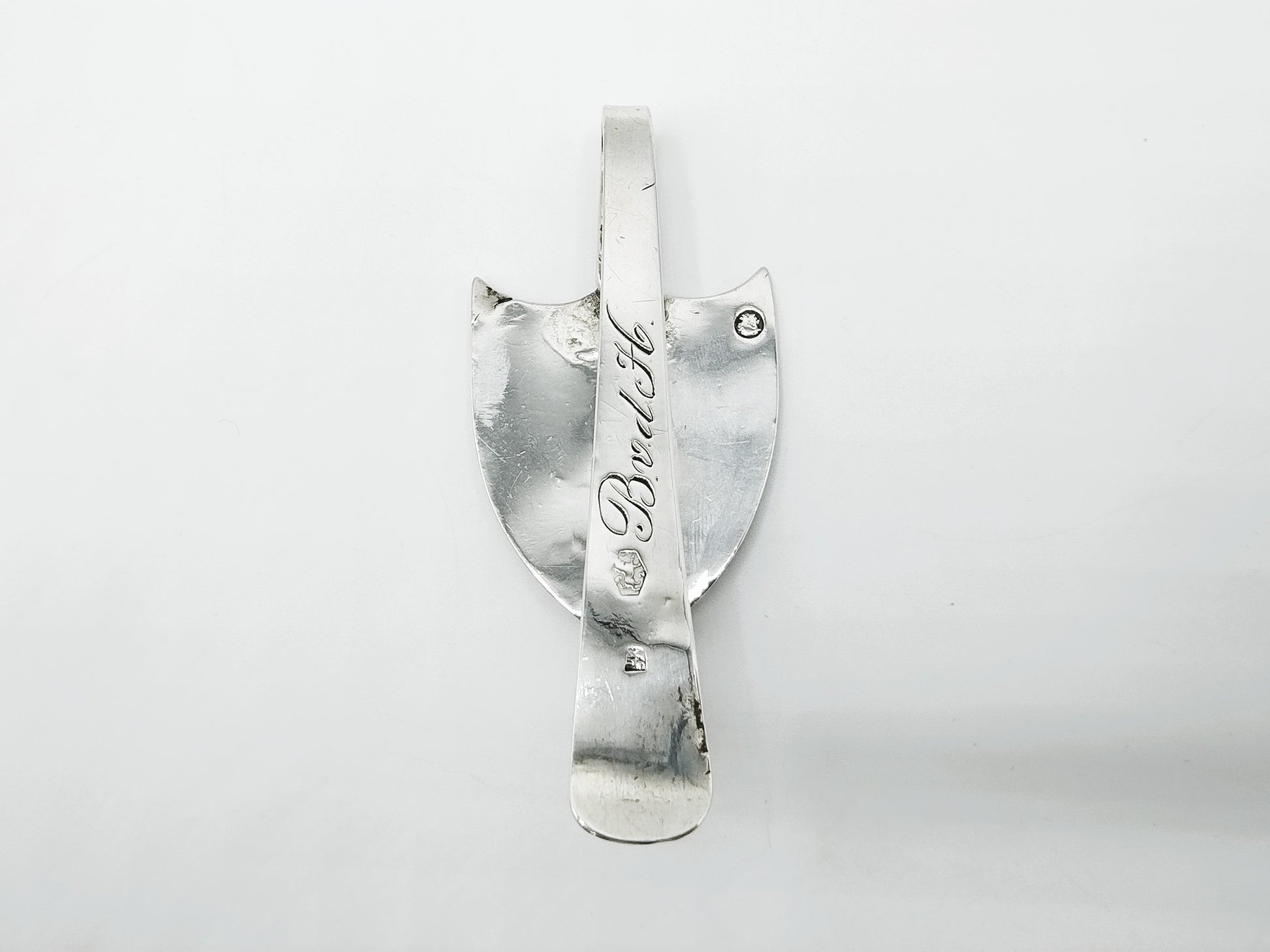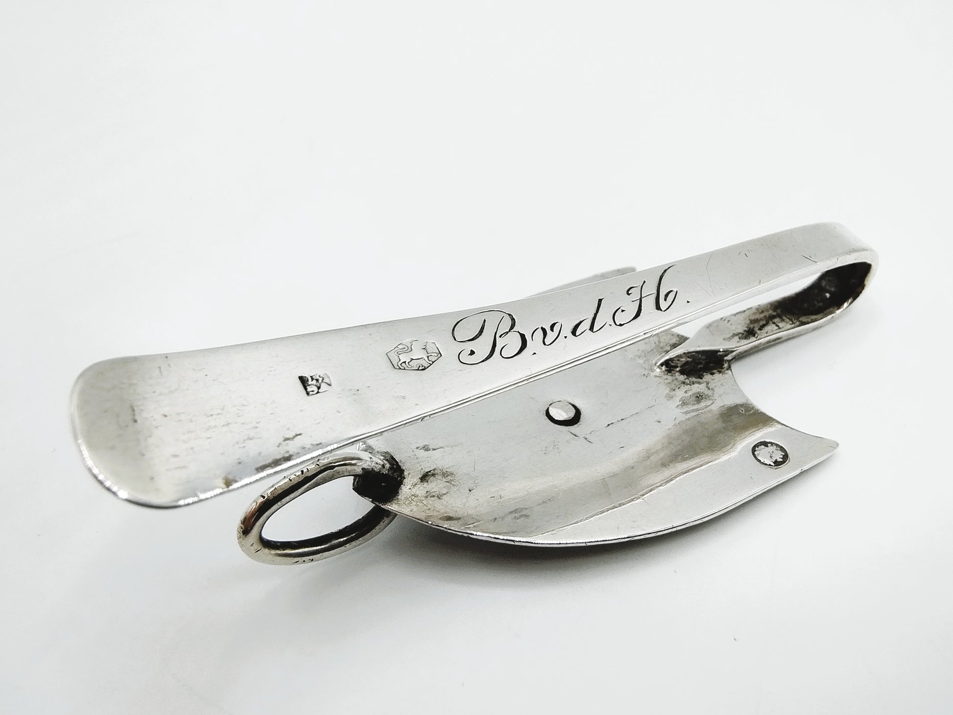 Zilveren rok- of tashaak gemaakt door de zilversmid P. van Gelderen uit Schoonhoven. Hij was werkzaam van 1837 tot 1853.