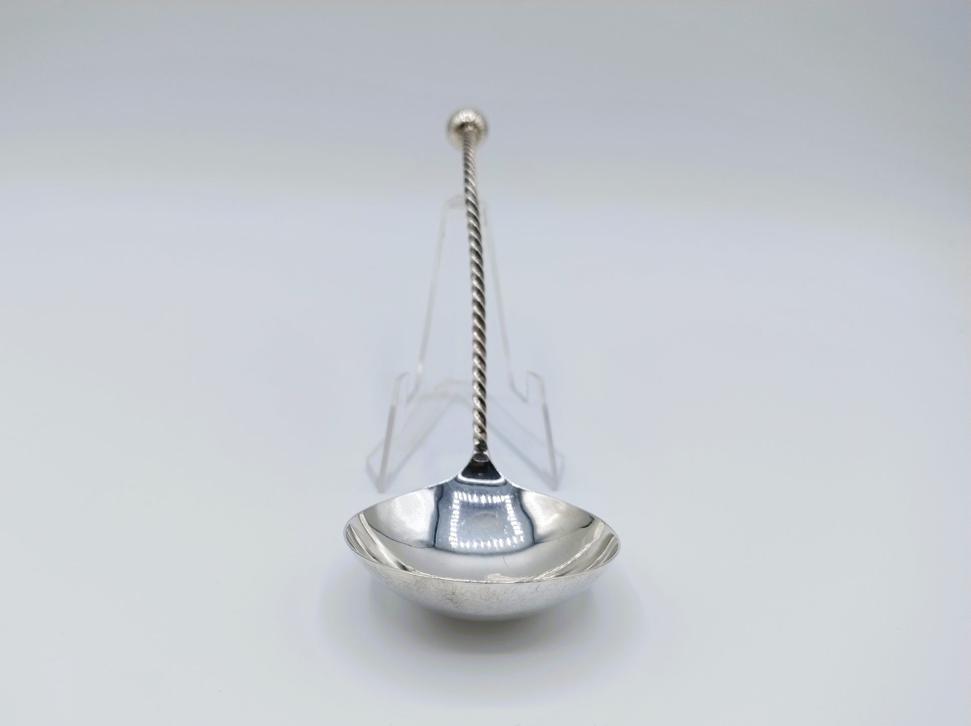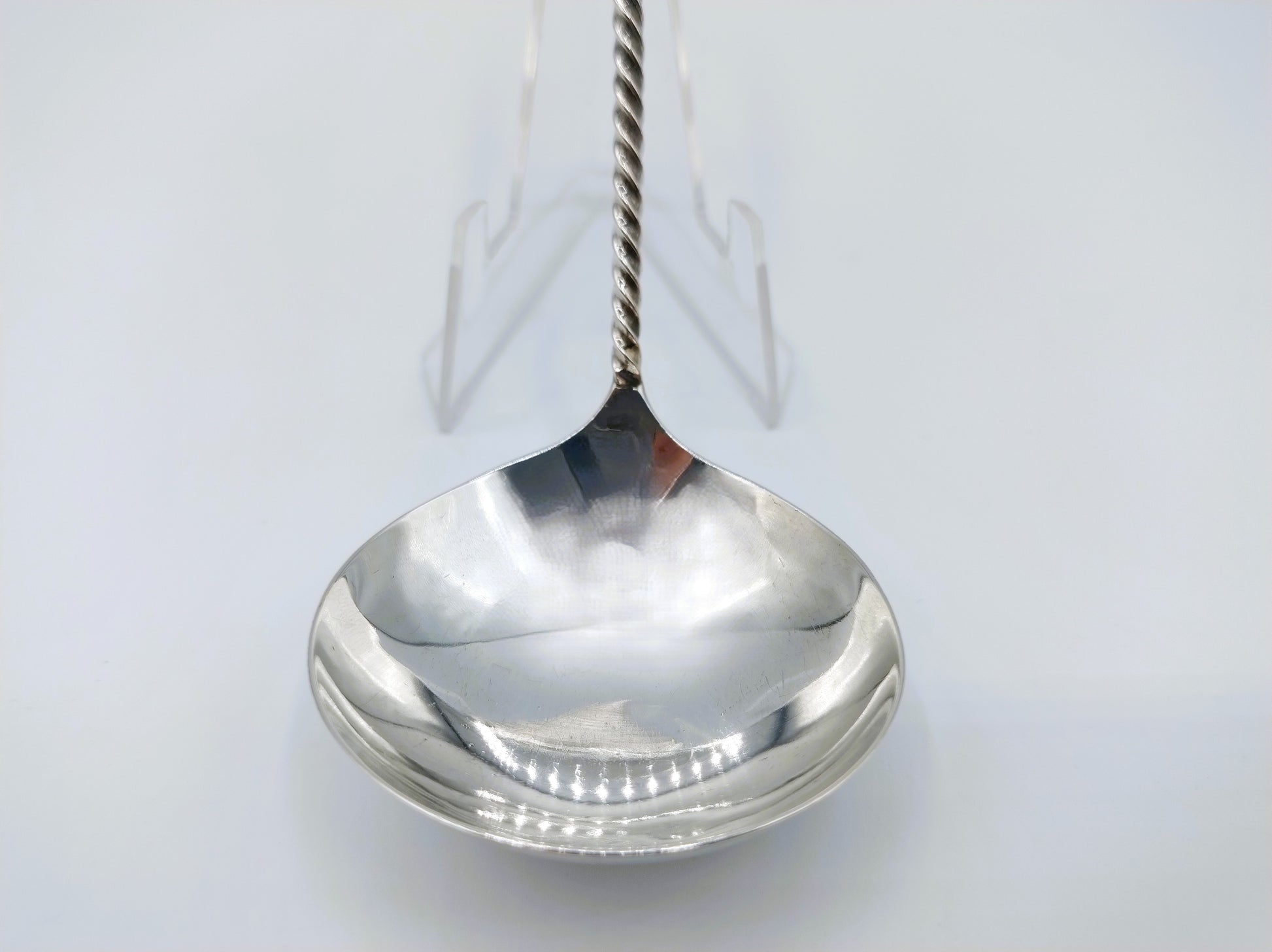 Zilveren roomlepel, gemaakt door de zilversmid Wed. J.H. van der Meulen te Joure werkzaam van 1958 tot 1984.