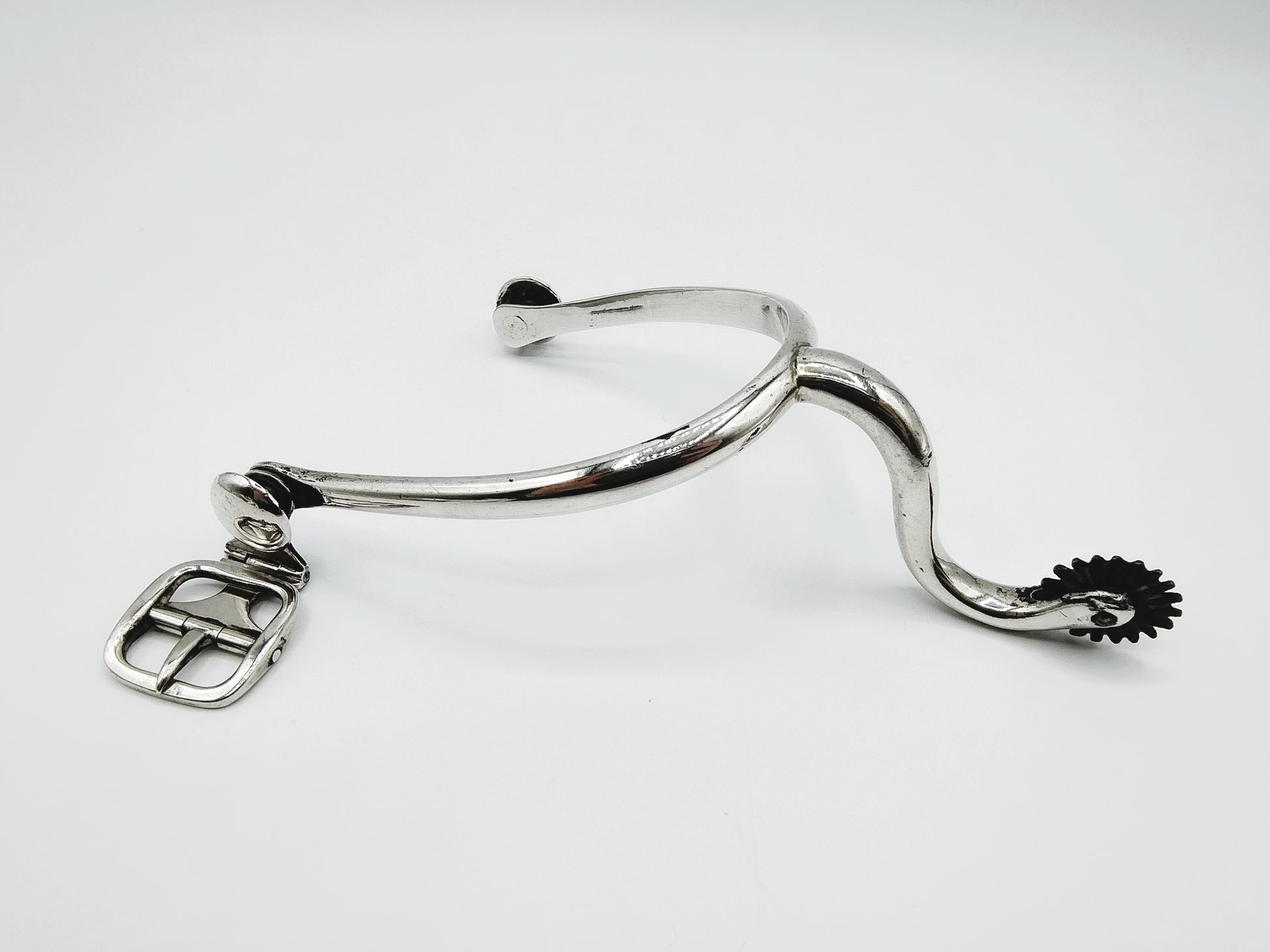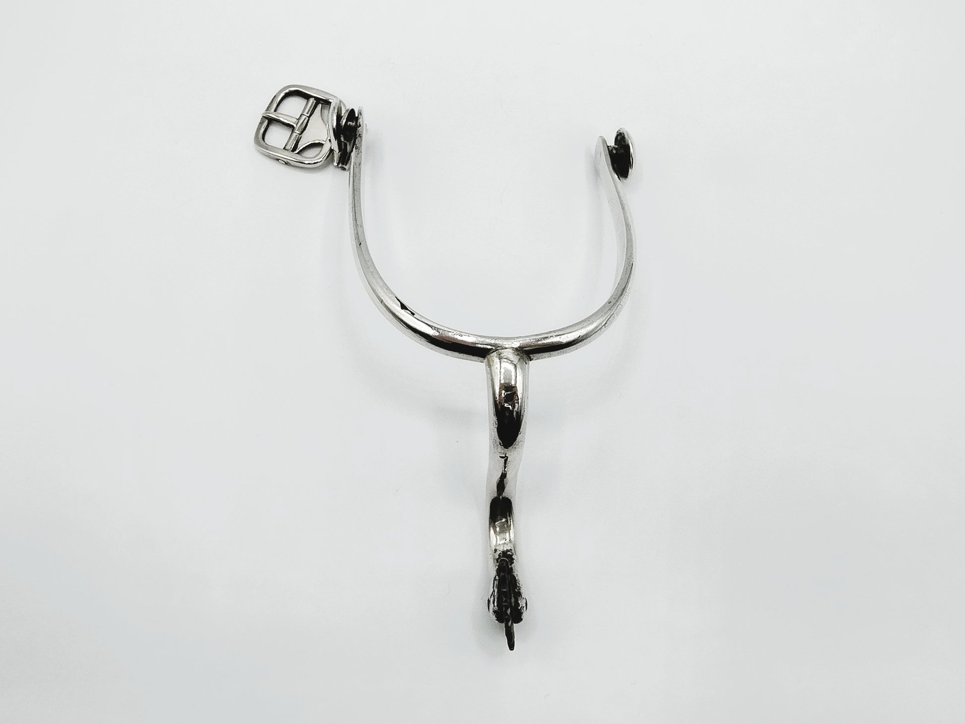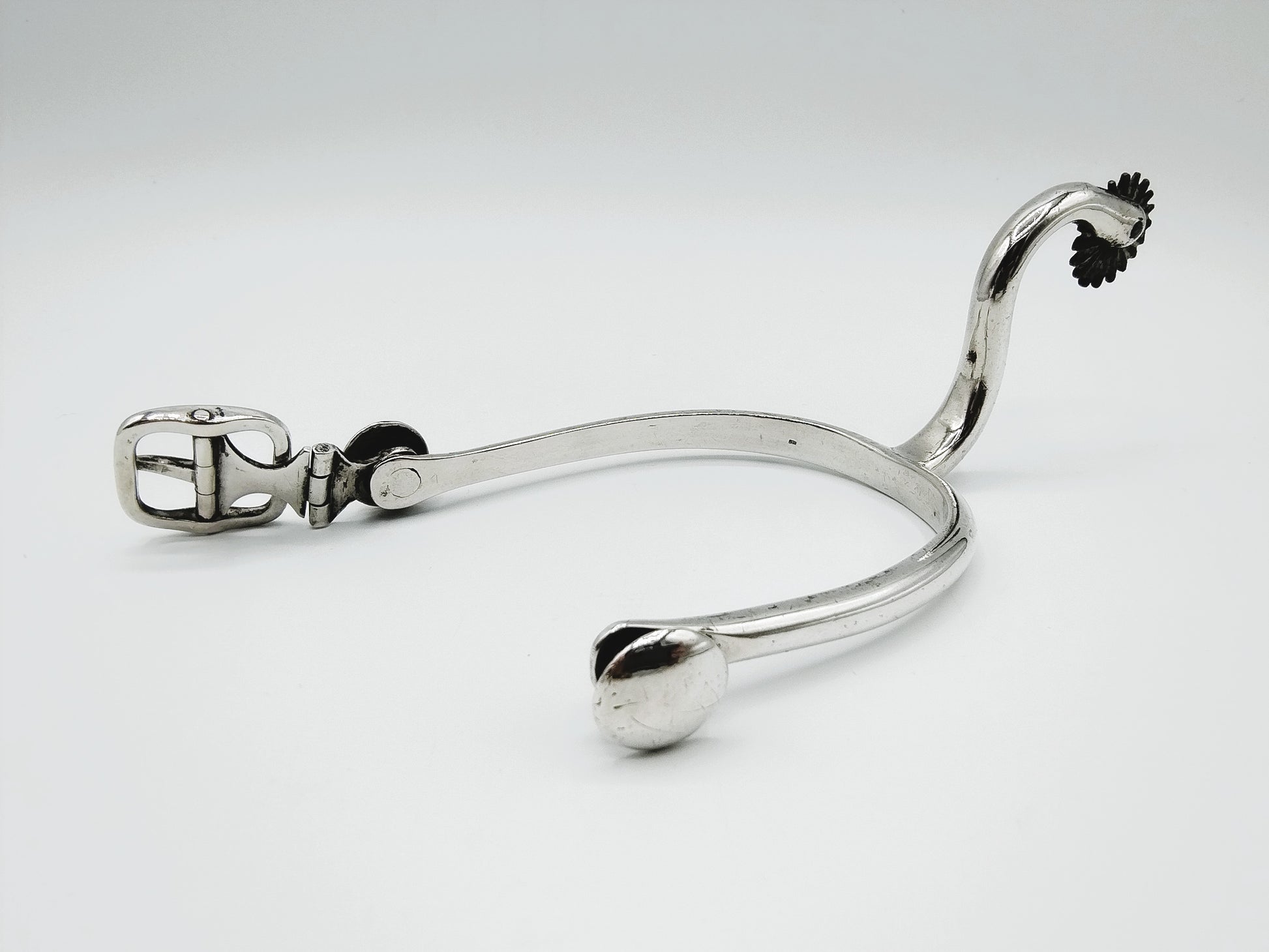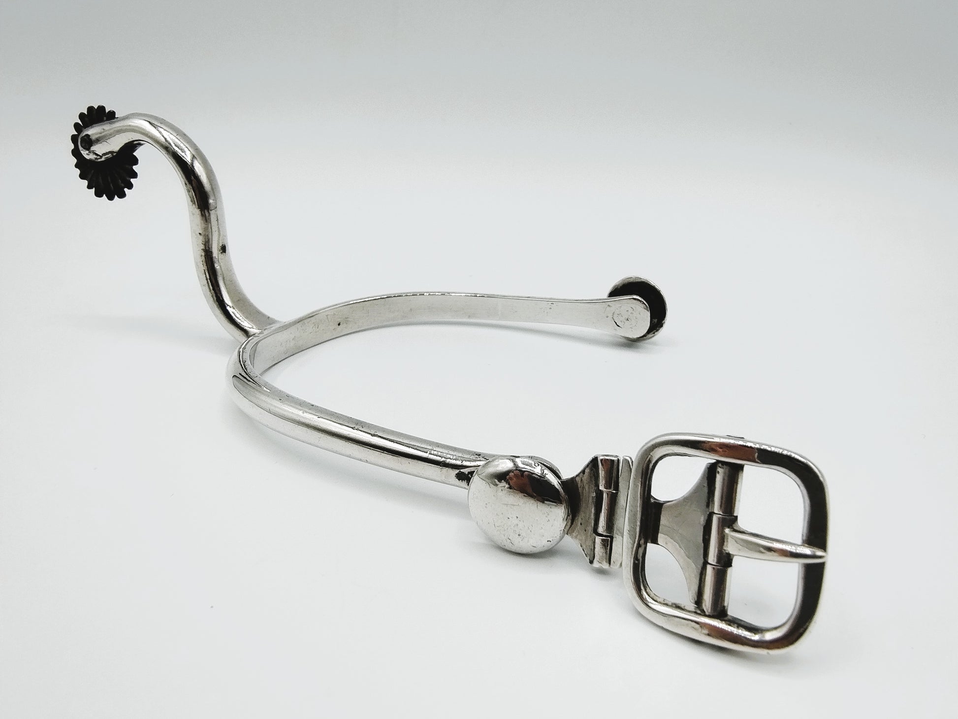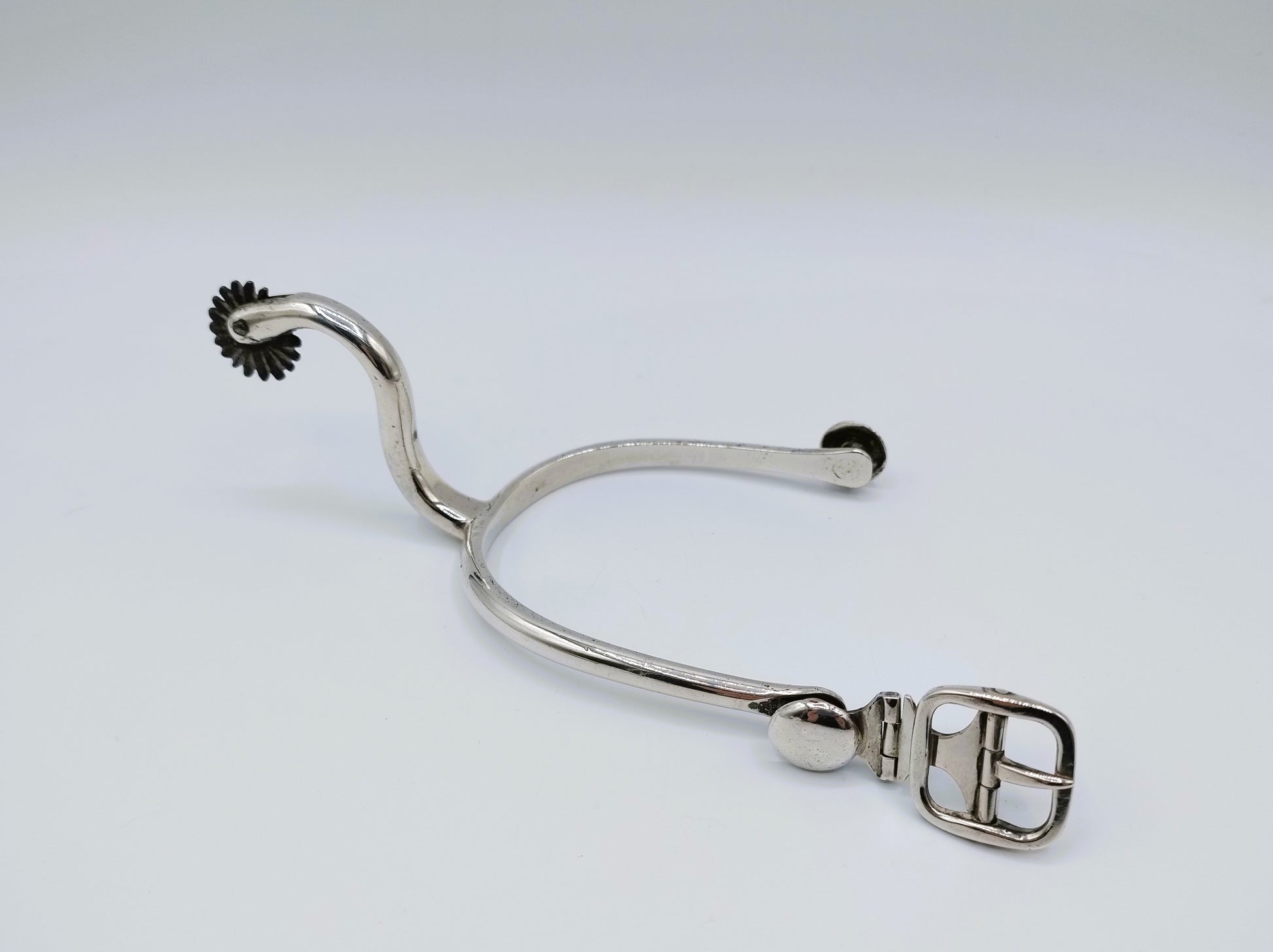 Zilveren ruiterspoor met gesp en draaiend wieltje.