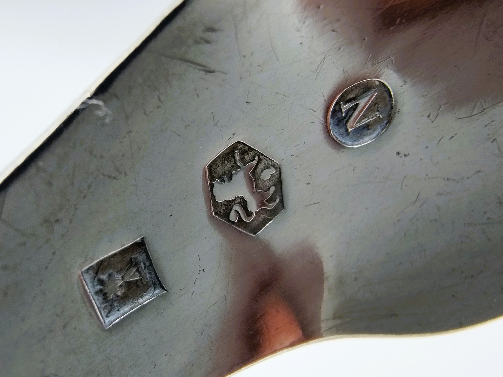 De lepel is gekeurd met zijn meesterkeur V*, tweede gehaltekeur, minervakopje en jaarletter N voor 1847.