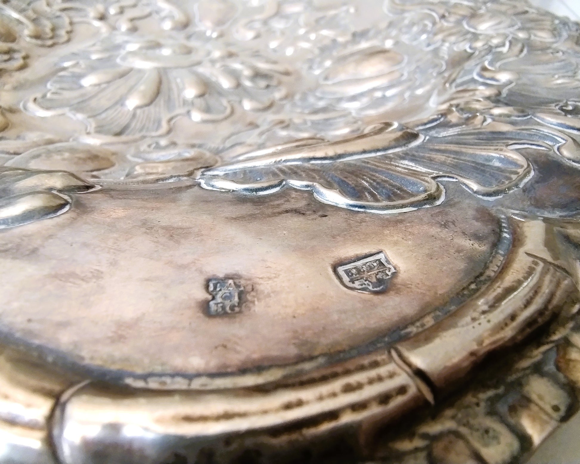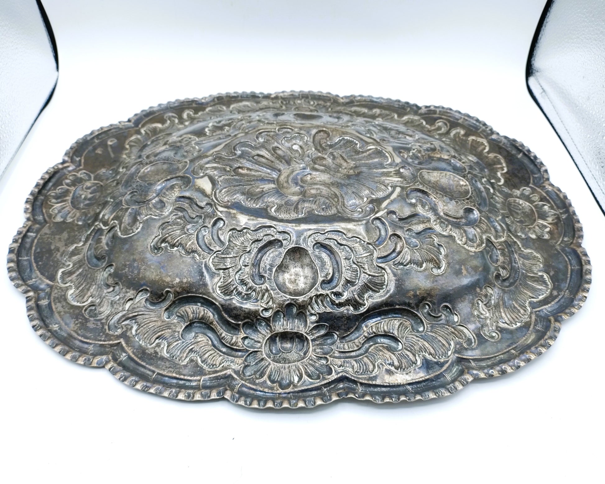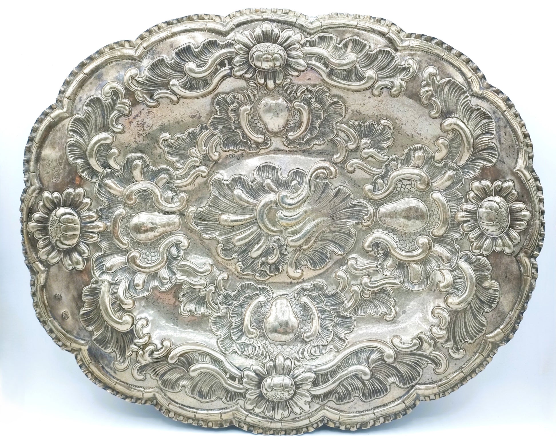 Kapitale 18e eeuwse zilveren schaal of presenteerbord gemaakt door de zilversmid Francisco A. González de Lanciego uit Logroño. (506). De schaal is met de hand uitgehamerd en vertoont een fraai decor van bloemen en krullen.