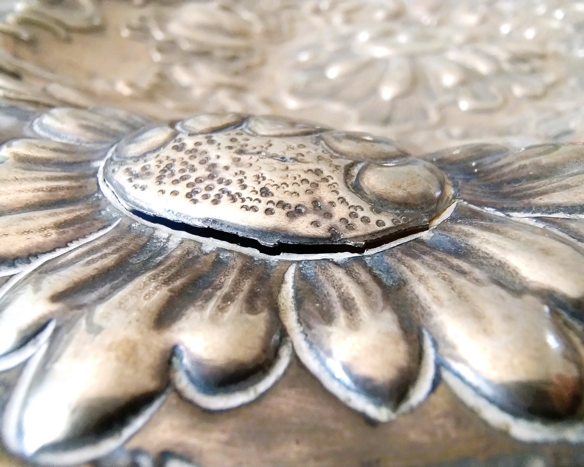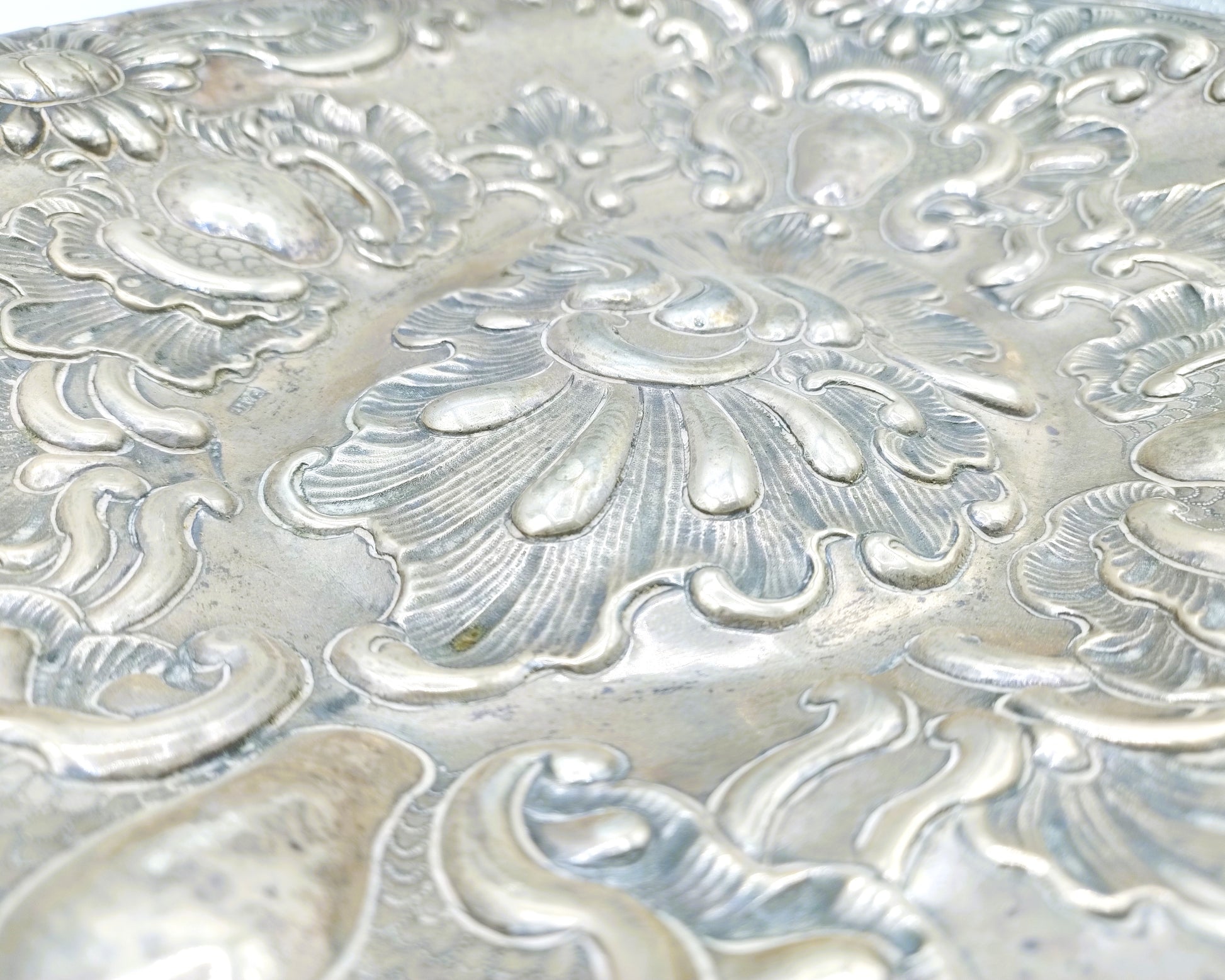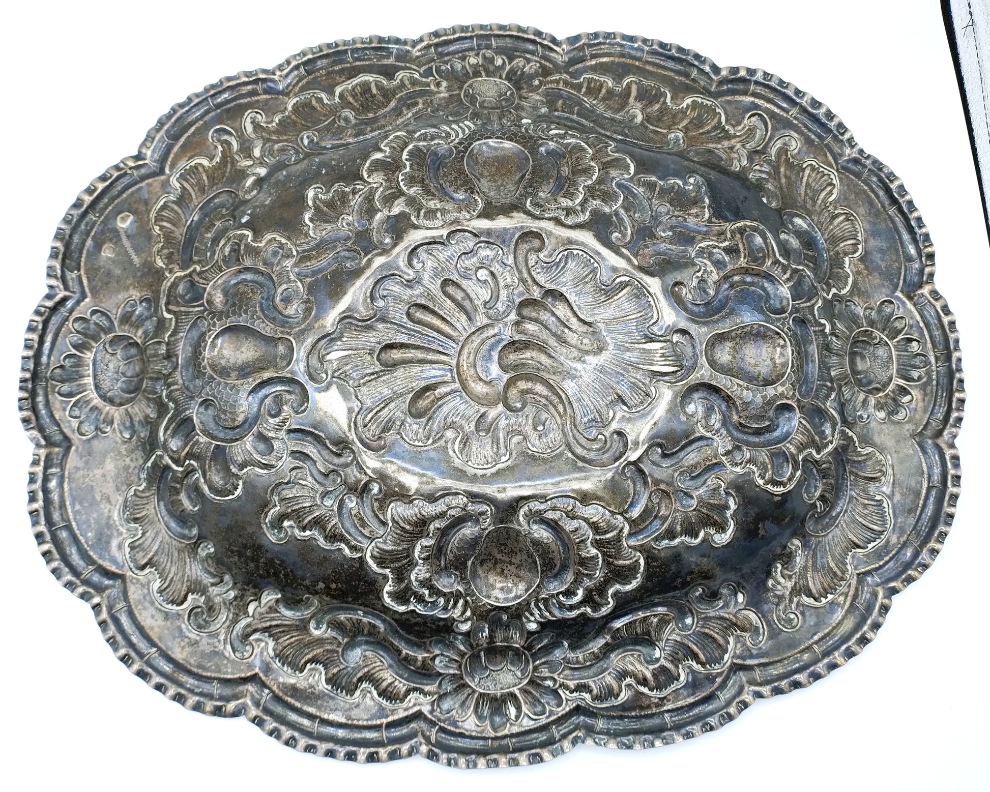 Kapitale 18e eeuwse zilveren schaal of presenteerbord gemaakt door de zilversmid Francisco A. González de Lanciego uit Logroño. (506). De schaal is met de hand uitgehamerd en vertoont een fraai decor van bloemen en krullen.