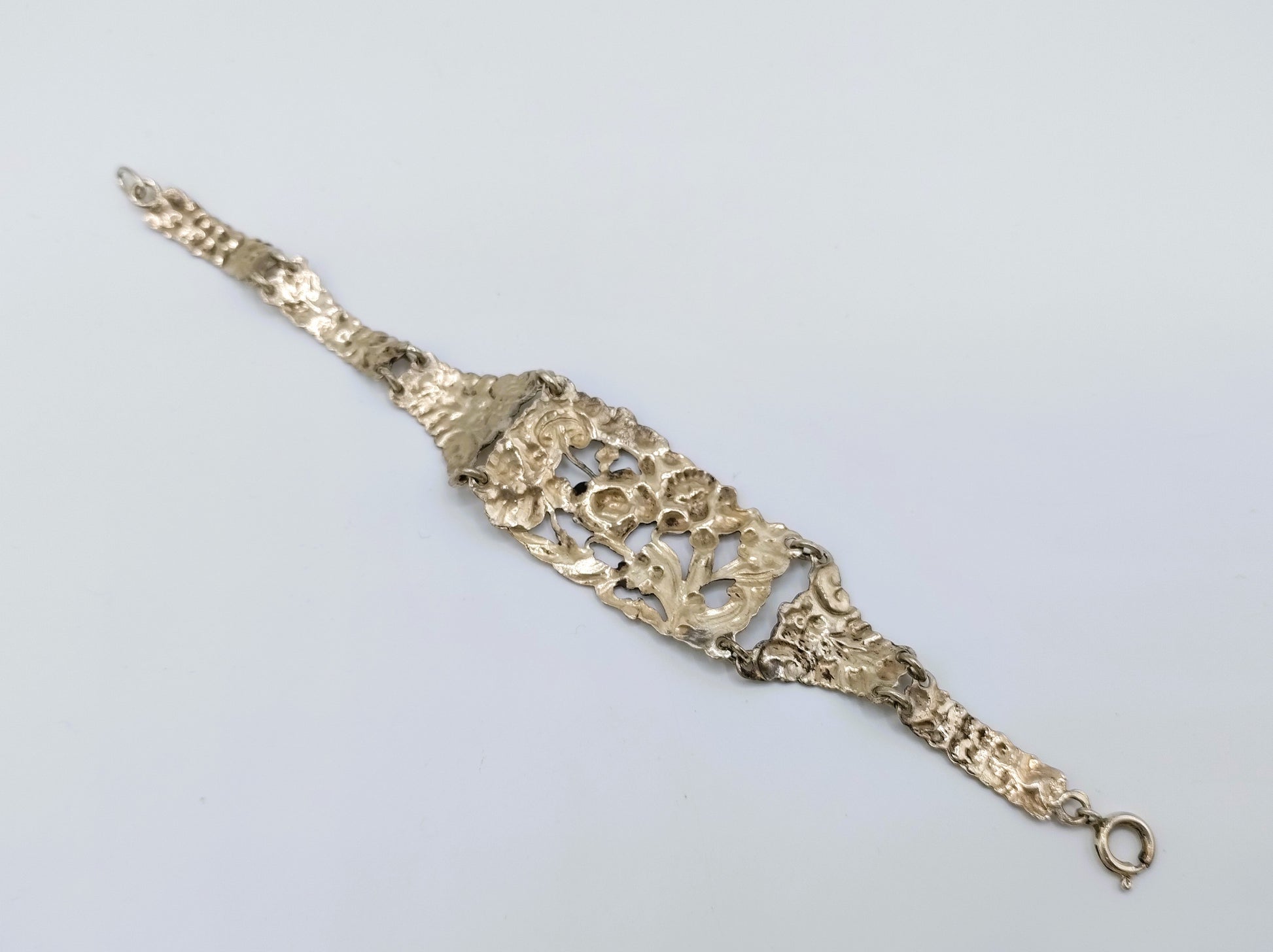Zilveren armband voorzien van 6 schakels met krul- en bloemmotieven.