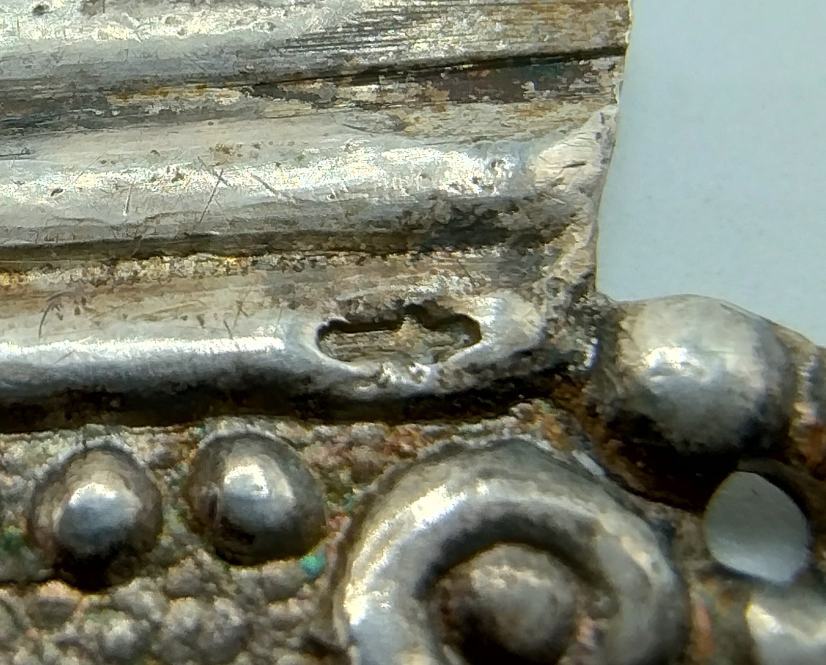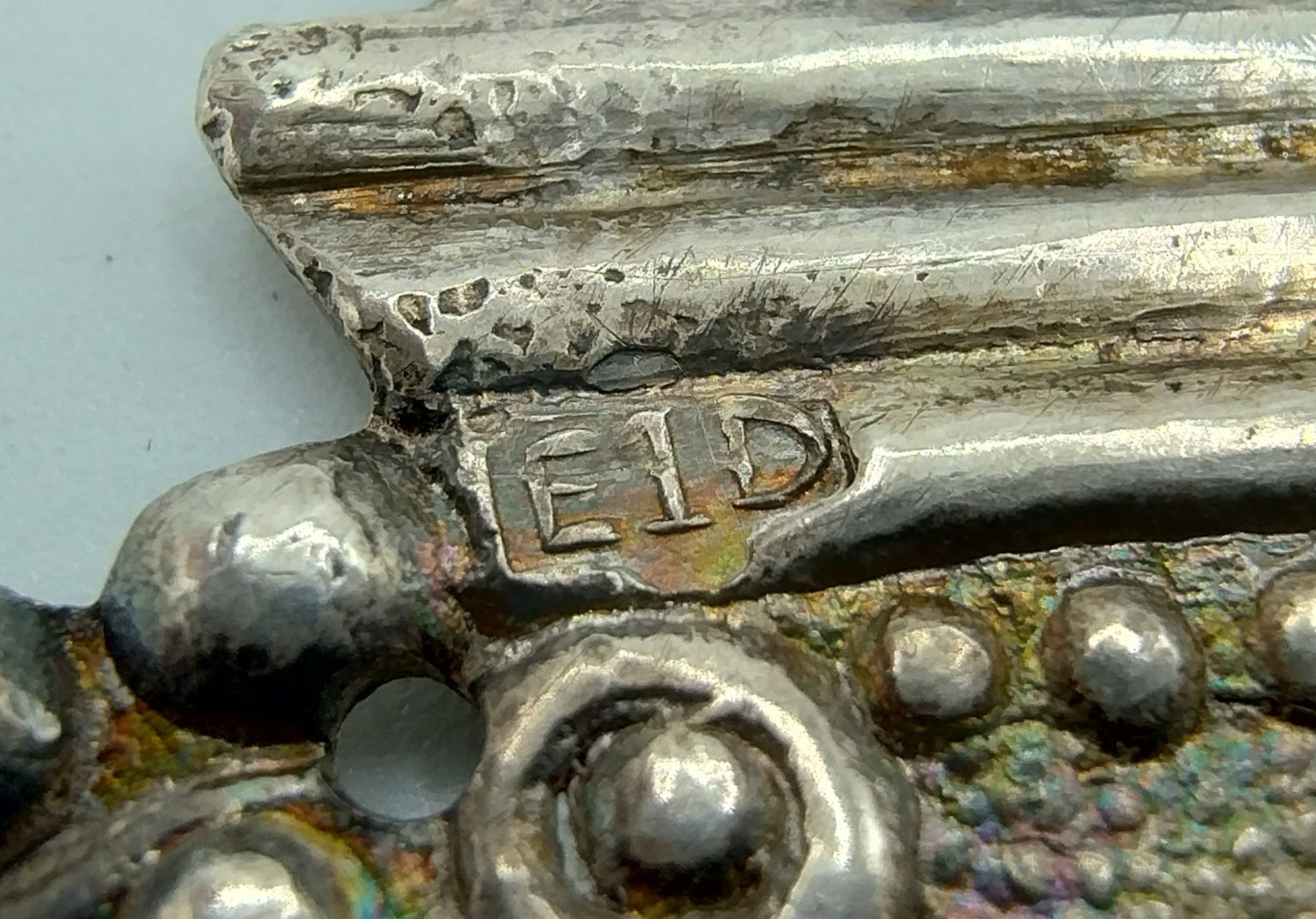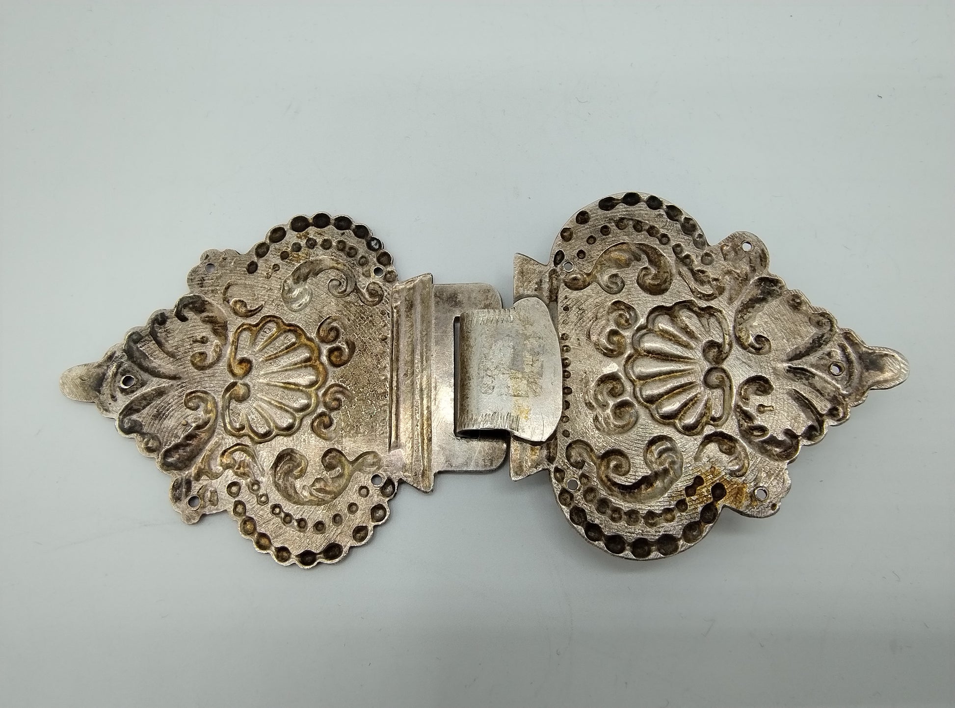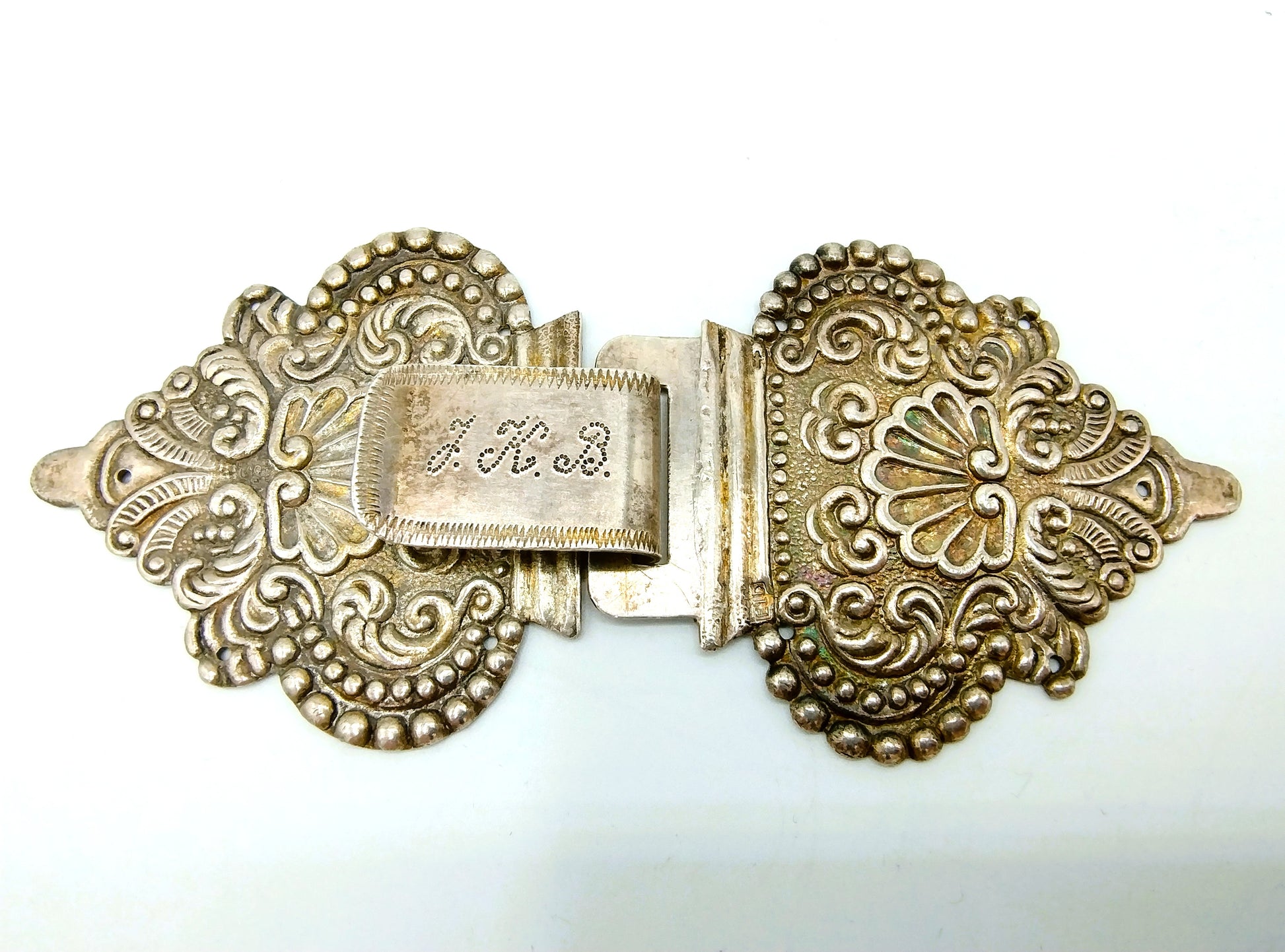 Zilveren schorteslot gemaakt door E. Drost uit Meppel / Staphorst werkzaam van 1900-1928.