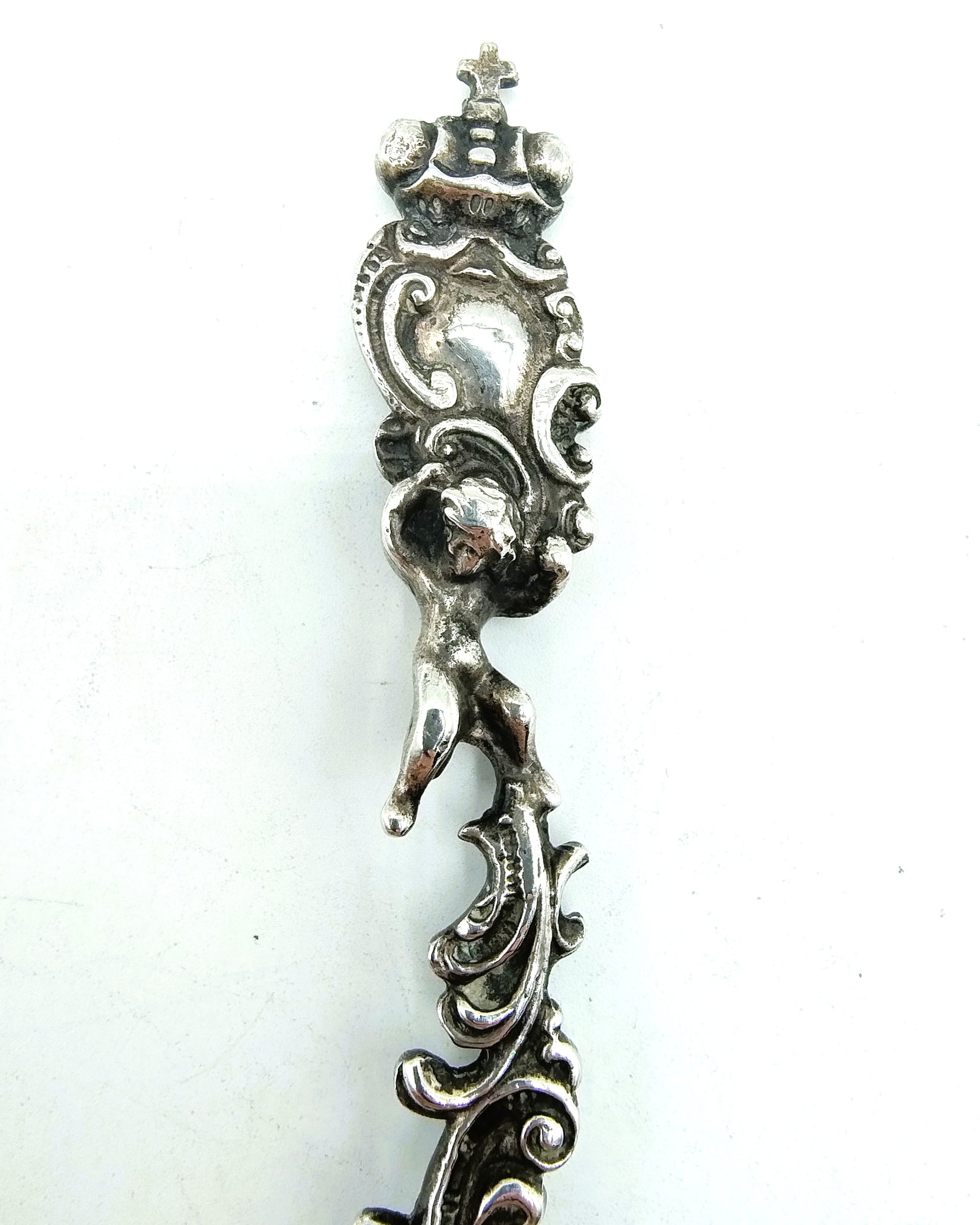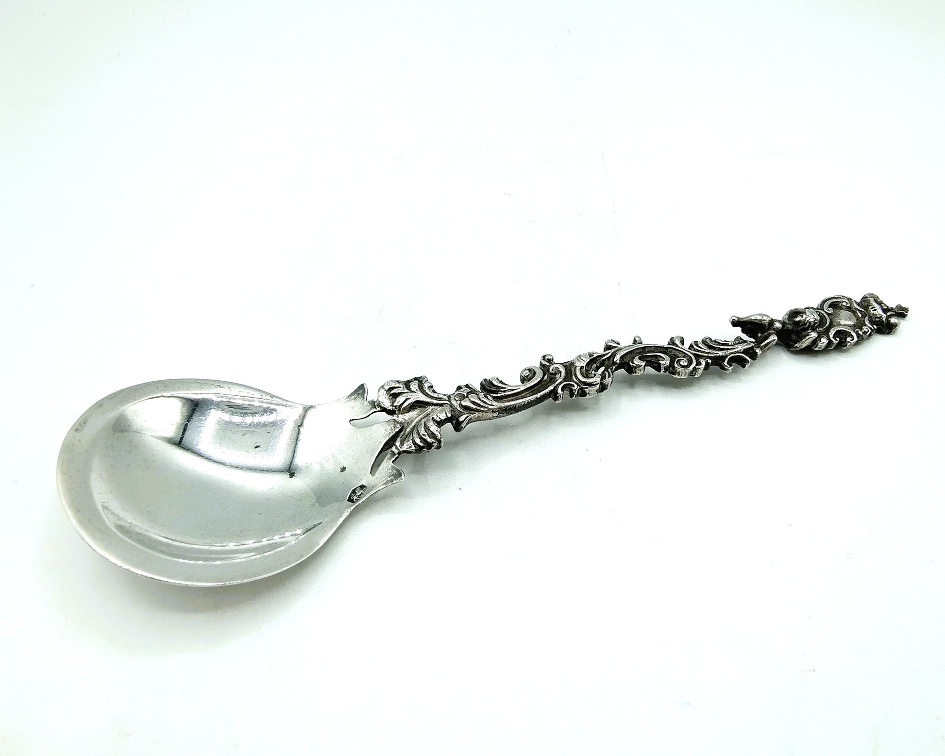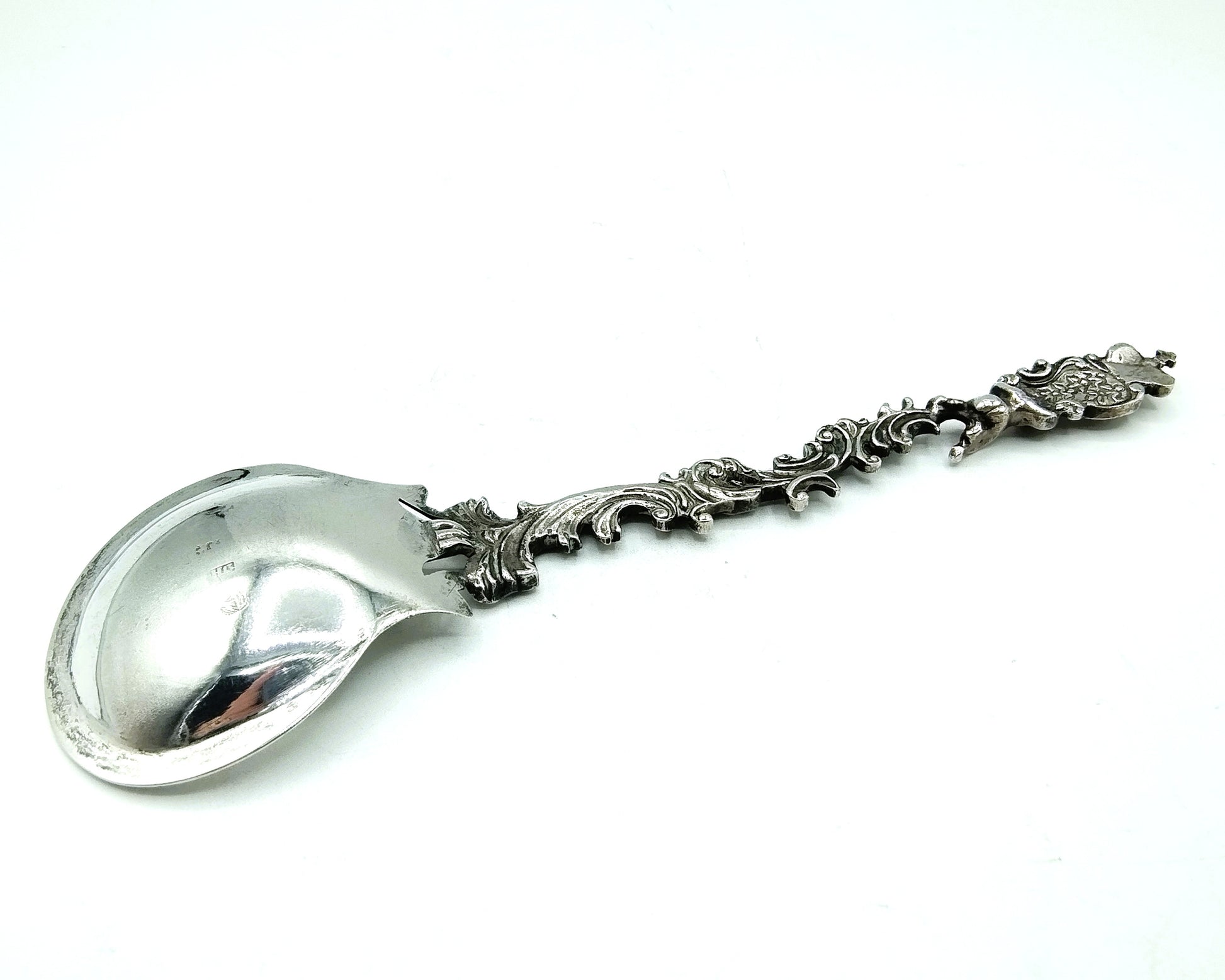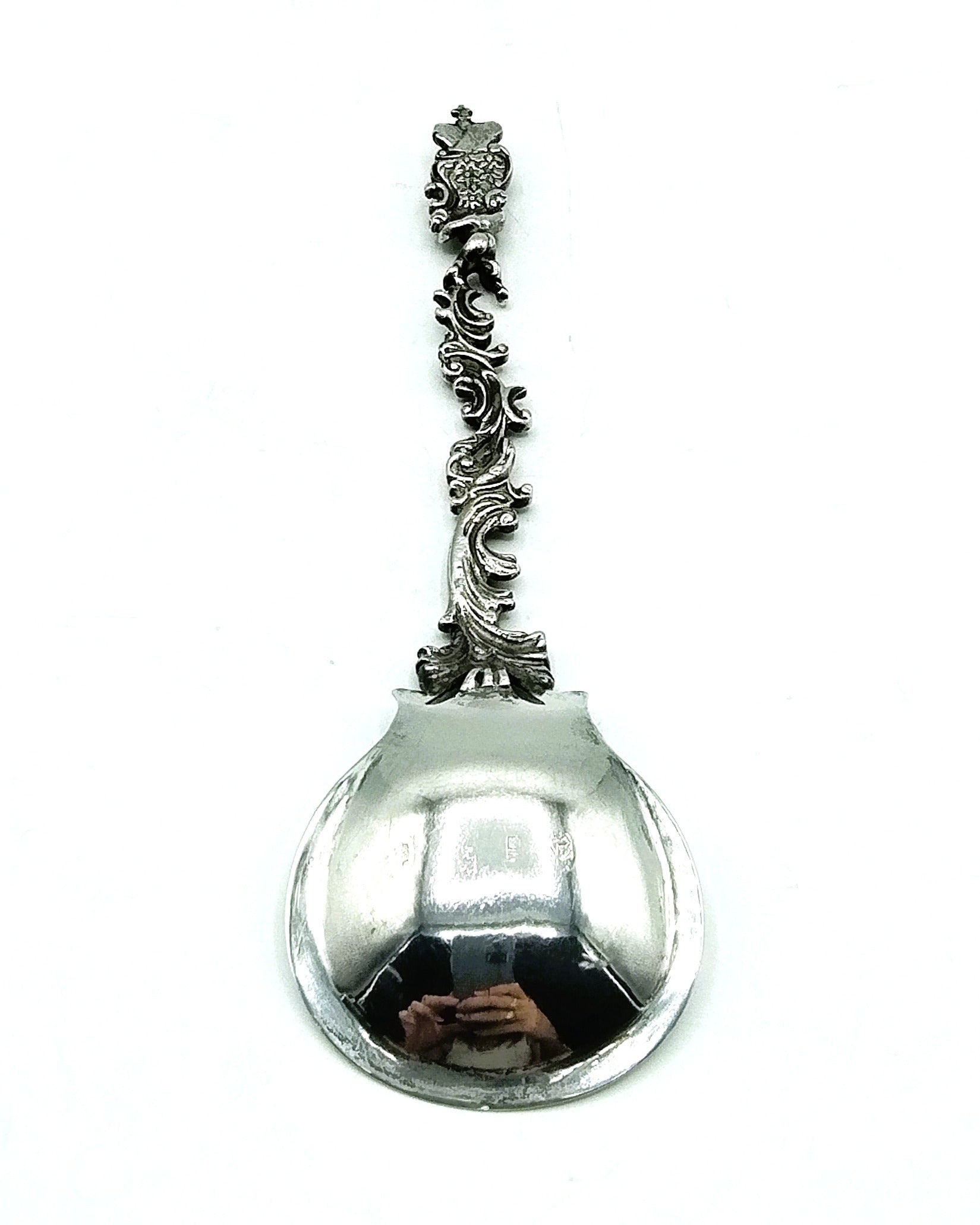 Zilveren sierlepel met krulmotieven en een bekroning van een mensfiguur die een schild met kroon draagt.